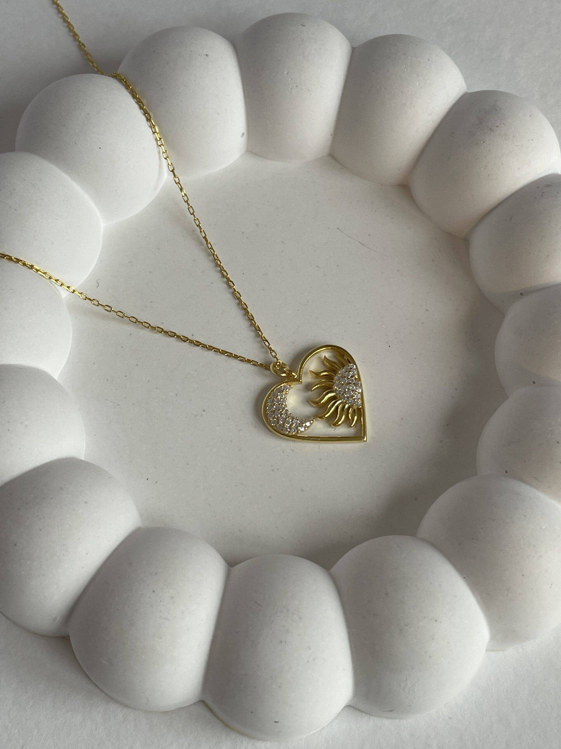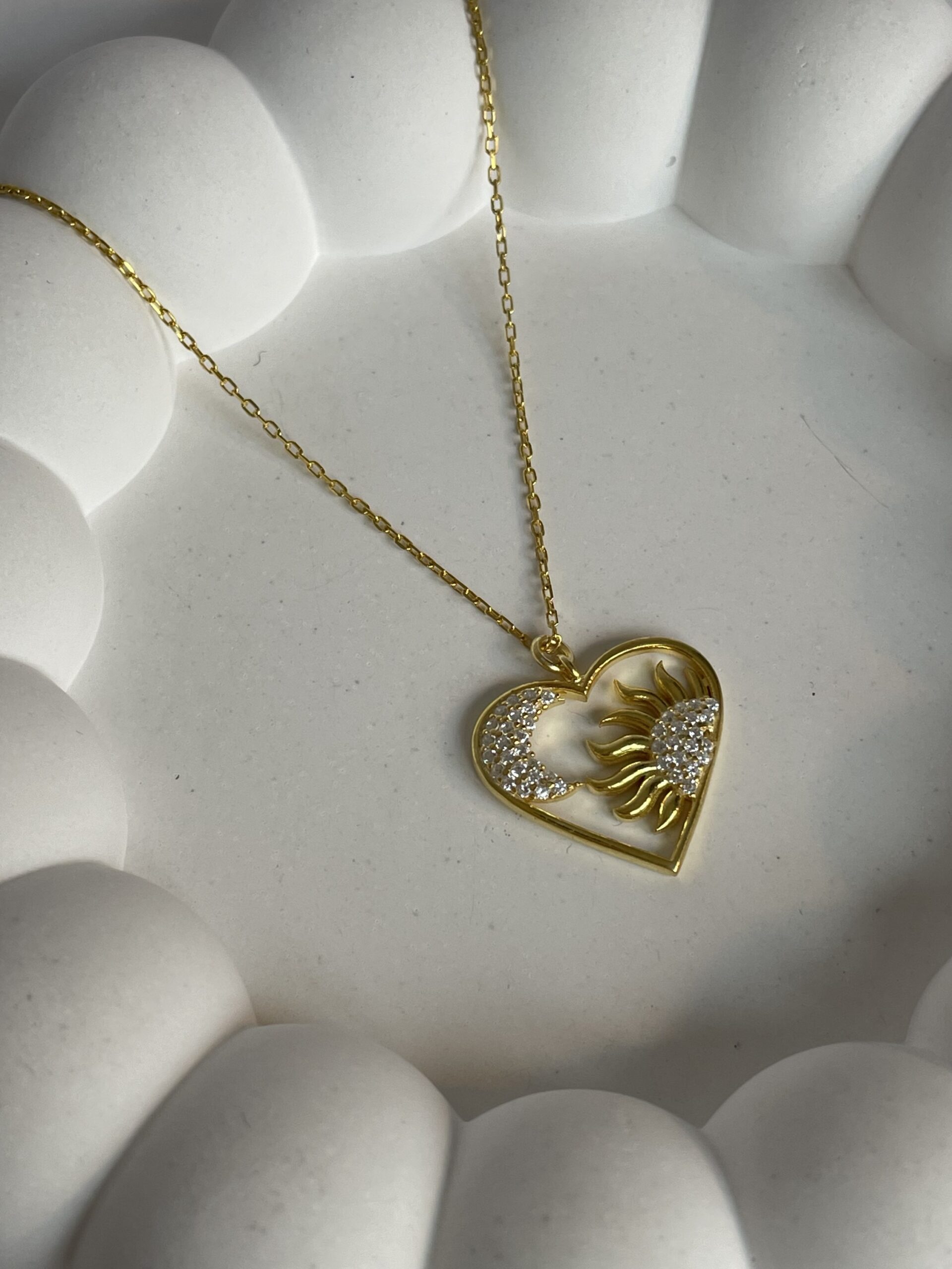 925 Gümüş Güneş Ay Temalı Kalp Tasarım Kolye