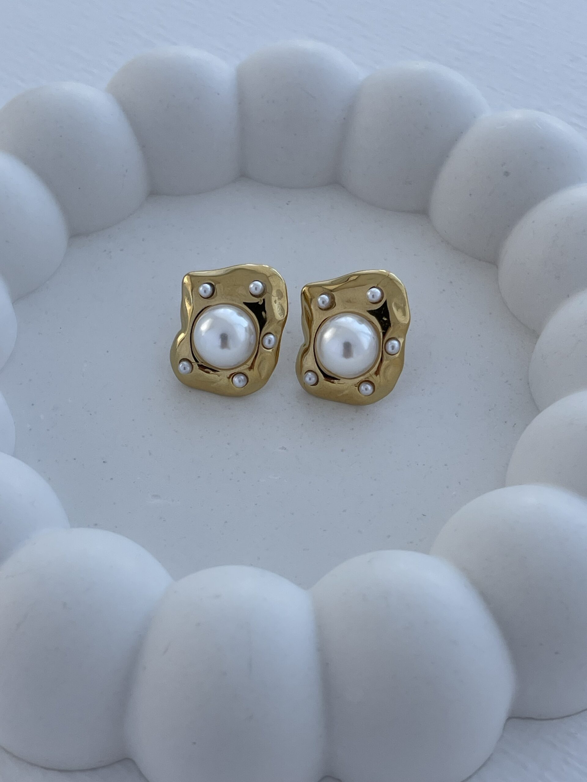 Çelik Asimetrik Tasarım Gold İncili Küpe