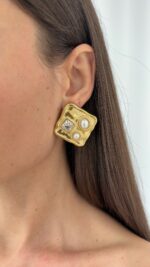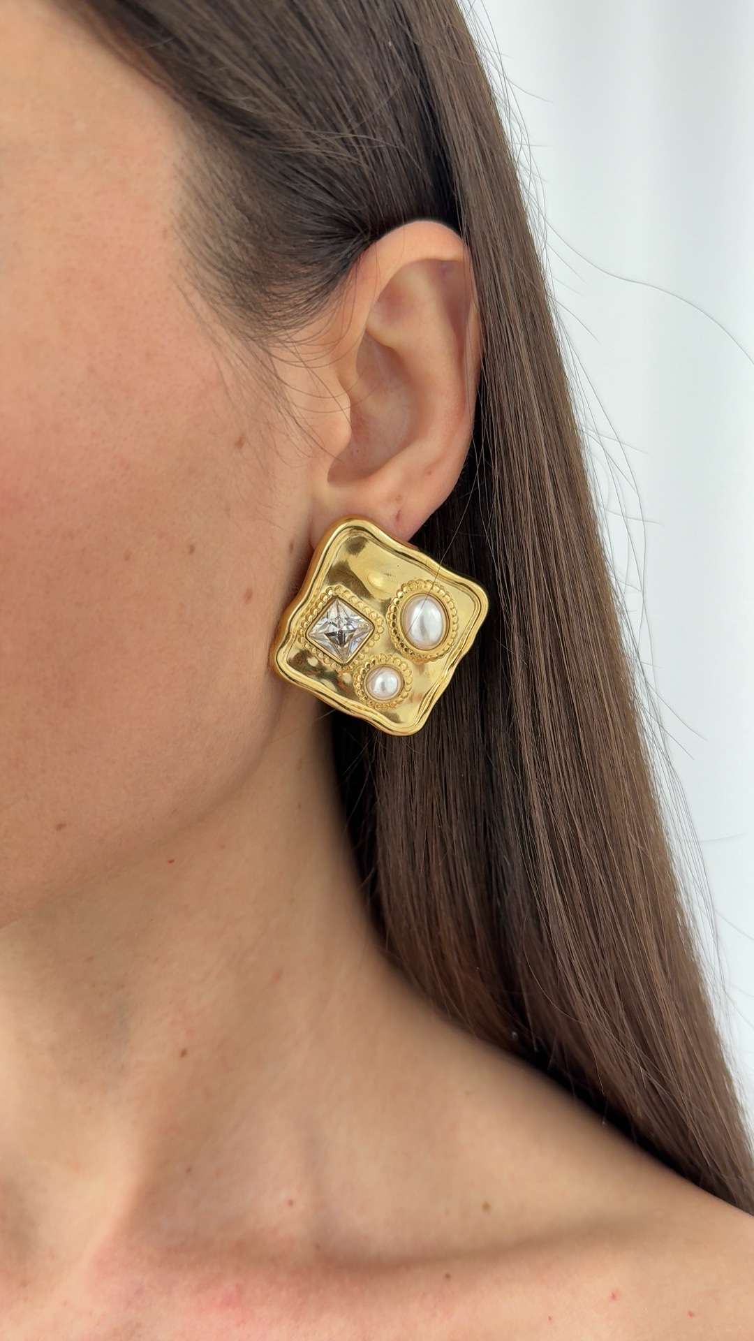 Çelik Baget Taşlı İnci Detay Kare Gold Küpe