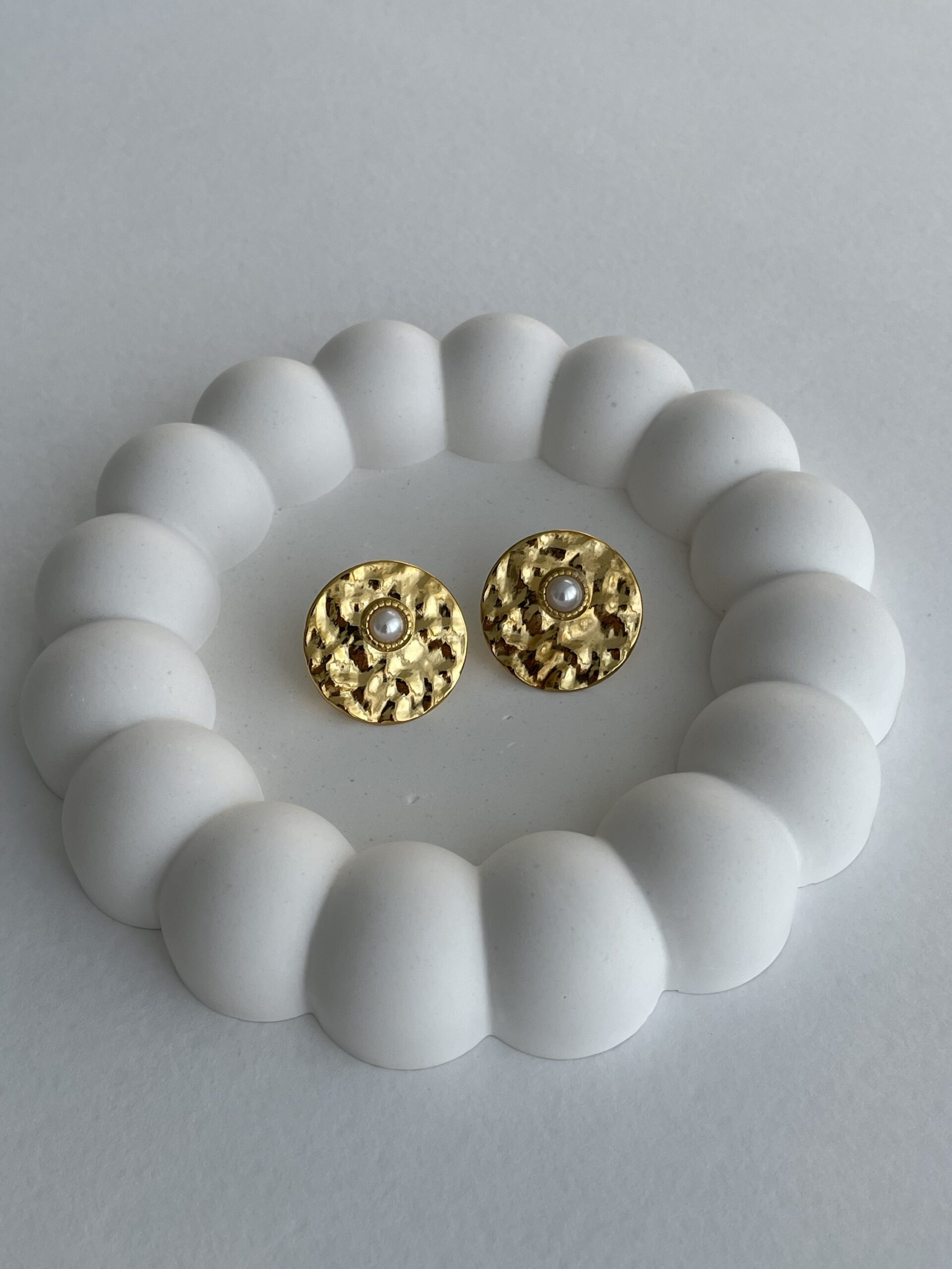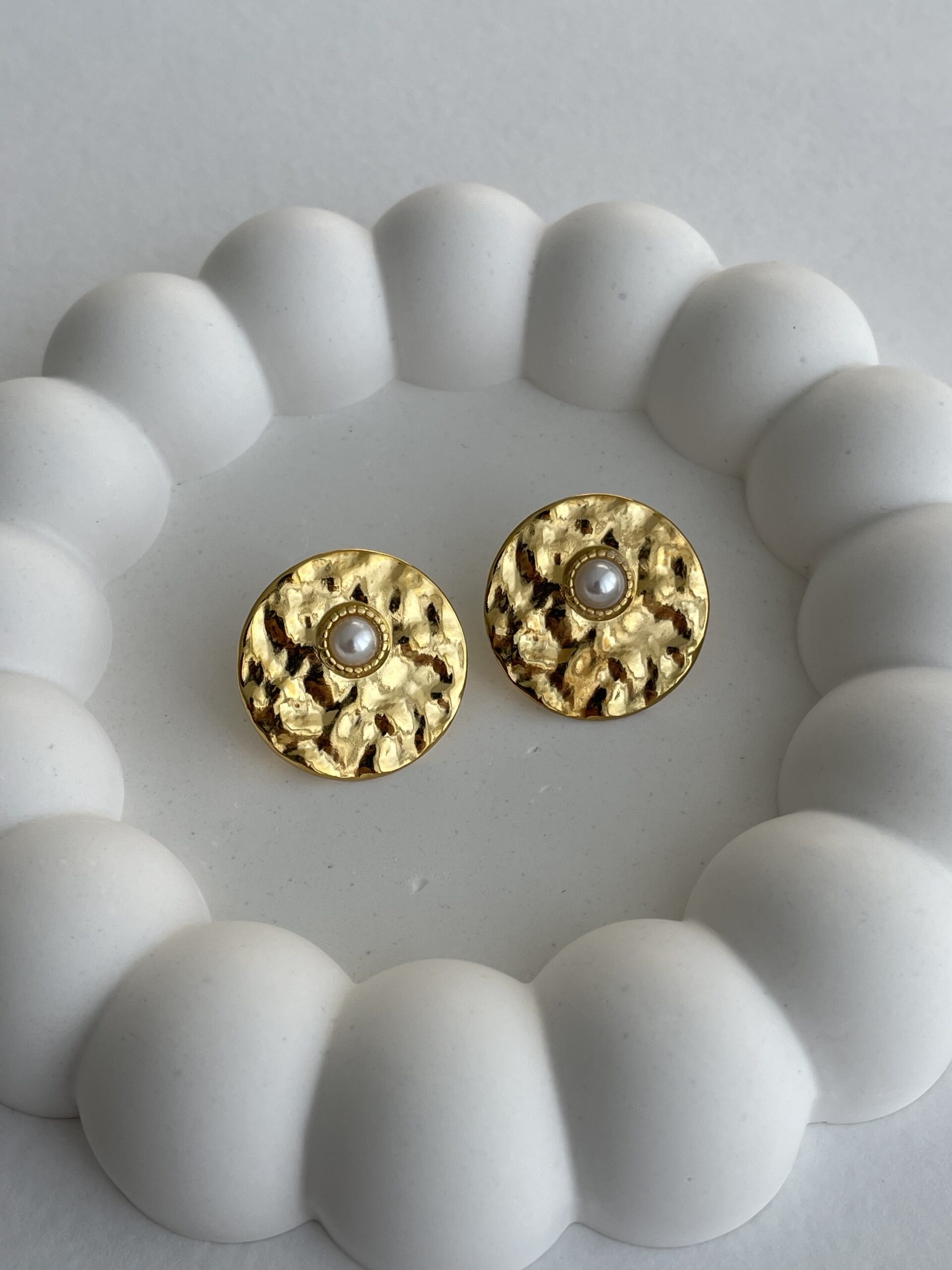 Çelik Ezme Plaka İnci Detaylı Gold Küpe