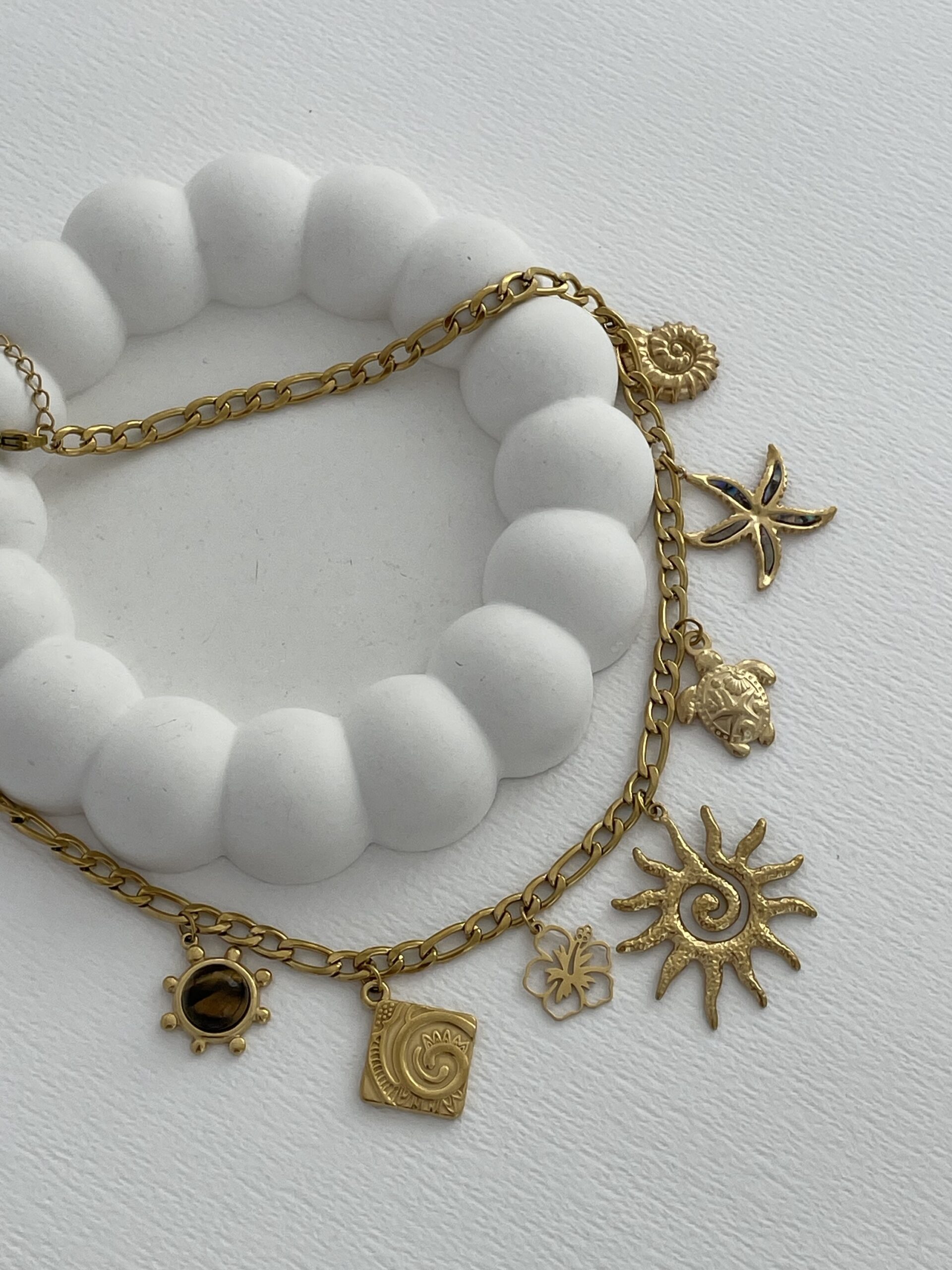 Çelik Kahve Mineli Güneş Charm Gold Kolye