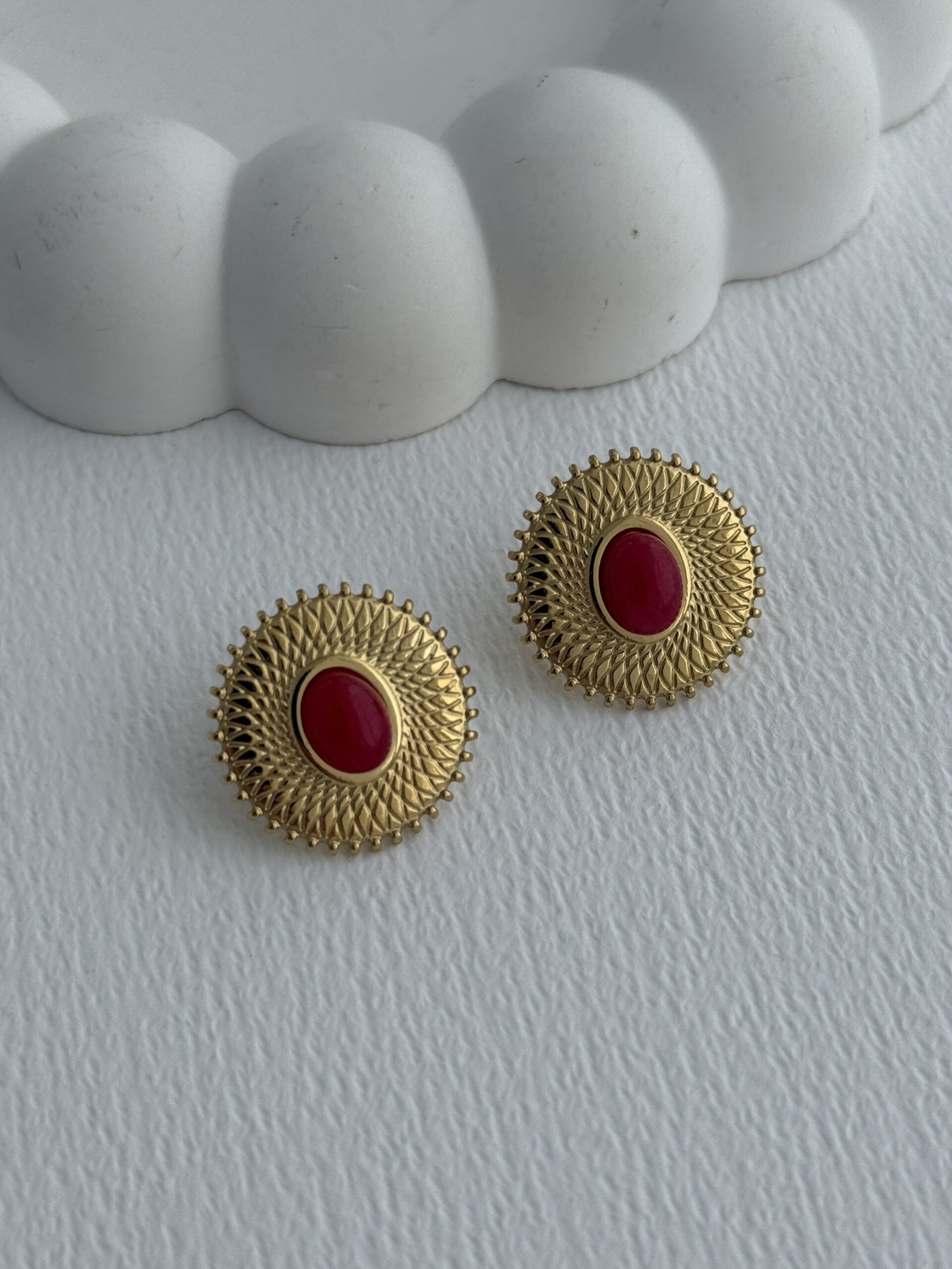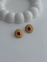 Çelik Kırmızı Oval Taş Detay Desenli Gold Küpe
