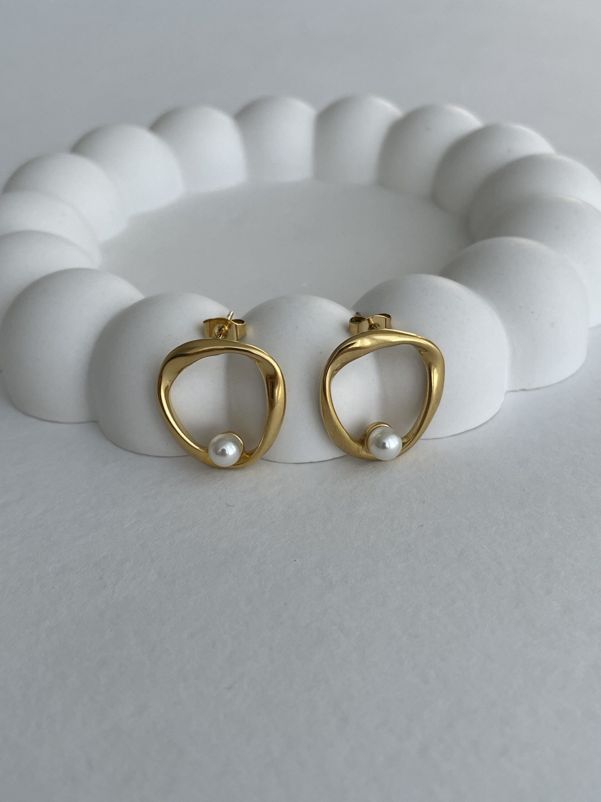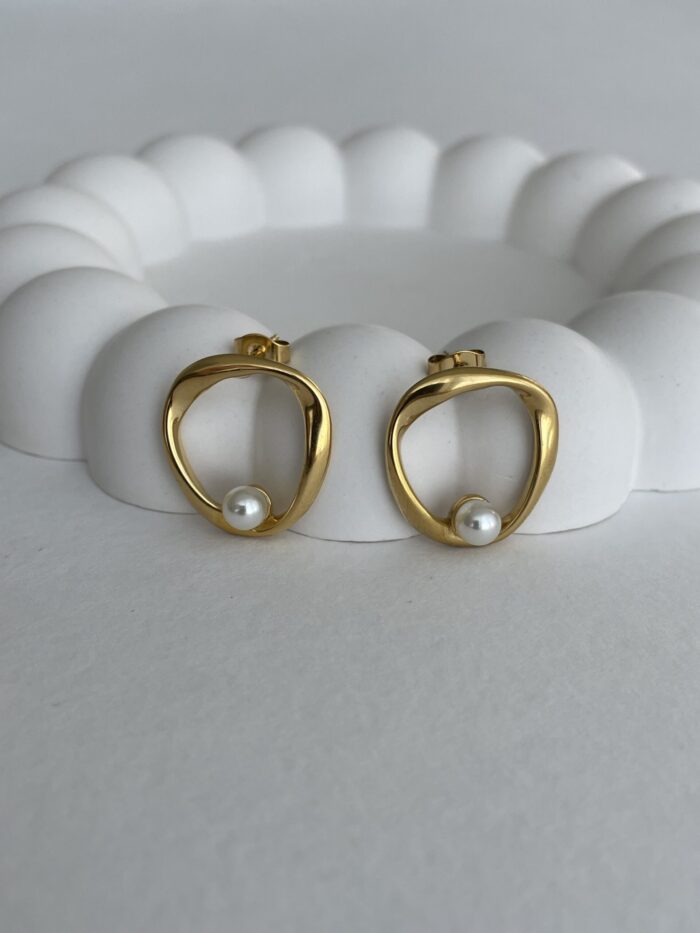 Çelik Oval Tasarım İnci Detaylı Gold Küpe
