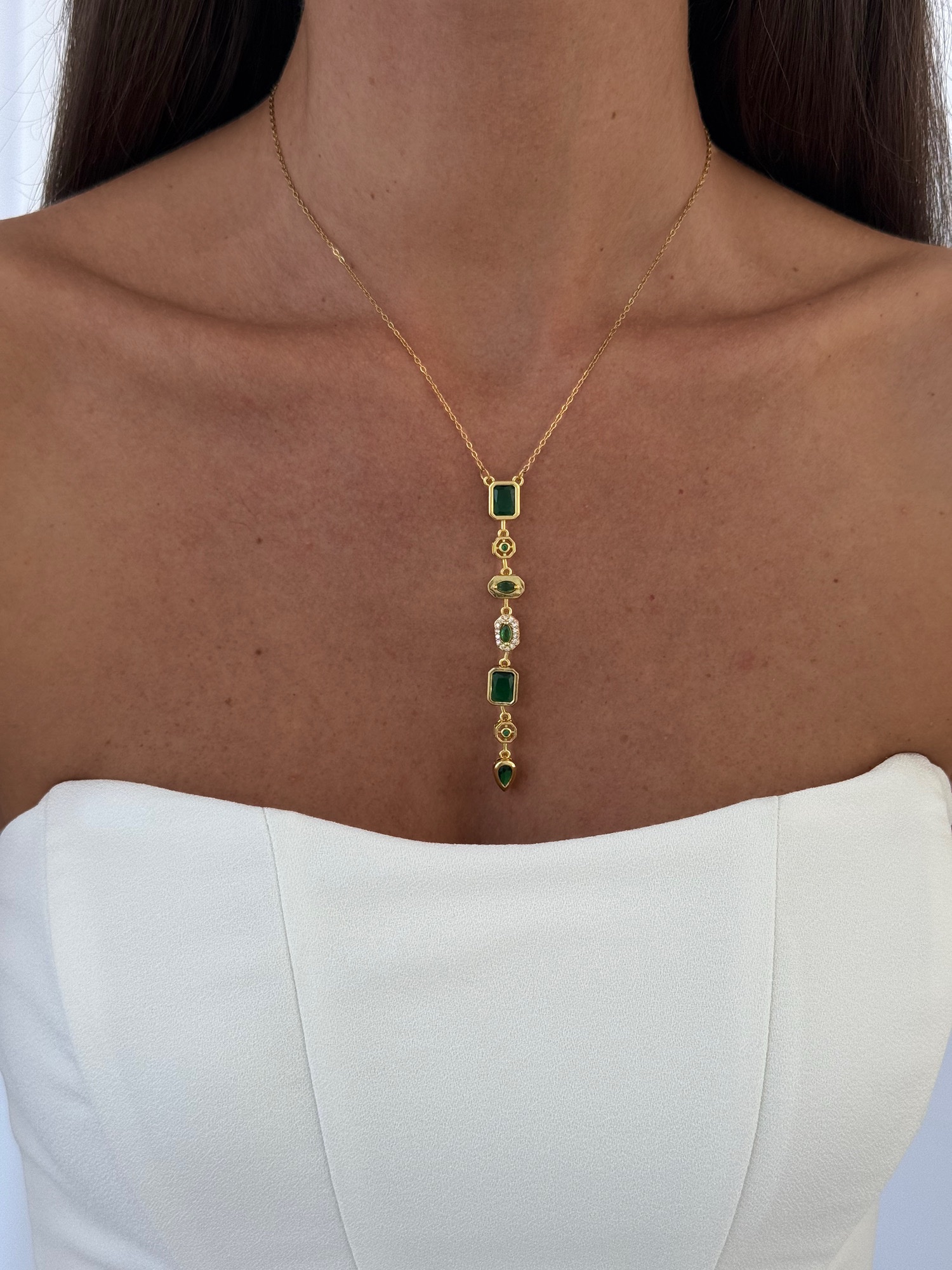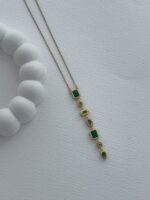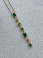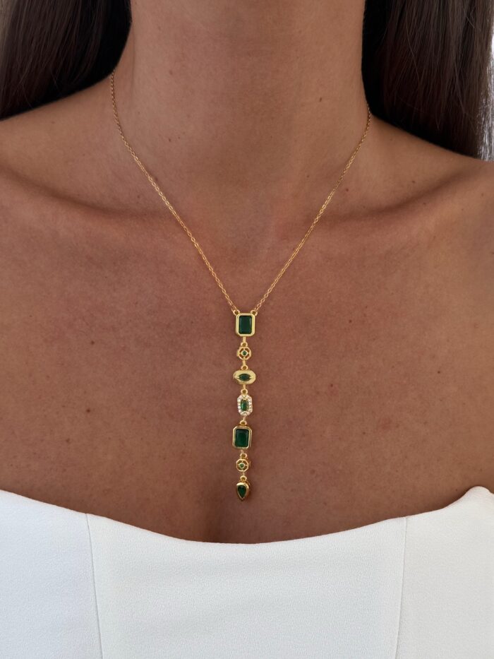 Çelik Yeşil Baget Taşlı Geometrik Tasarım Gold Y Kolye