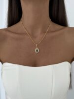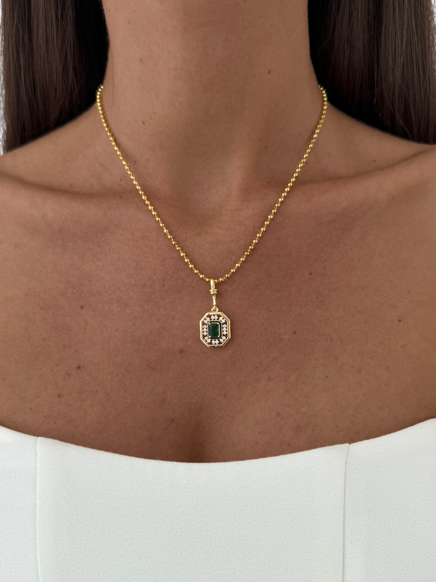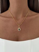 Çelik Yeşil Baget Taşlı Kare Tasarım Golda Kolye