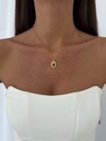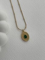 Çelik Yeşil Damla Taş Desenli Vintage Gold Kolye