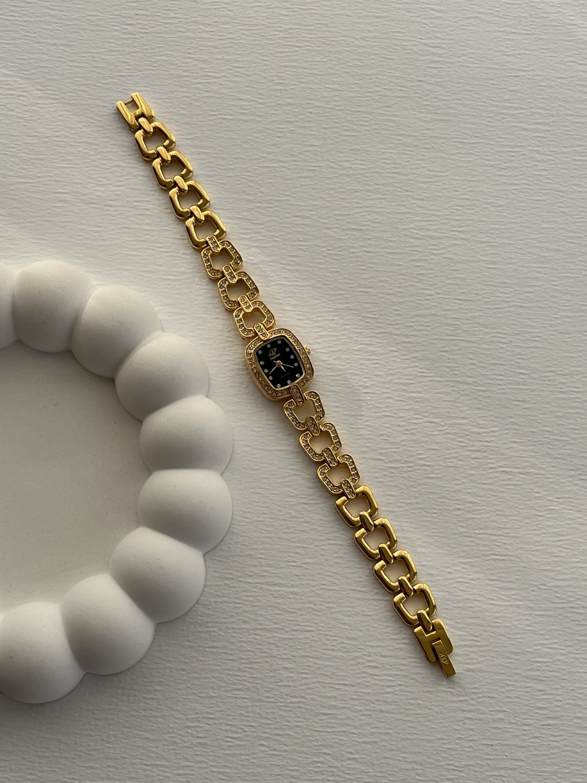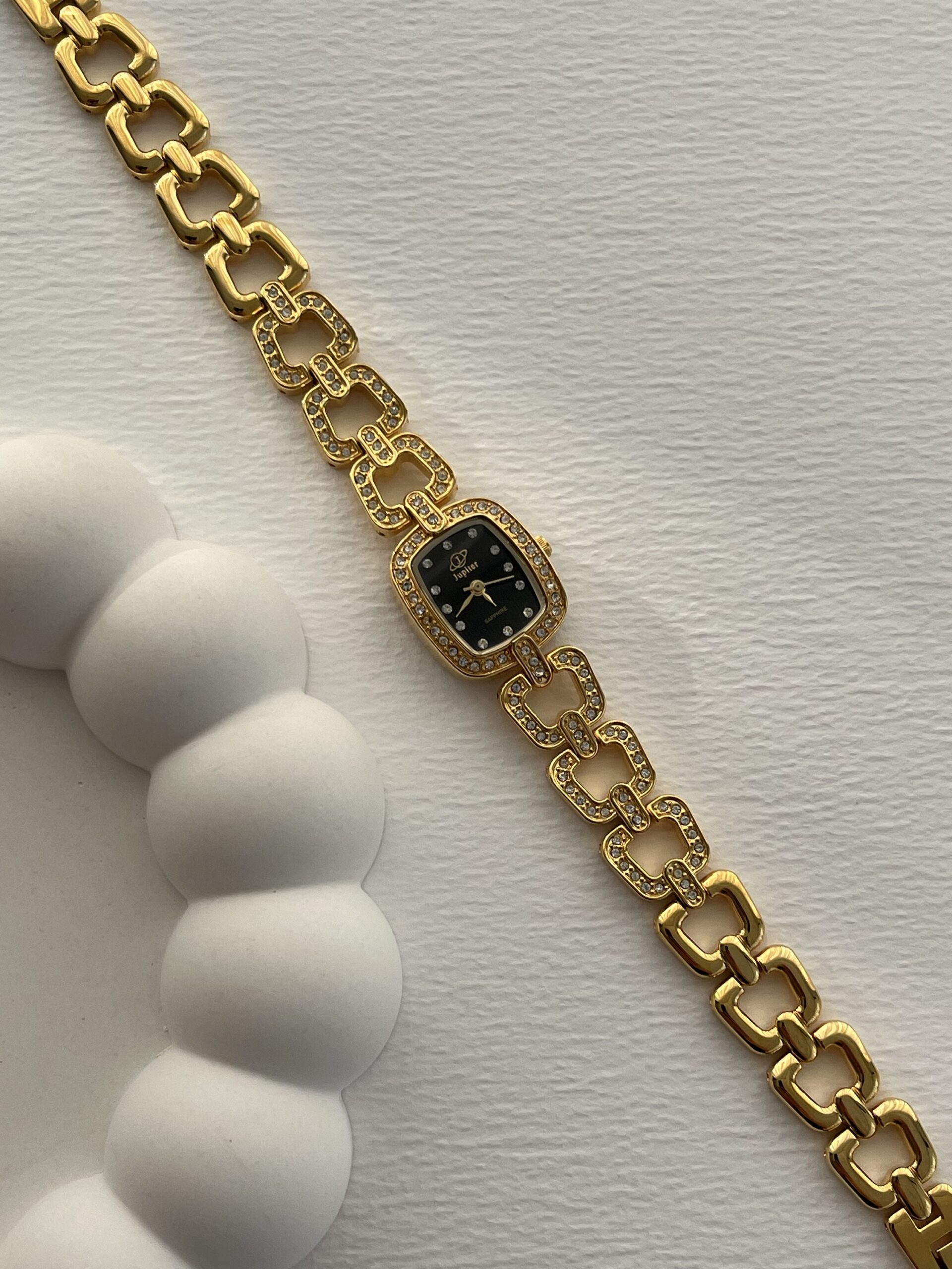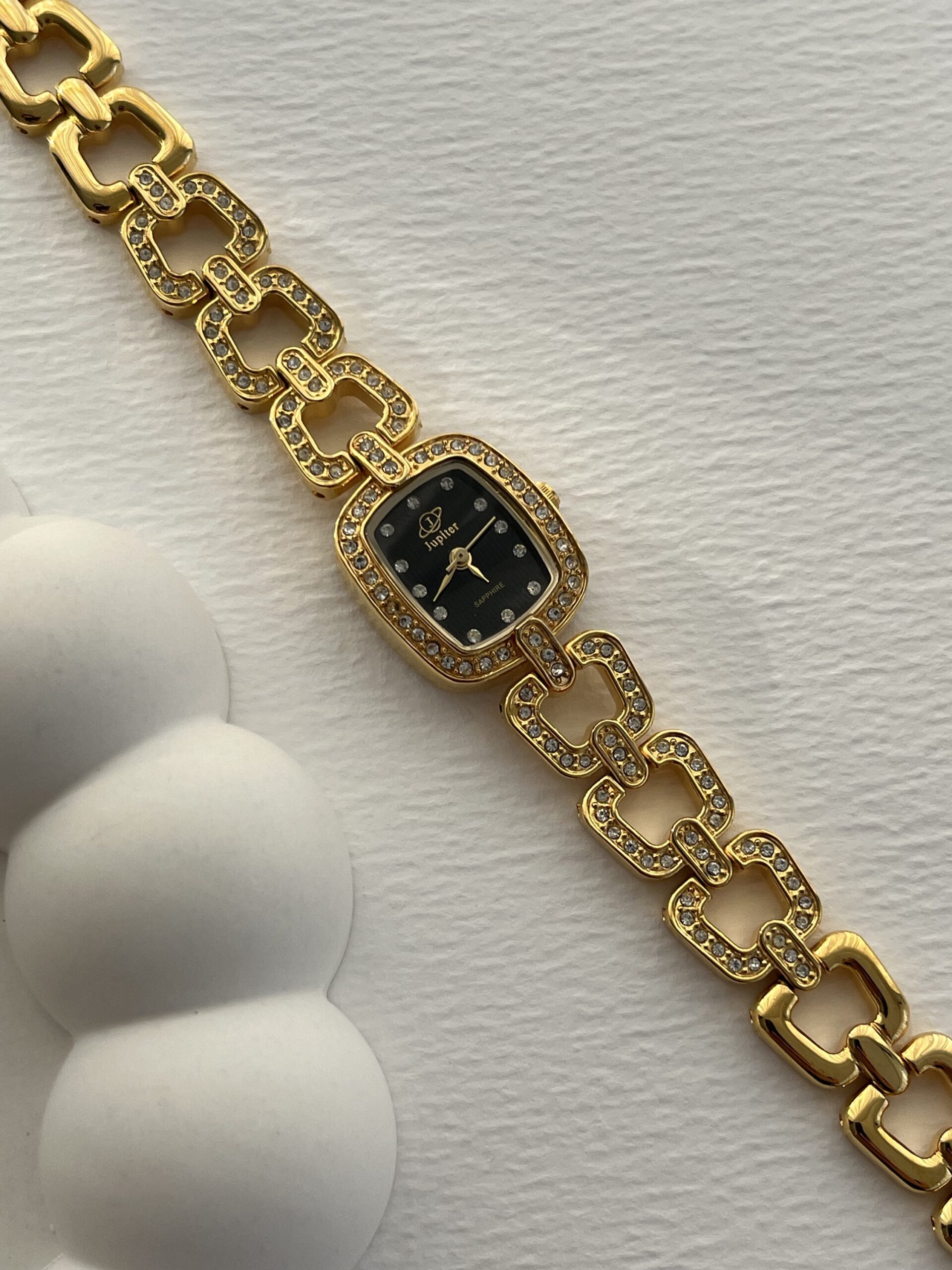 Çelik Zirkon Taşlı Siyah Kadran Vintage Gold Saat