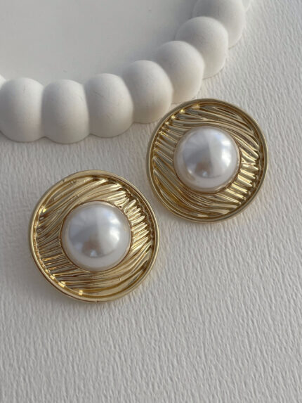 Özel Seri İnci Detay Desenli Yuvarlak Gold Küpe