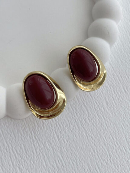 Özel Seri Bordo Kemik Detay Oval Tasarım Gold Küpe