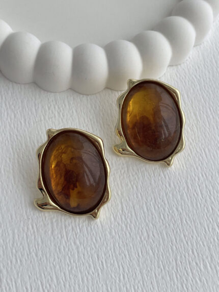 Özel Seri Kahverengi Mineli Soyut Tasarım Gold Küpe