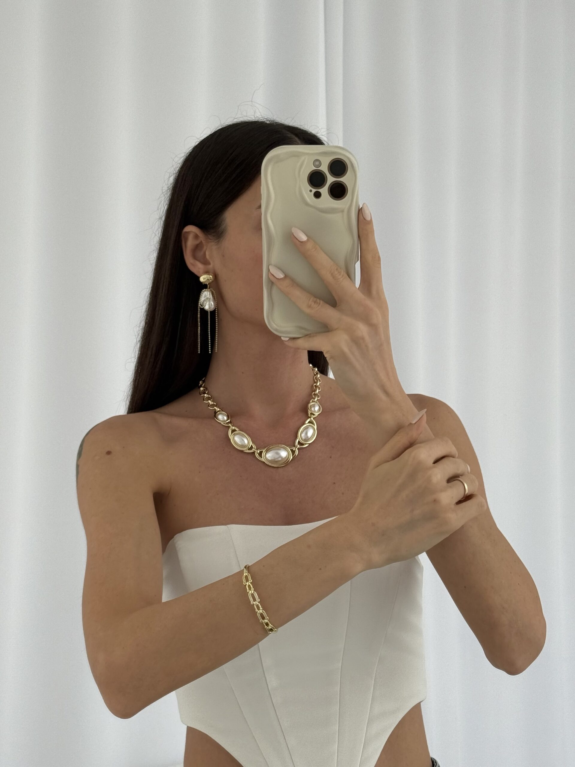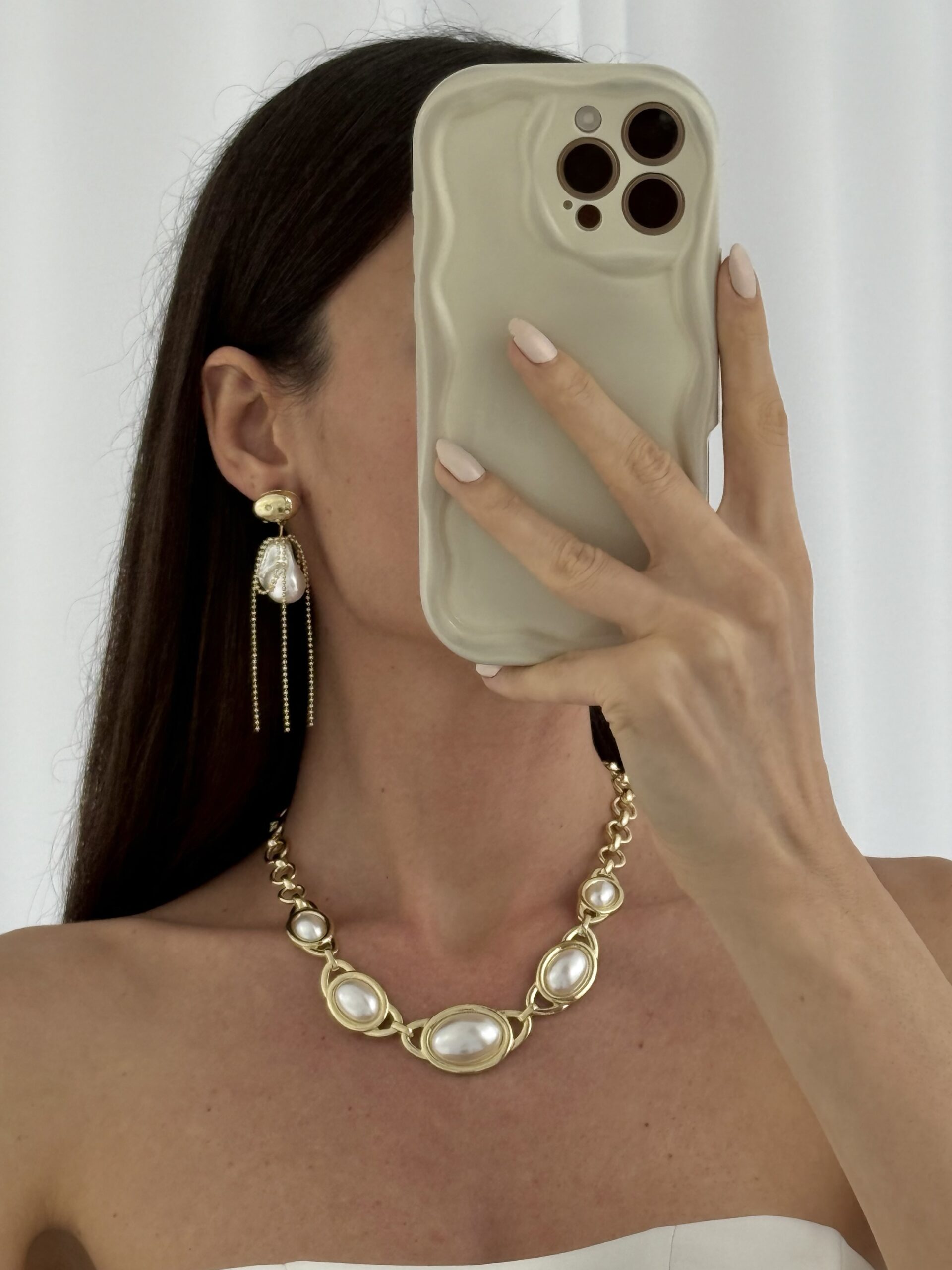 Özel Seri Top Zincir Sallantılı Barok İnci Detay Gold Küpe