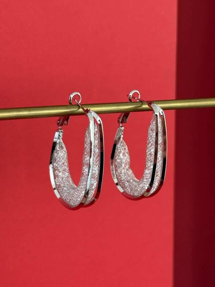 NS-Zirkon Taşla Çevrili Tel Detay Oval Gümüş Küpe
