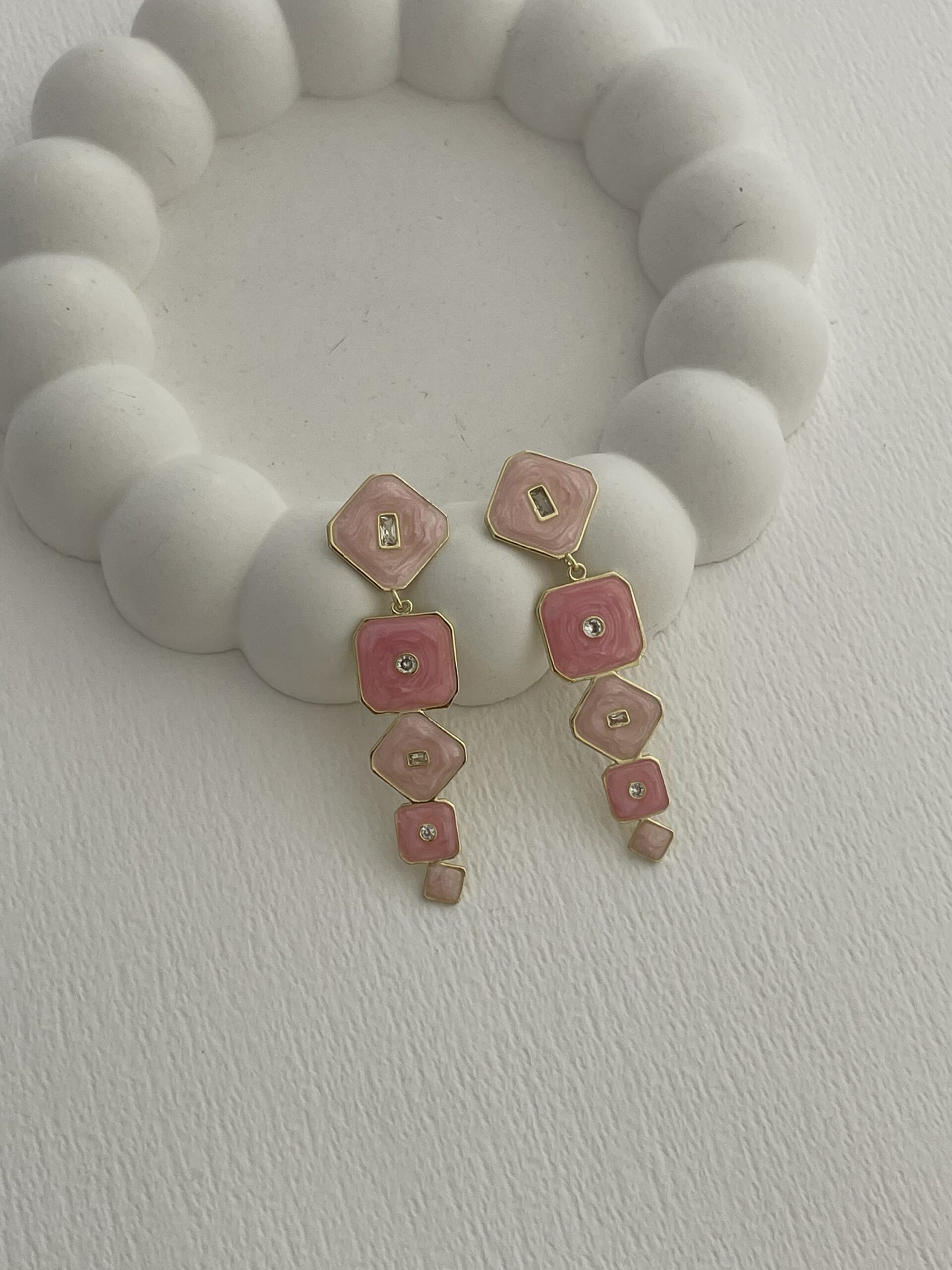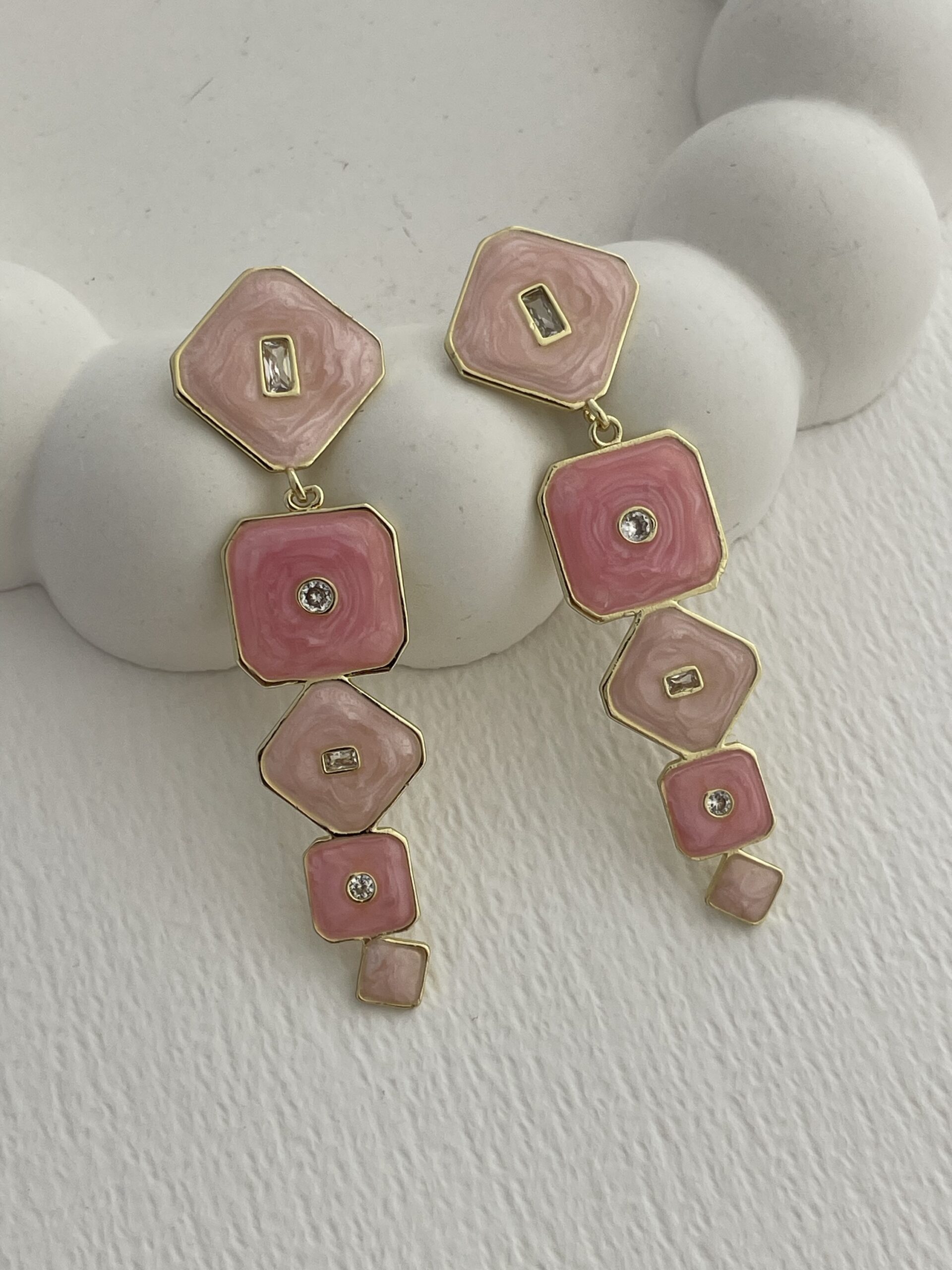 Özel Seri Baget Taşlı Geometrik Tasarım Pembe – Gold Küpe