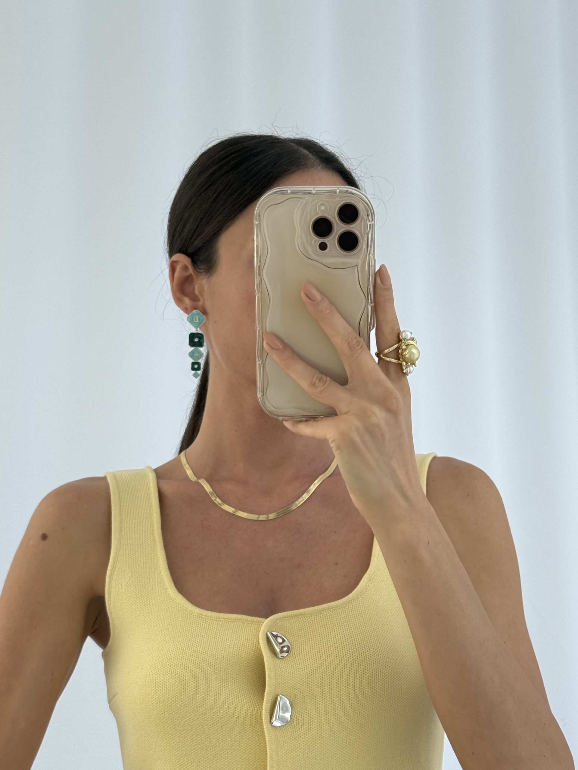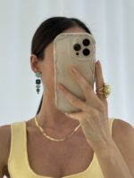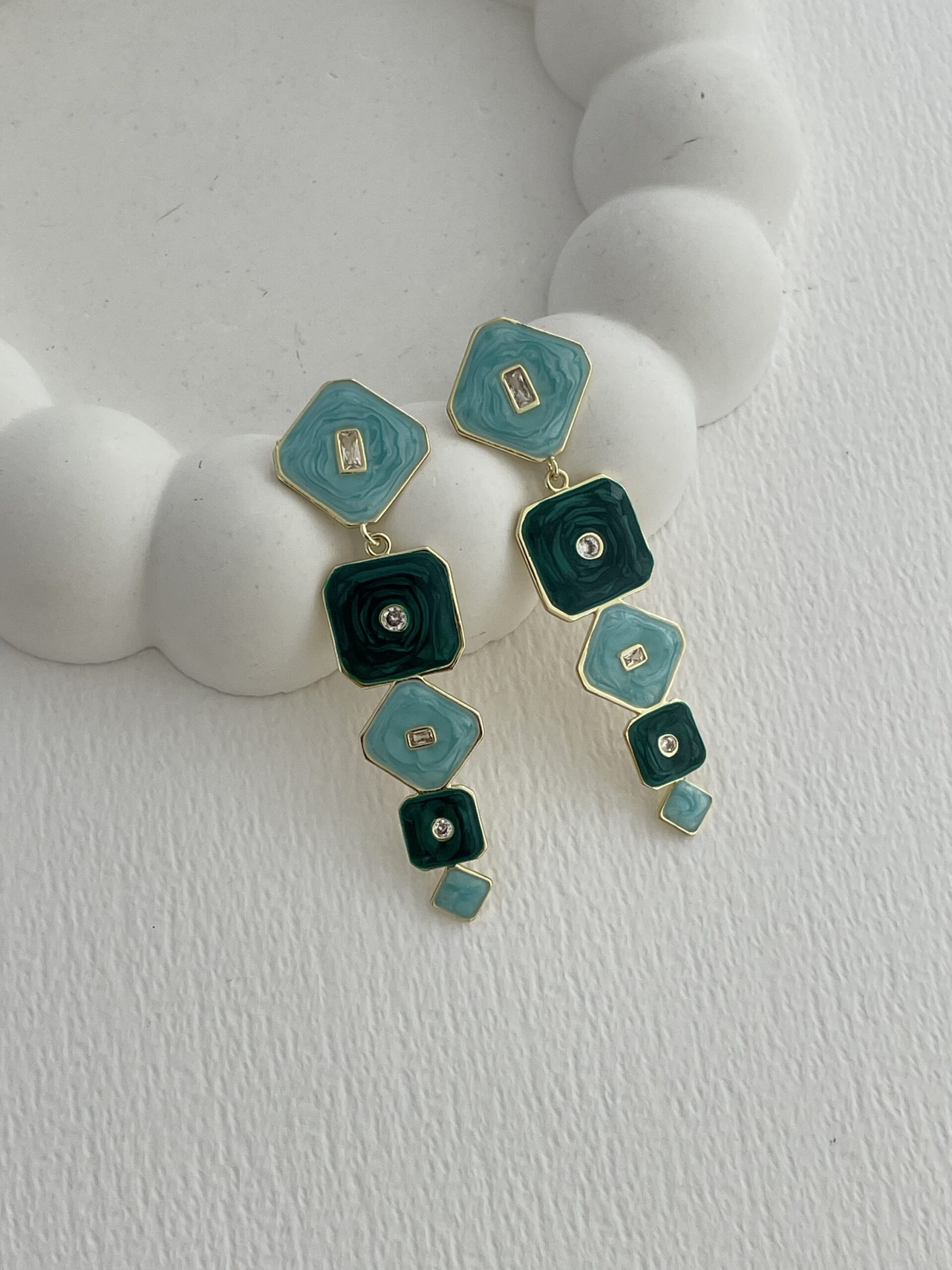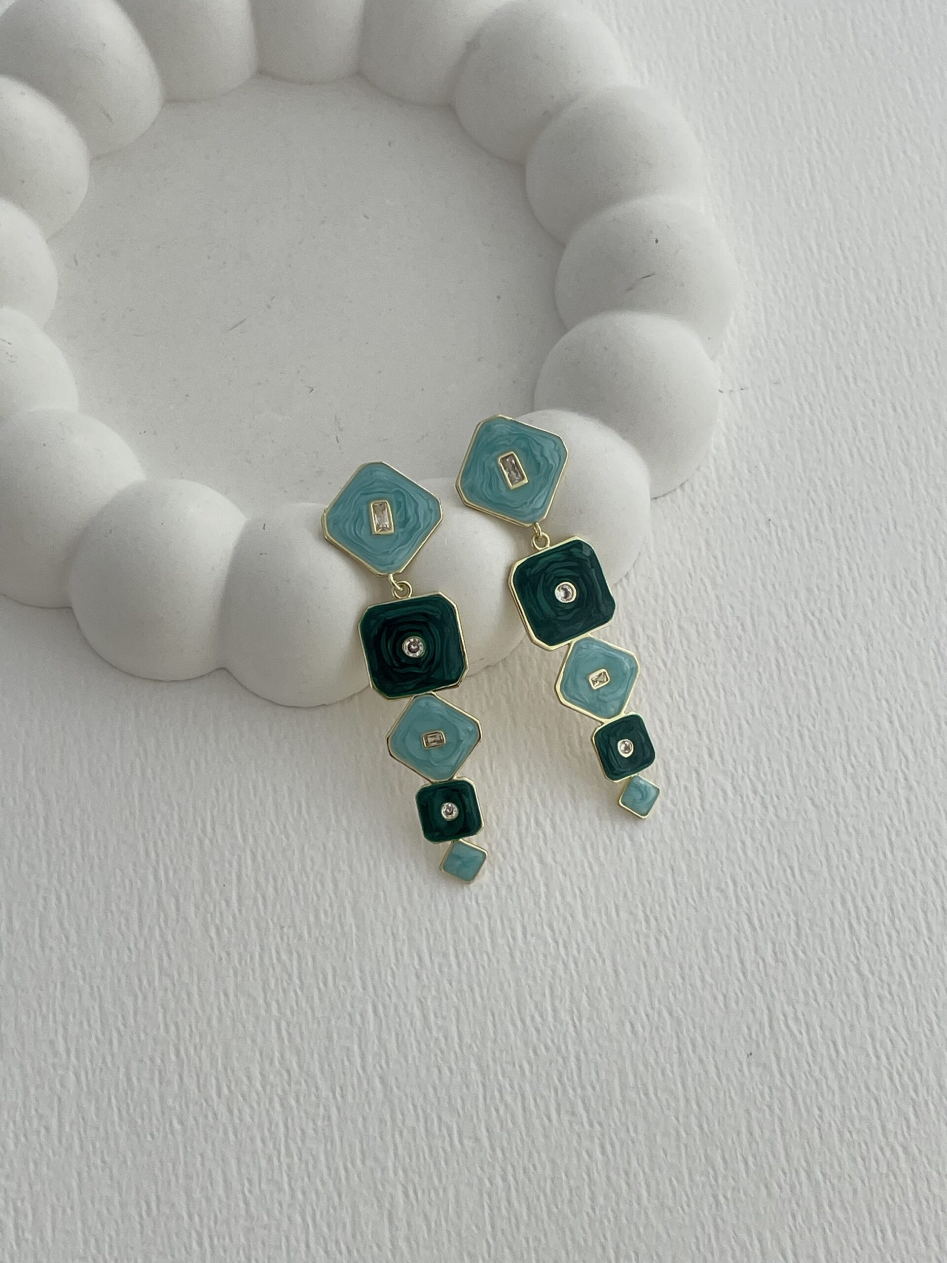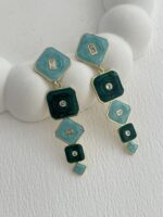 Özel Seri Baget Taşlı Geometrik Tasarım Yeşil – Gold Küpe