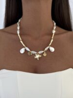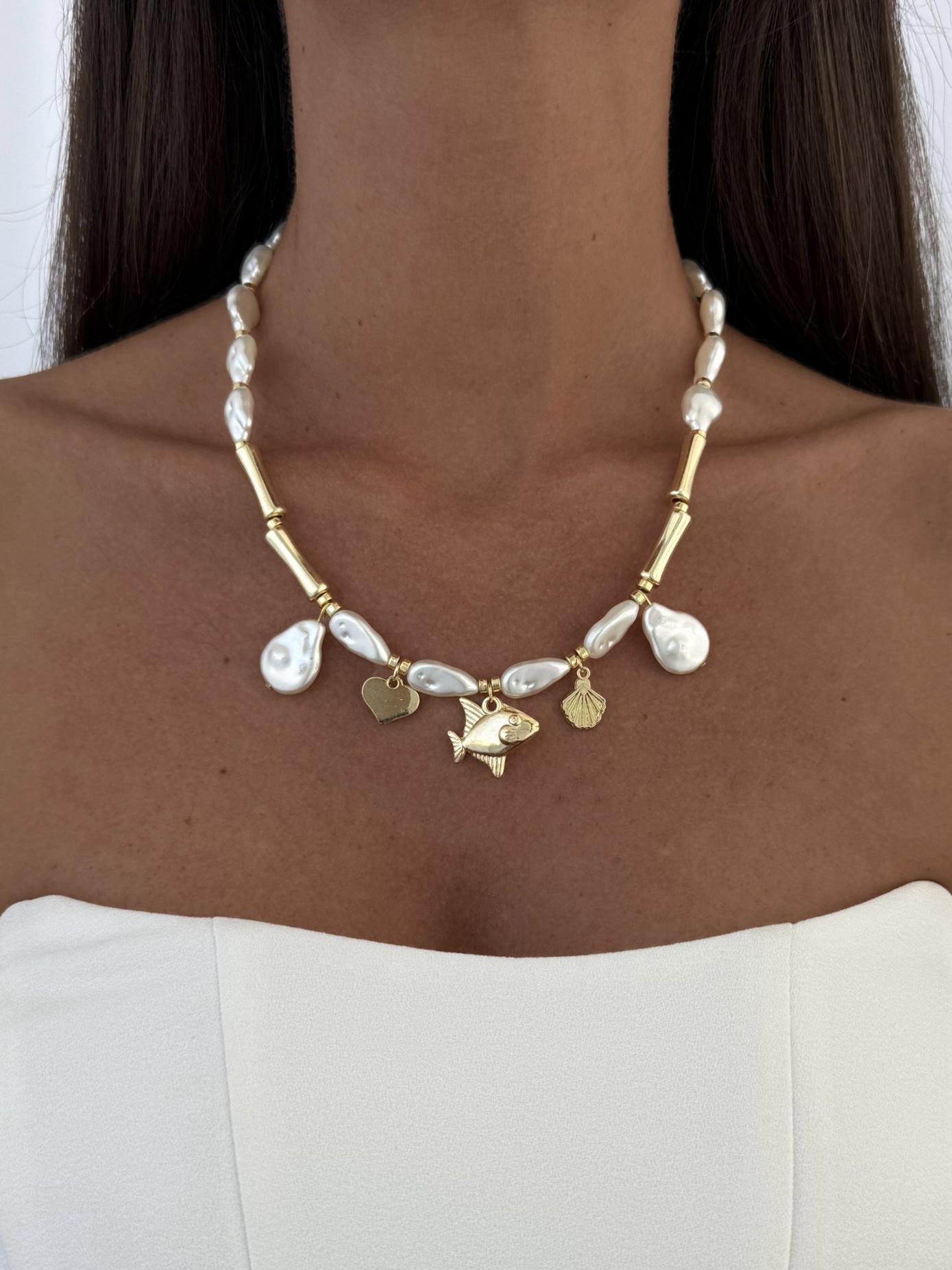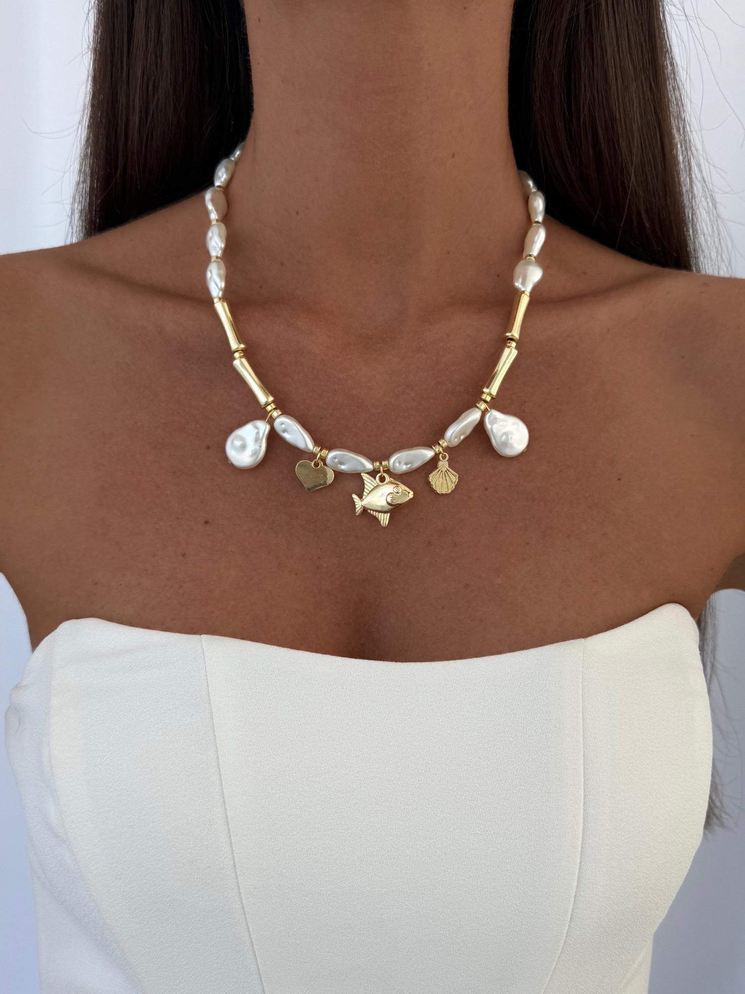 Özel Seri Balık Tasarım İncili Kemik Gold Detay Kolye