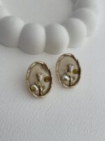 Özel Seri Bej Gül Tasarım Gold Oval Küpe