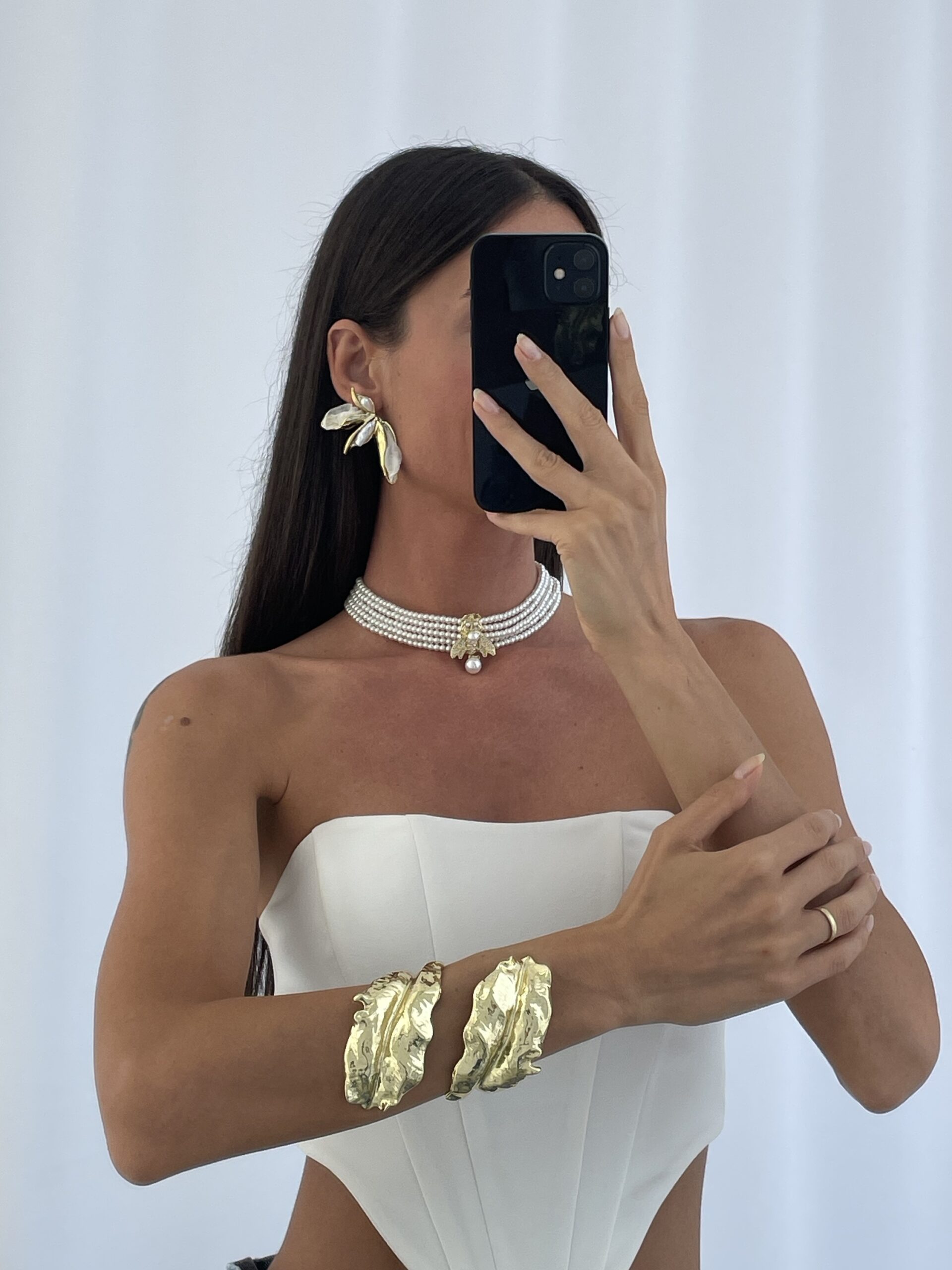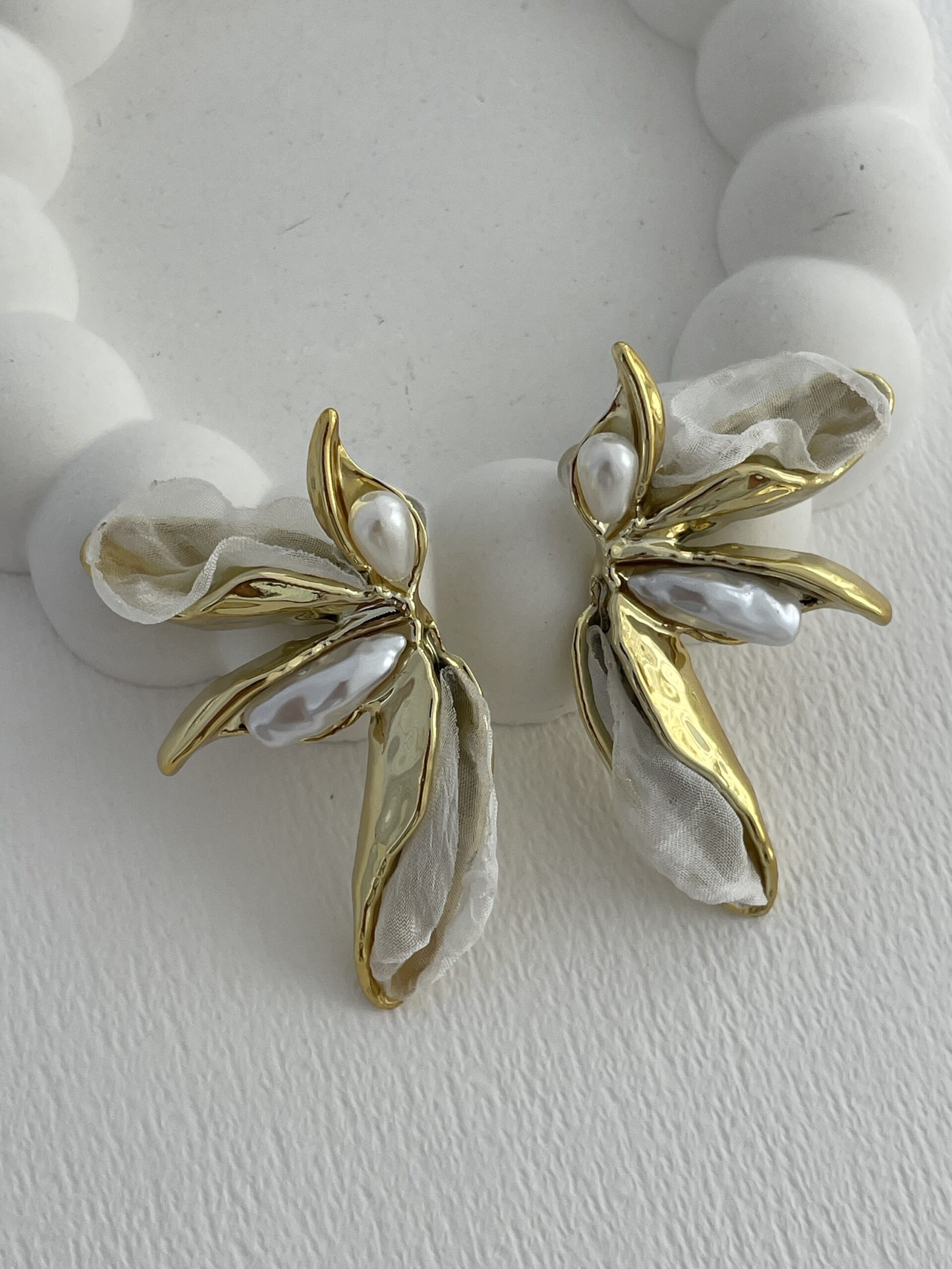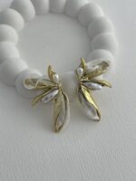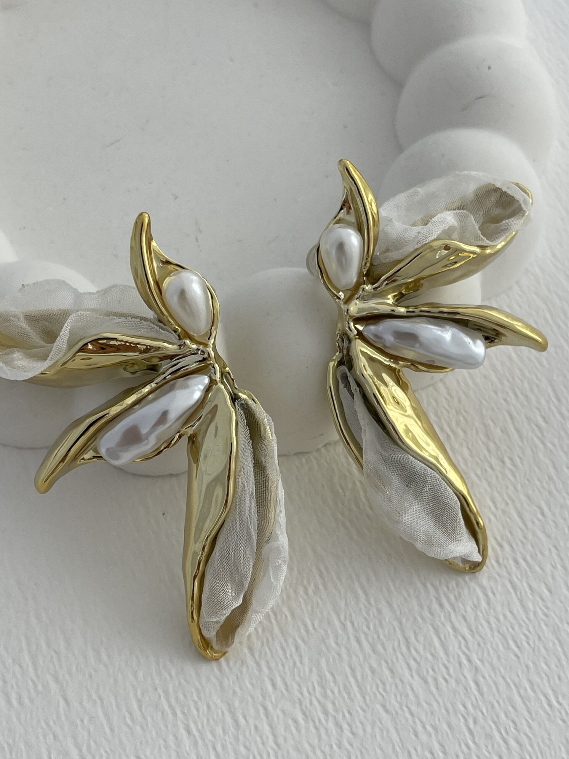Özel Seri Beyaz Tül Detaylı Yaprak Tasarım Gold Küpe