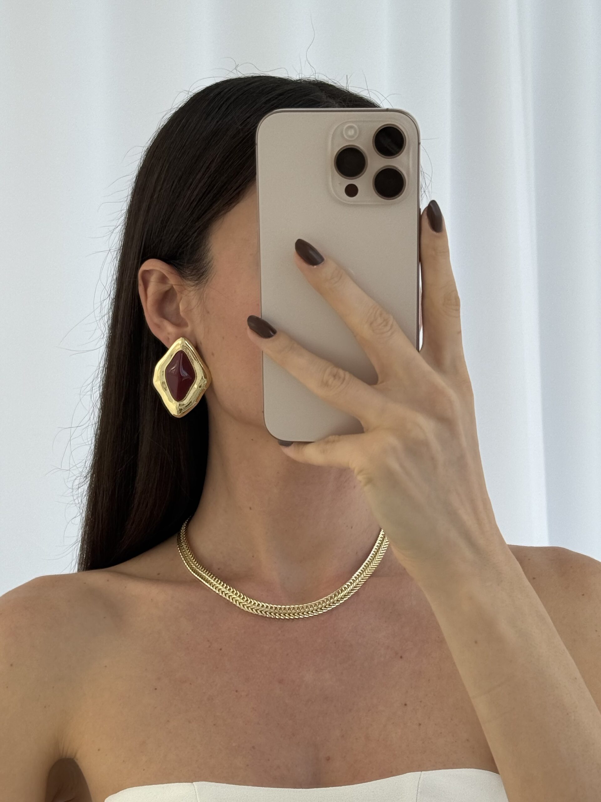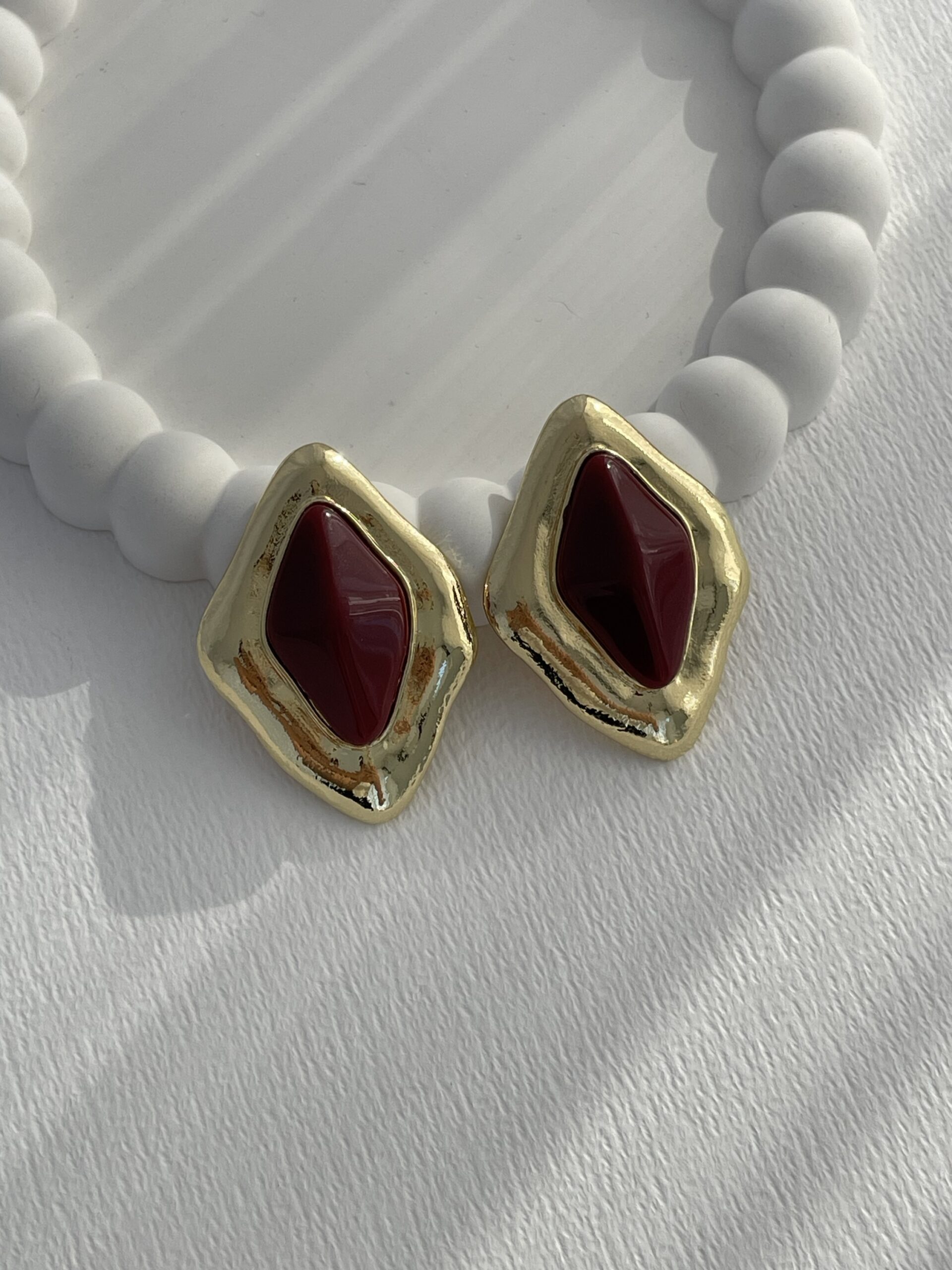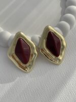Özel Seri Bordo Kemik Detay Desenli Baklava Gold Küpe