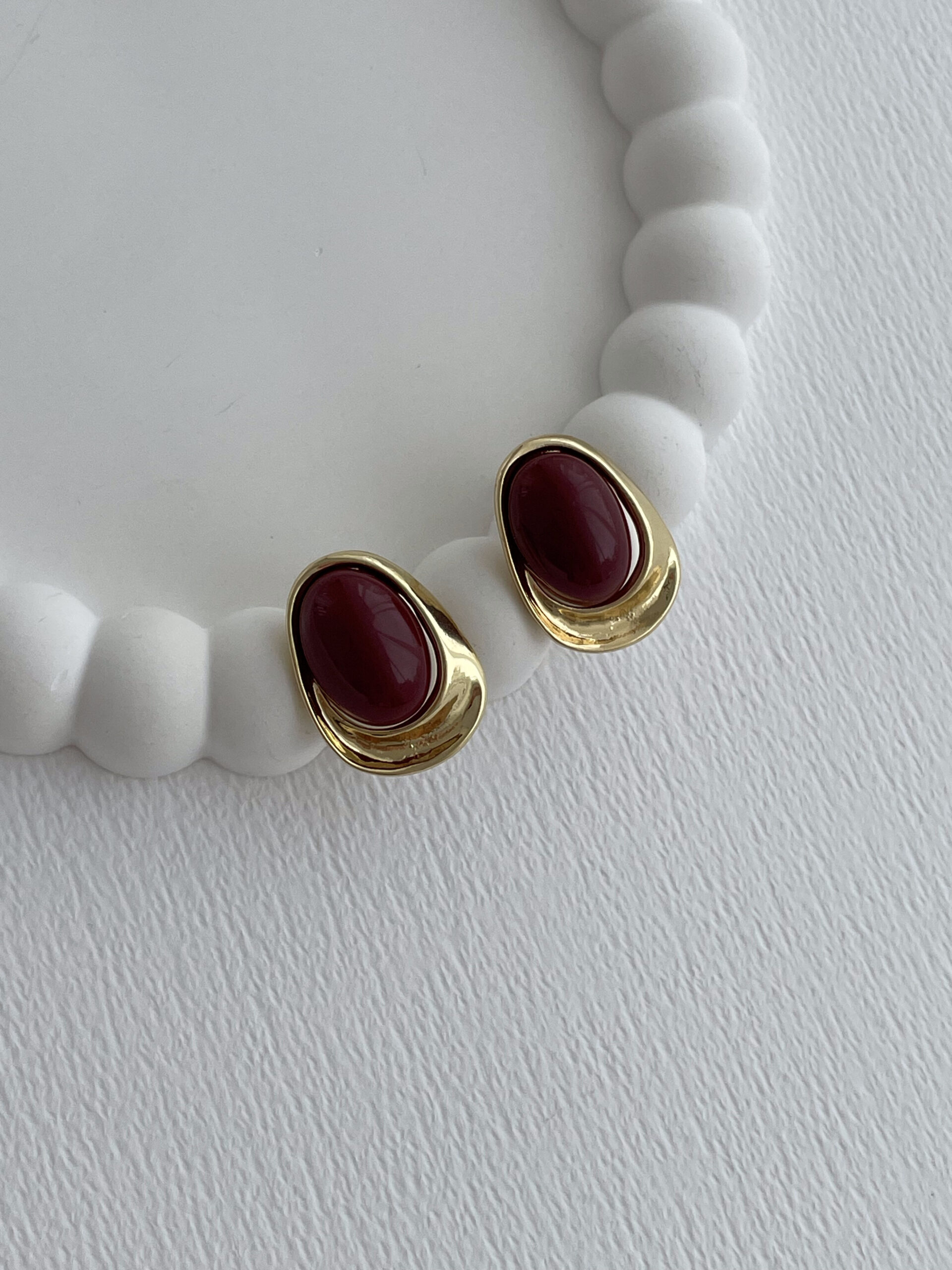 Özel Seri Bordo Kemik Detay Oval Tasarım Gold Küpe