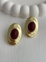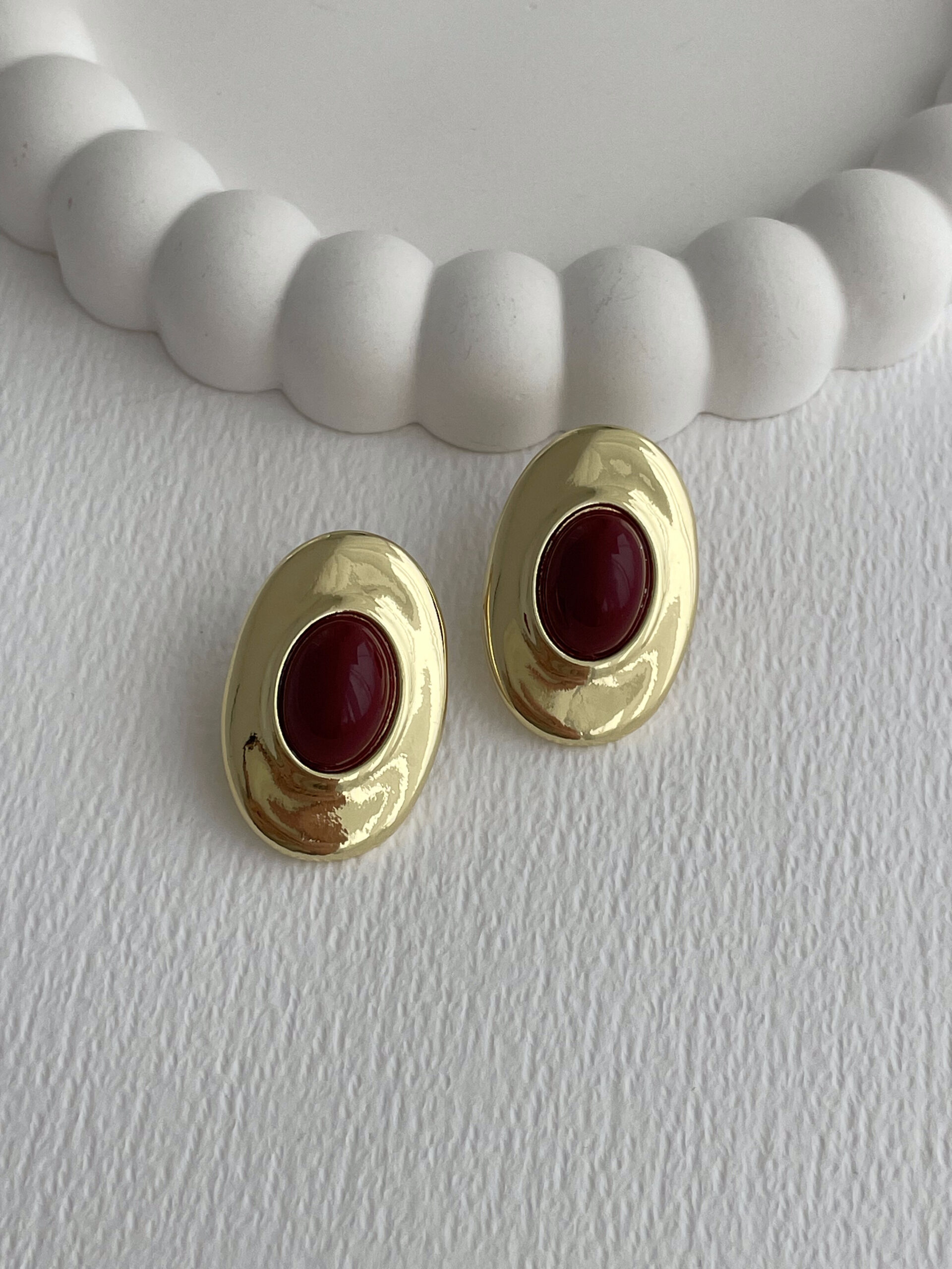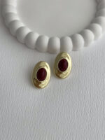 Özel Seri Bordo Mineli Oval Tasarım Gold Küpe