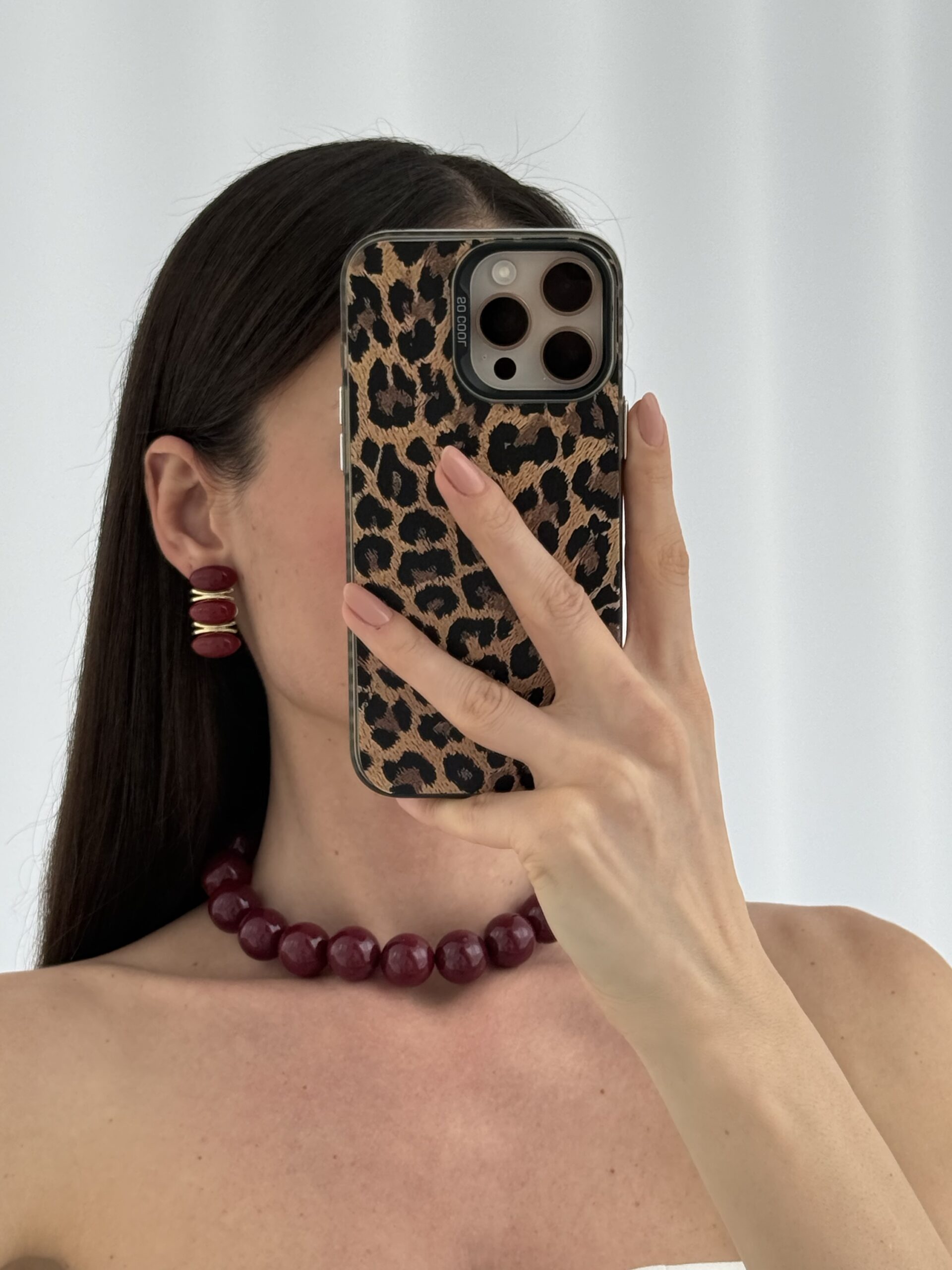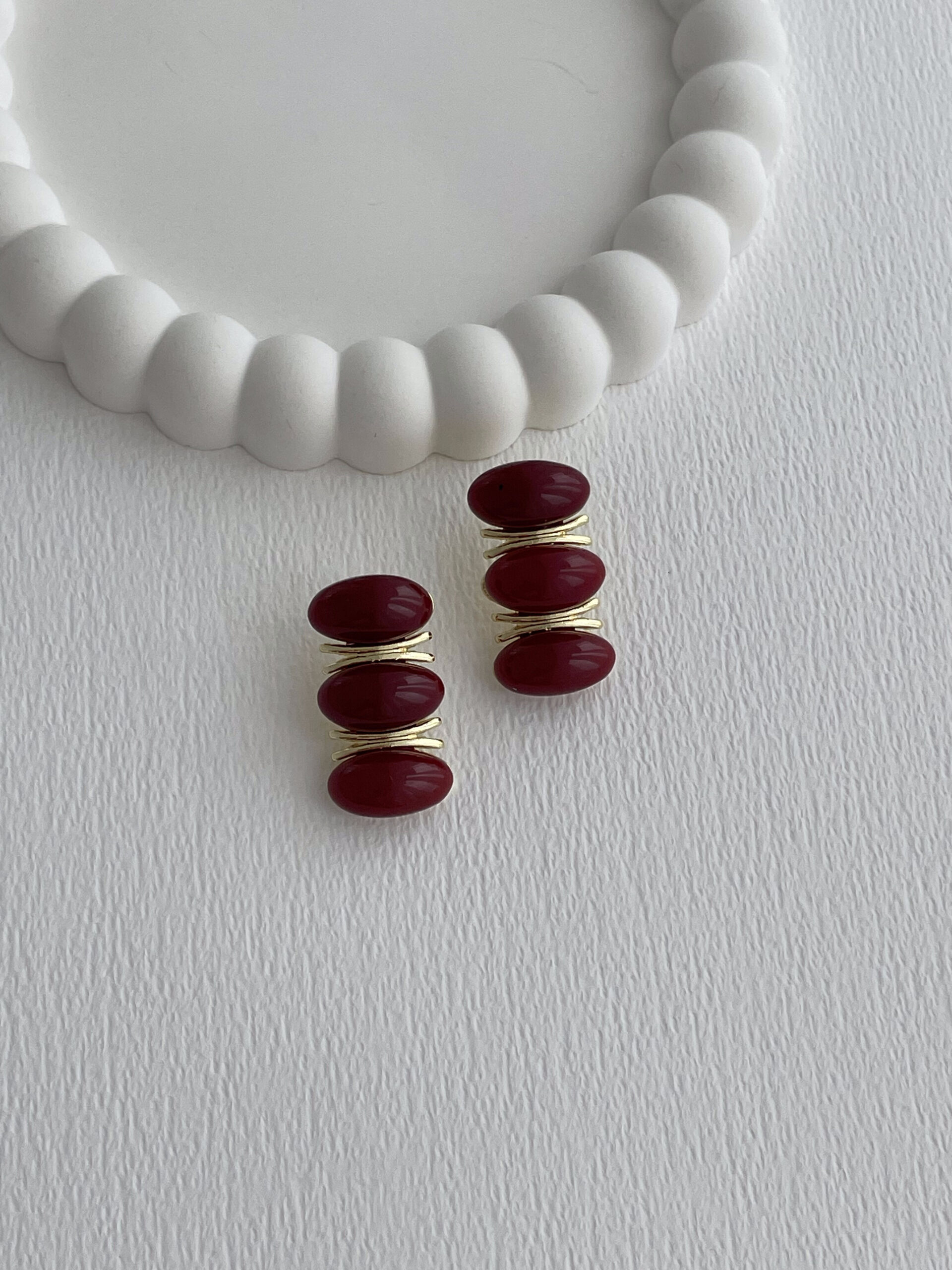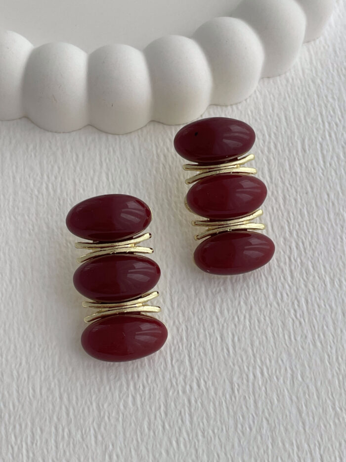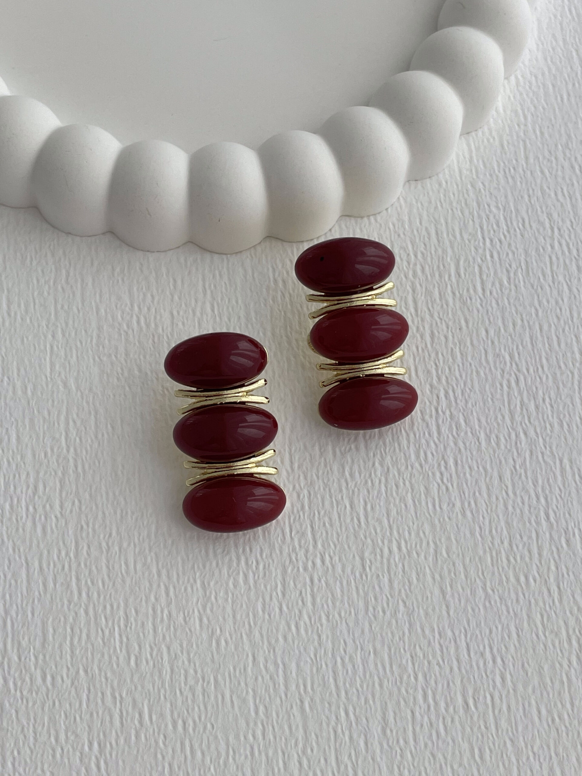 Özel Seri Bordo Mineli Üçlü Oval Taş Tasarım Gold Küpe