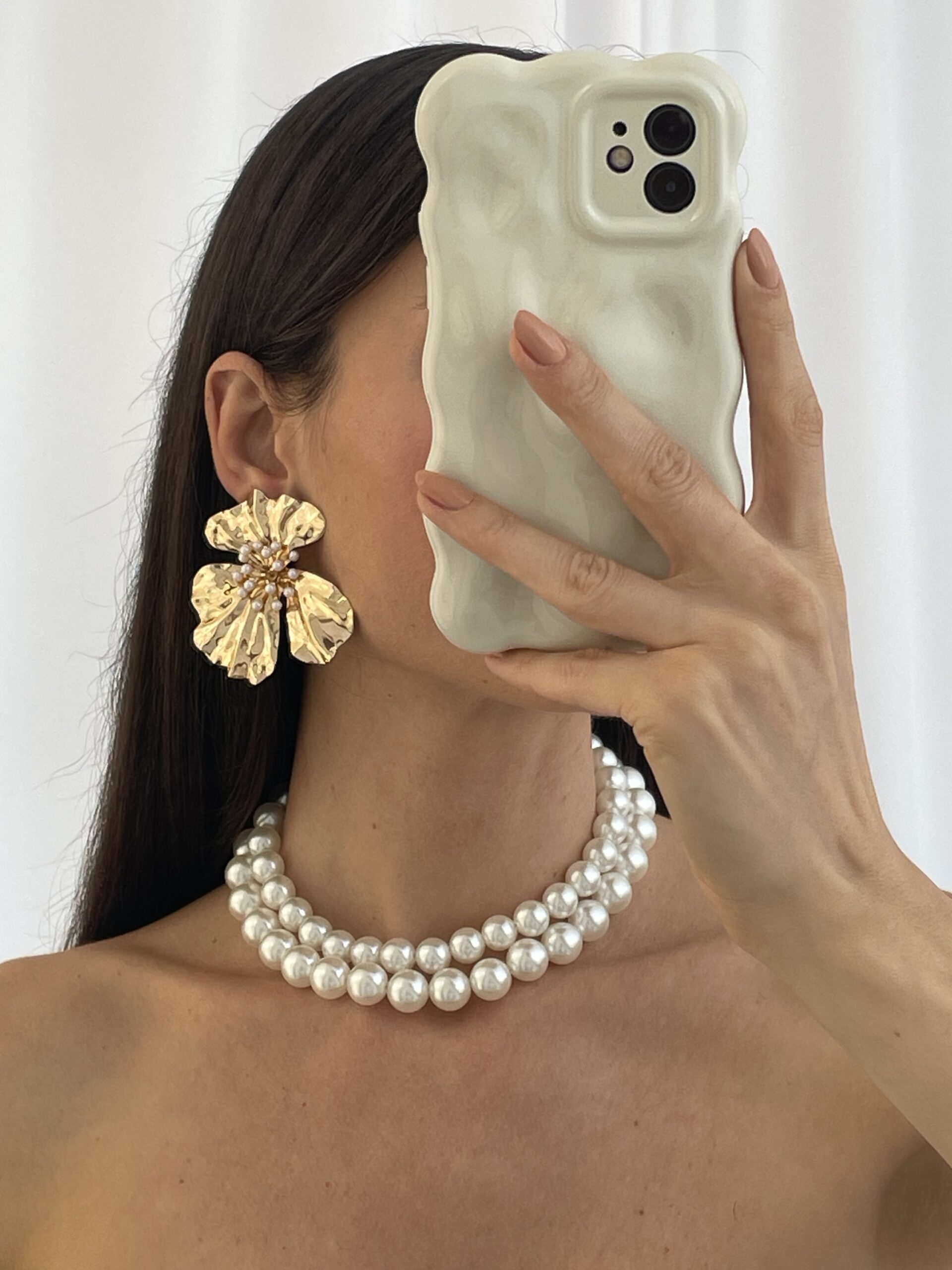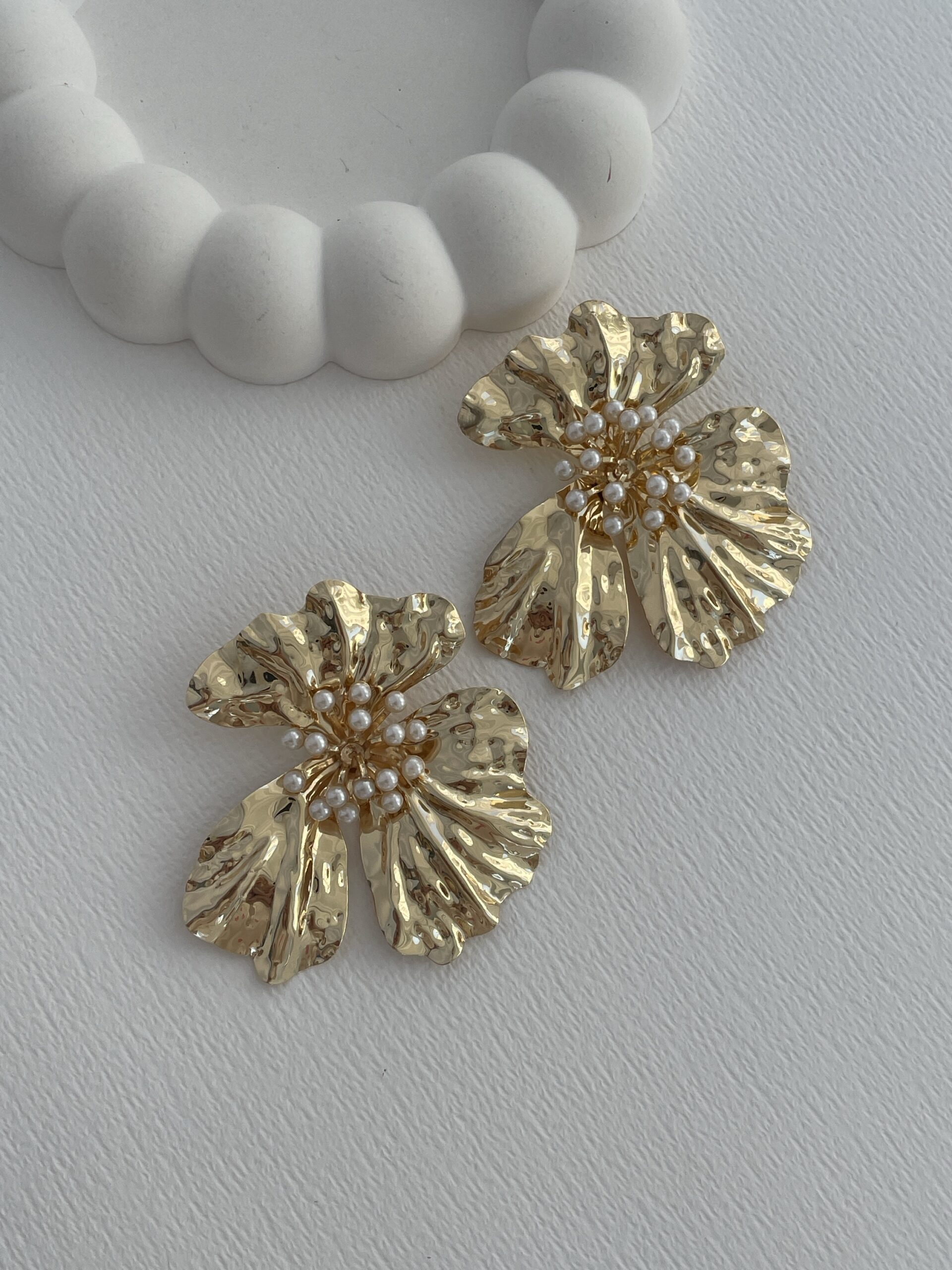 Özel Seri Büyük Çiçek İnci Detay Gold Küpe