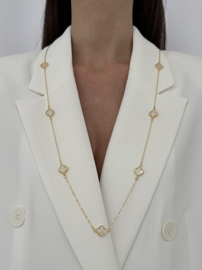 Özel Seri Çift Taraflı Sedefli Yedi Yonca Tasarım Gold Kolye 60cm