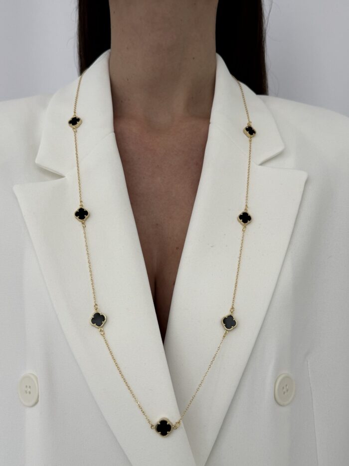 Özel Seri Çift Taraflı Siyah Mineli Yedi Yonca Tasarım Gold Kolye 60cm