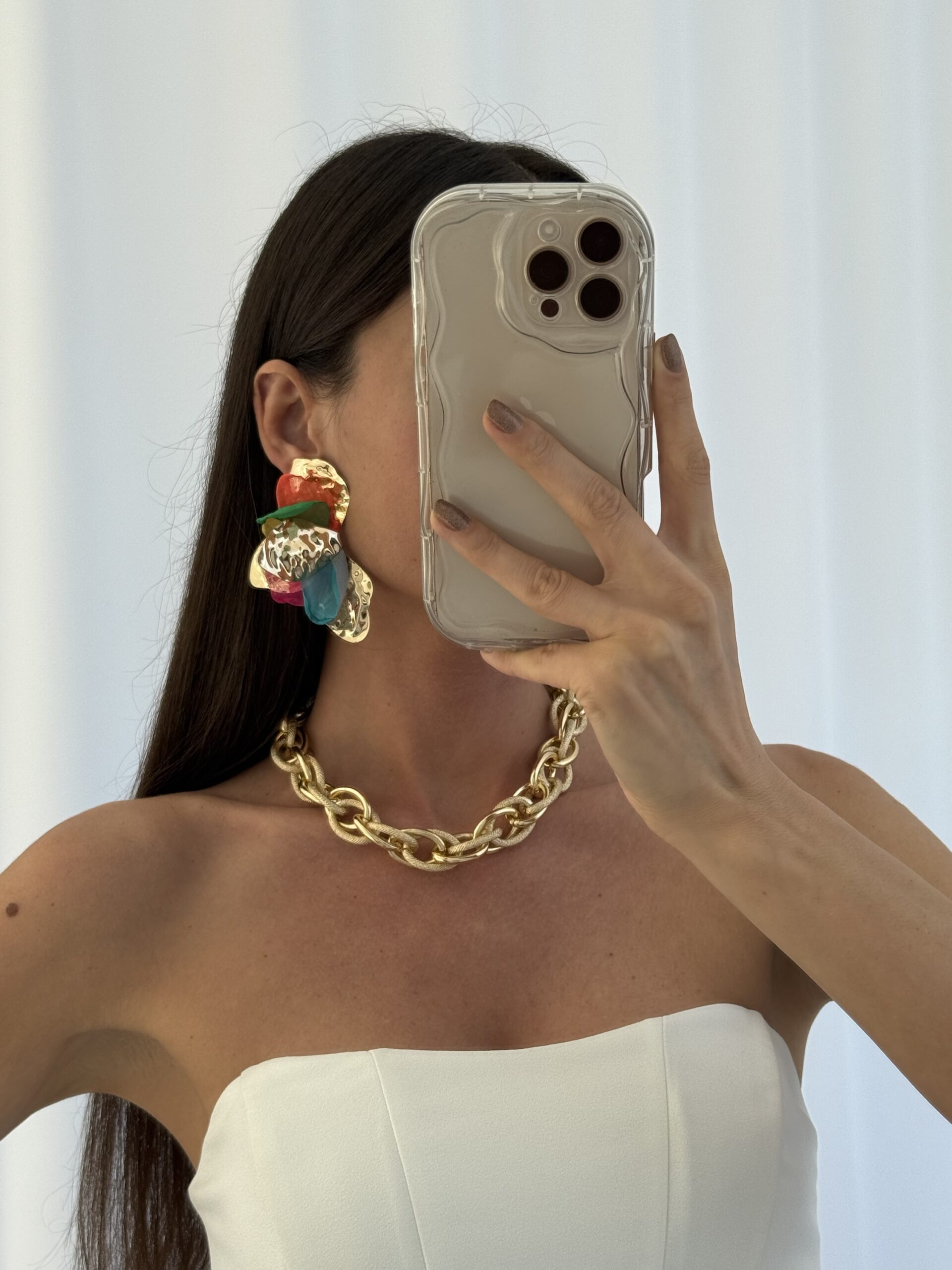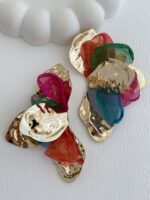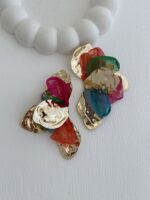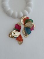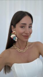 Özel Seri Çok Renkli Tül Detay Yaprak Tasarım Gold Küpe