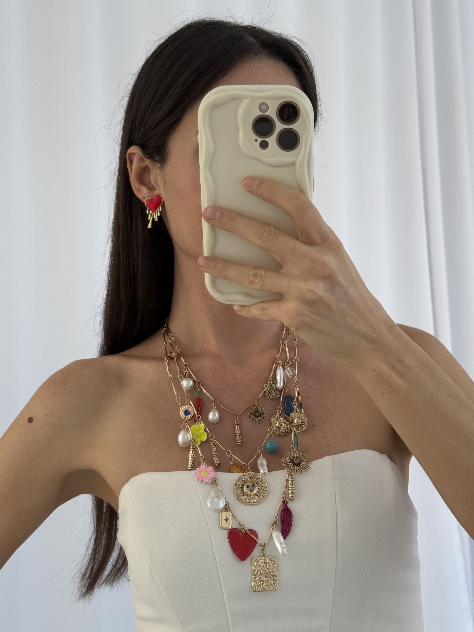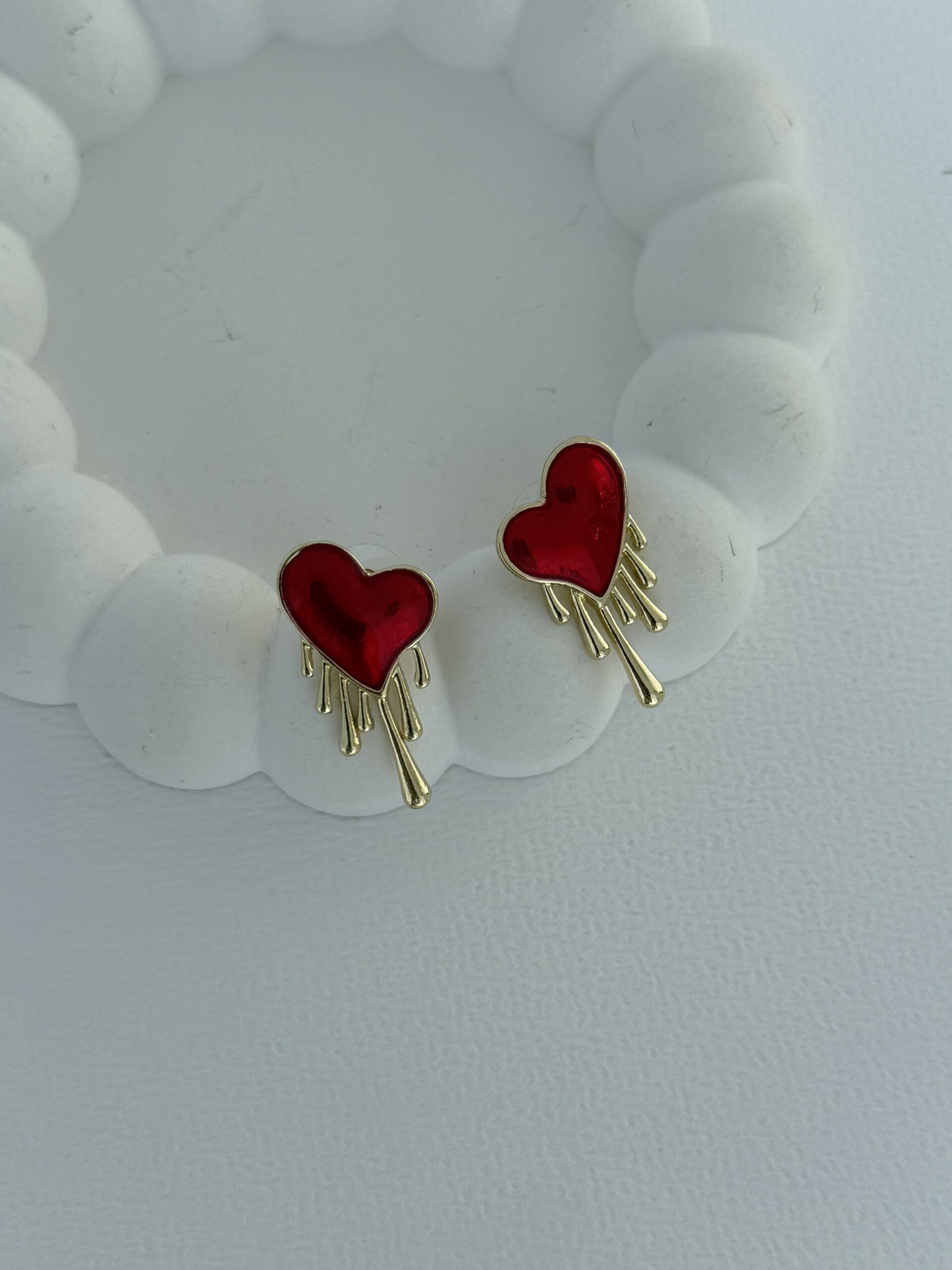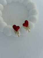 Özel Seri Damla Detay Kırmızı Kalp Tasarım Gold Küpe