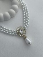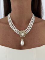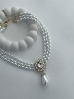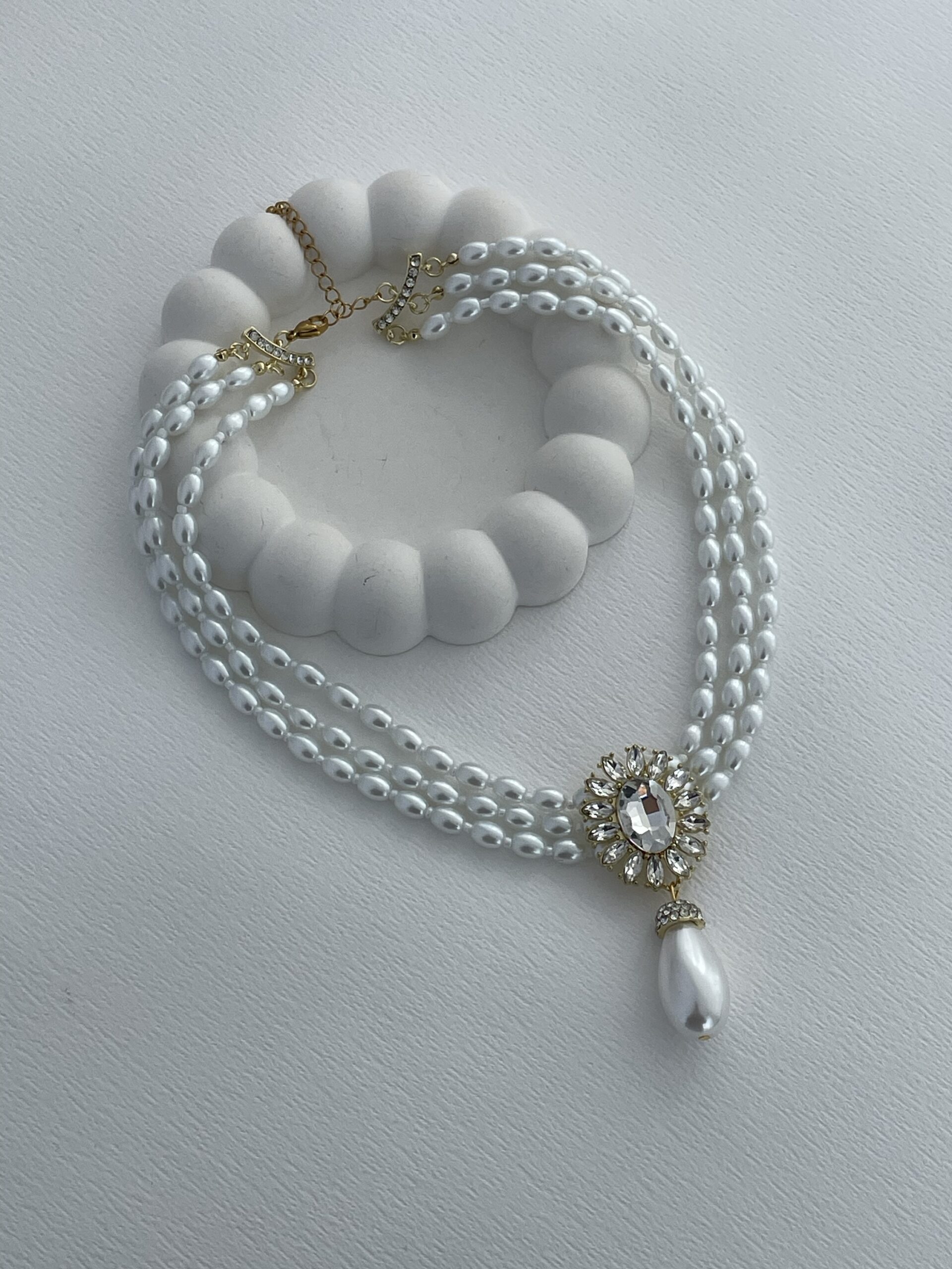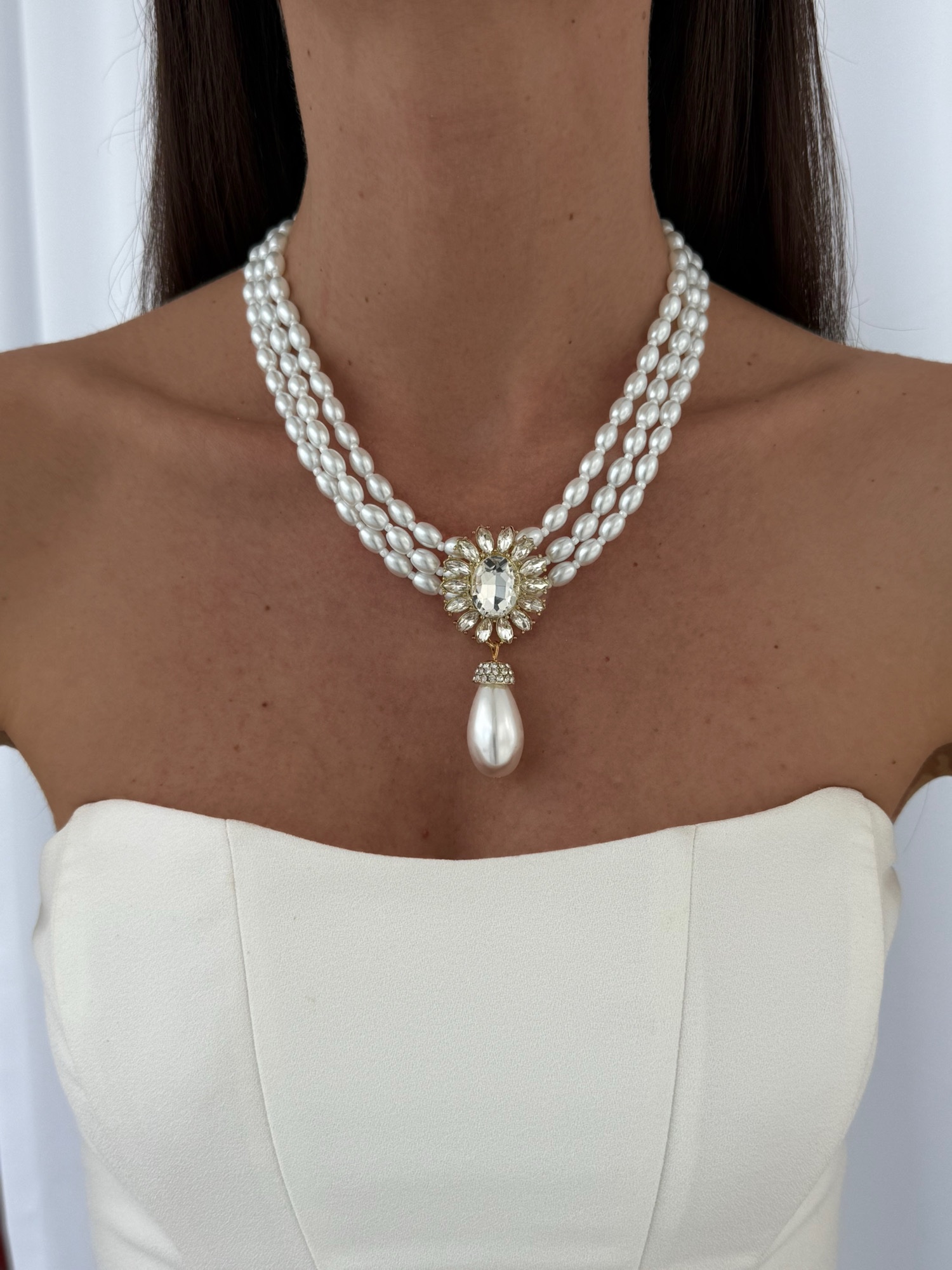 Özel Seri Damla İnci Detay Taşlı Üç Sıra Gold Kolye