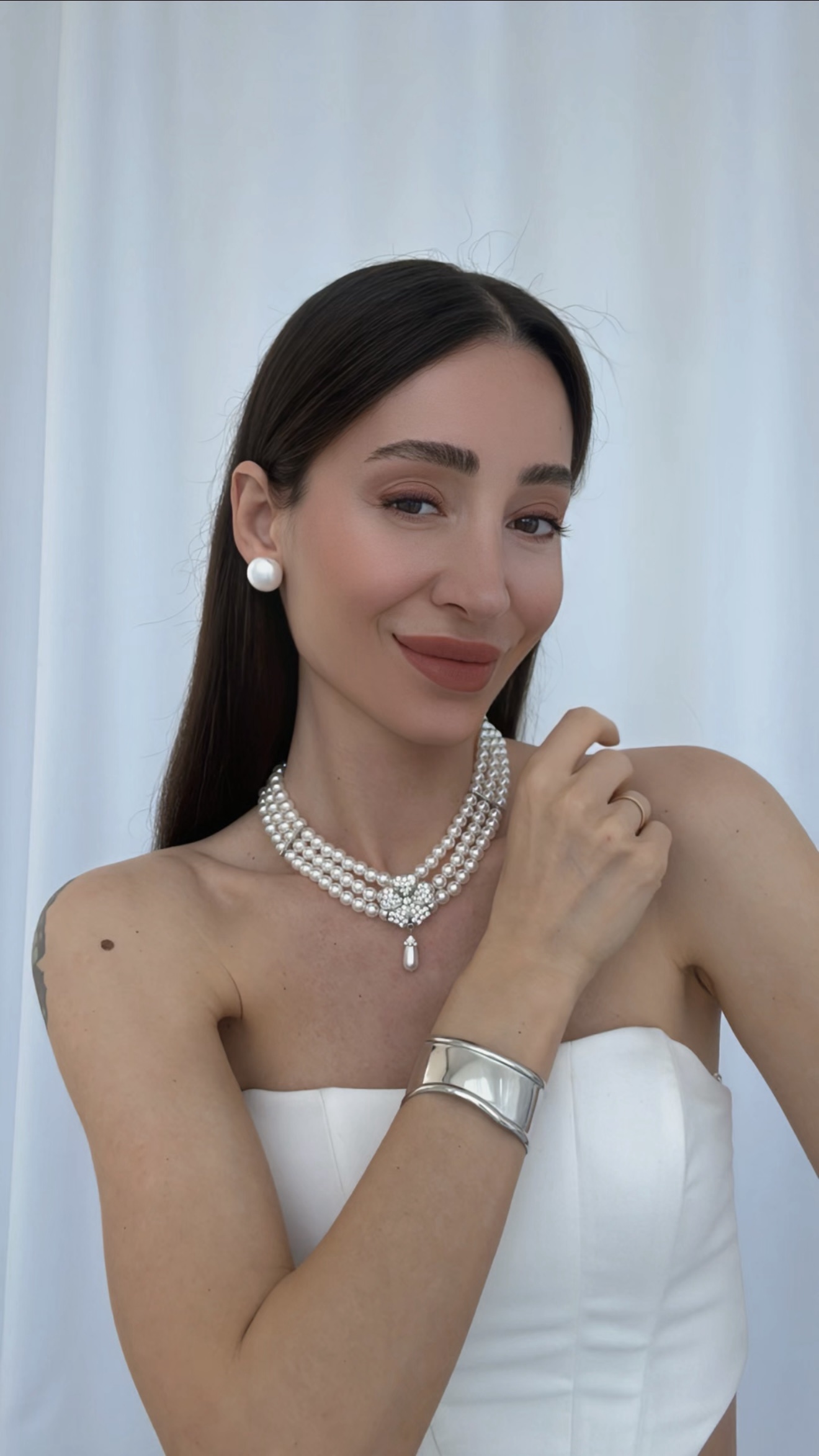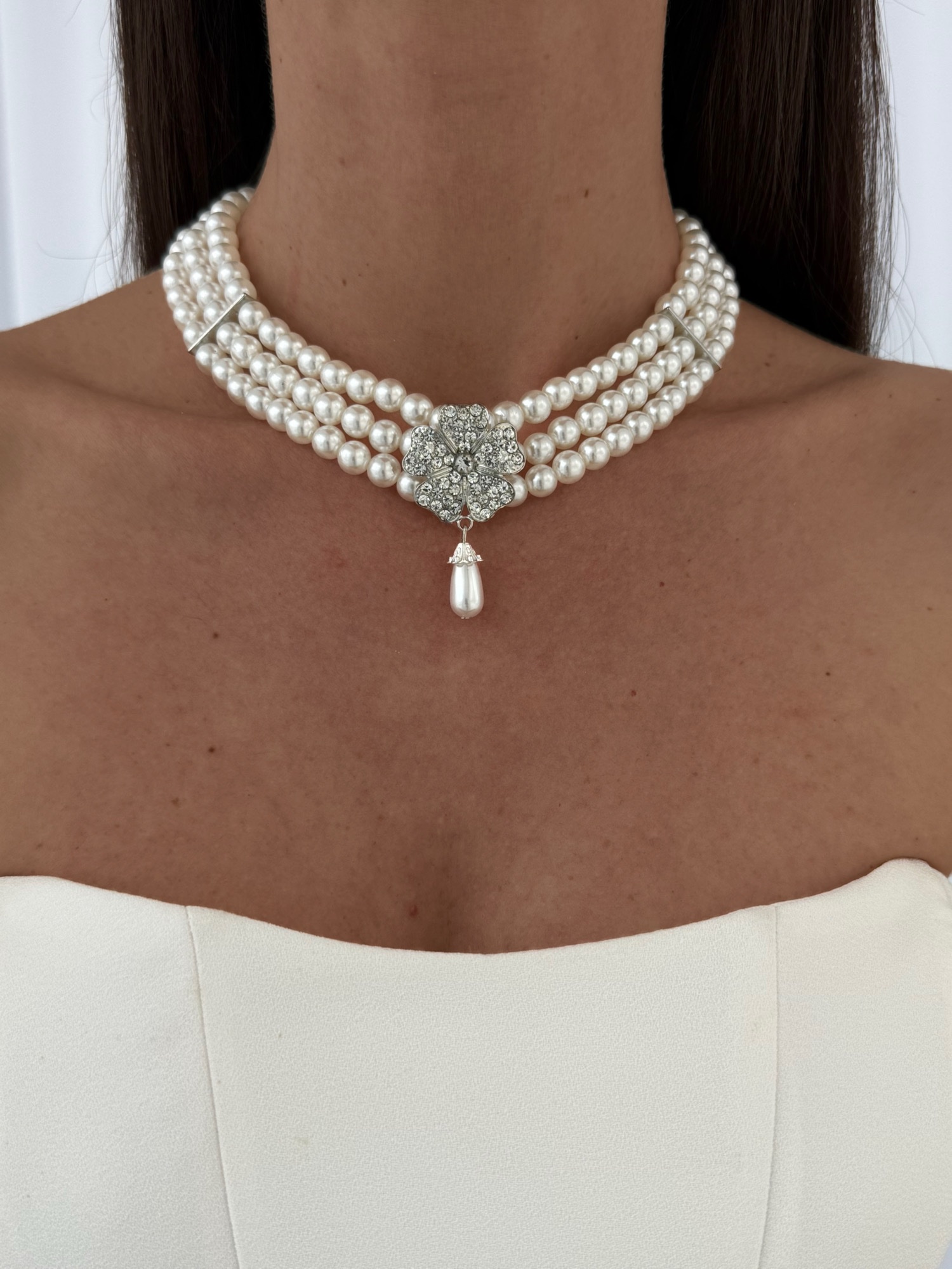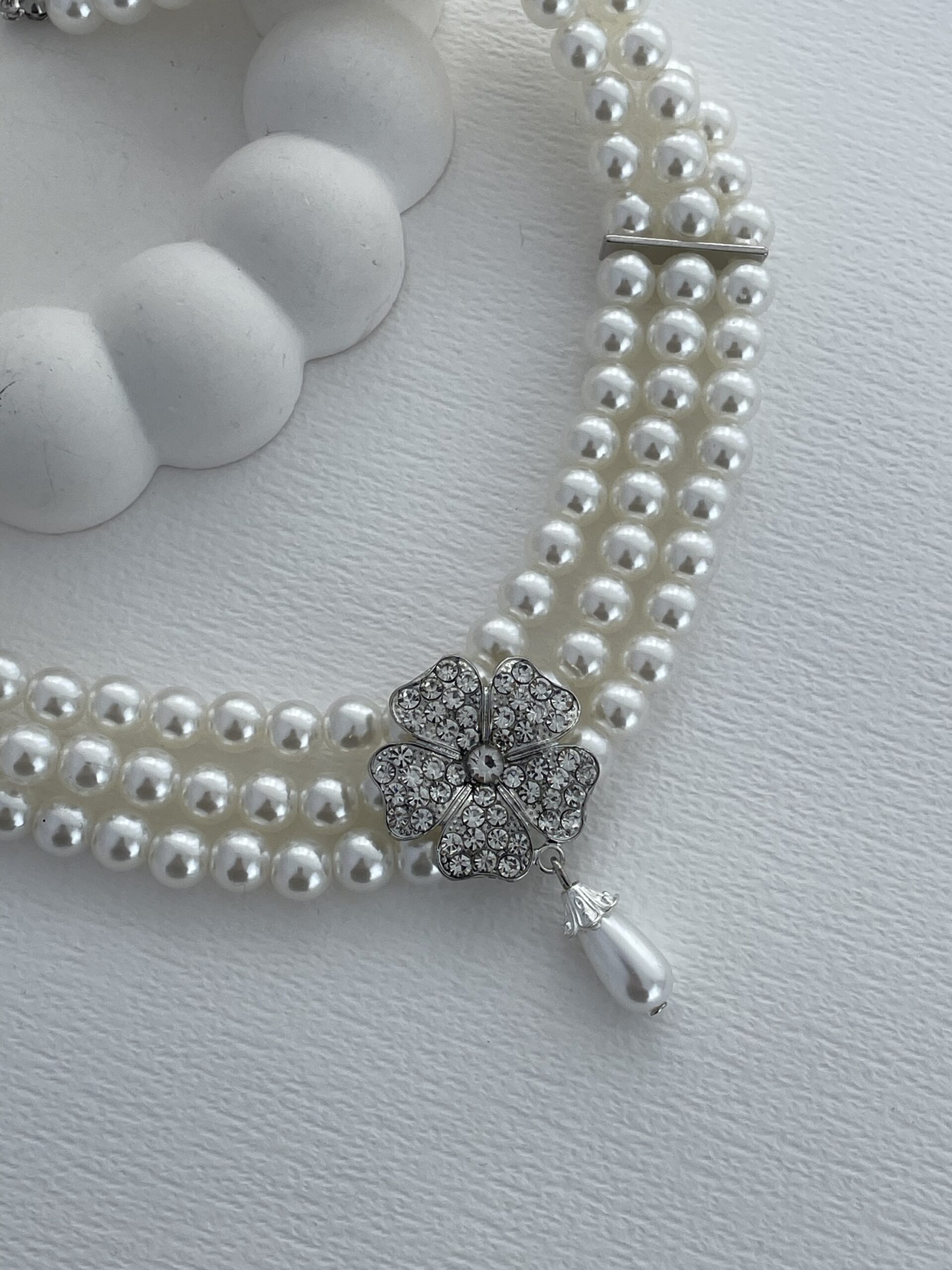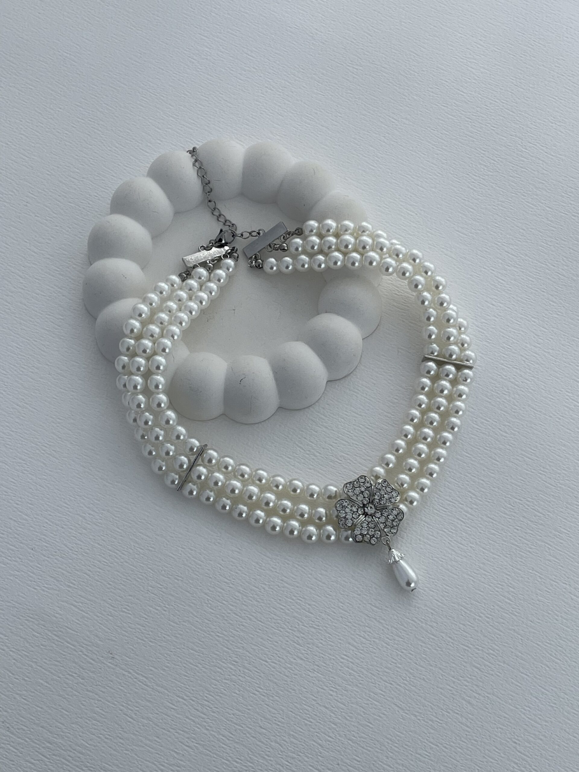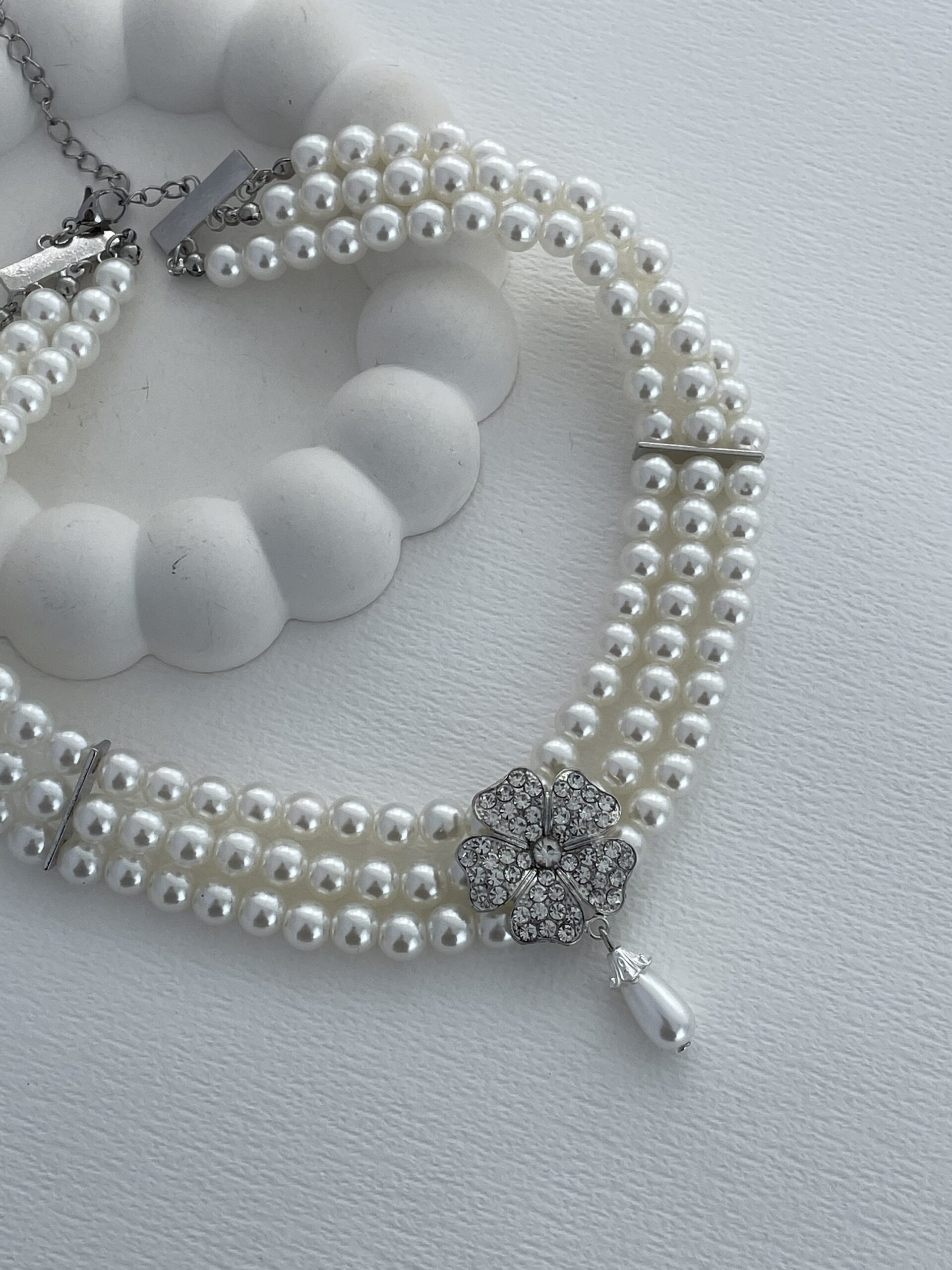 Özel Seri Damla İnci Detay Taşlı Yonca Tasarım Üç Sıra Gümüş Kolye