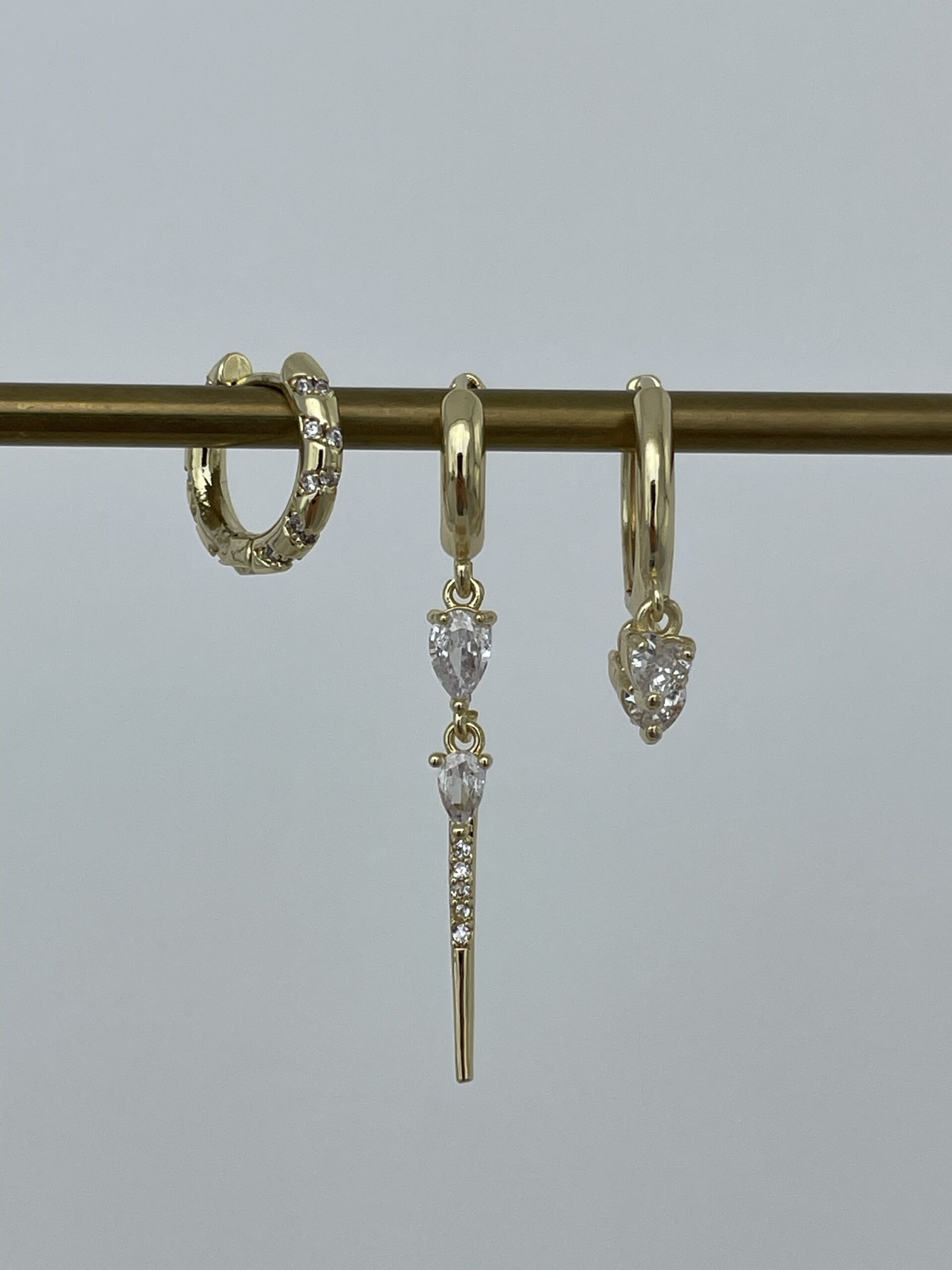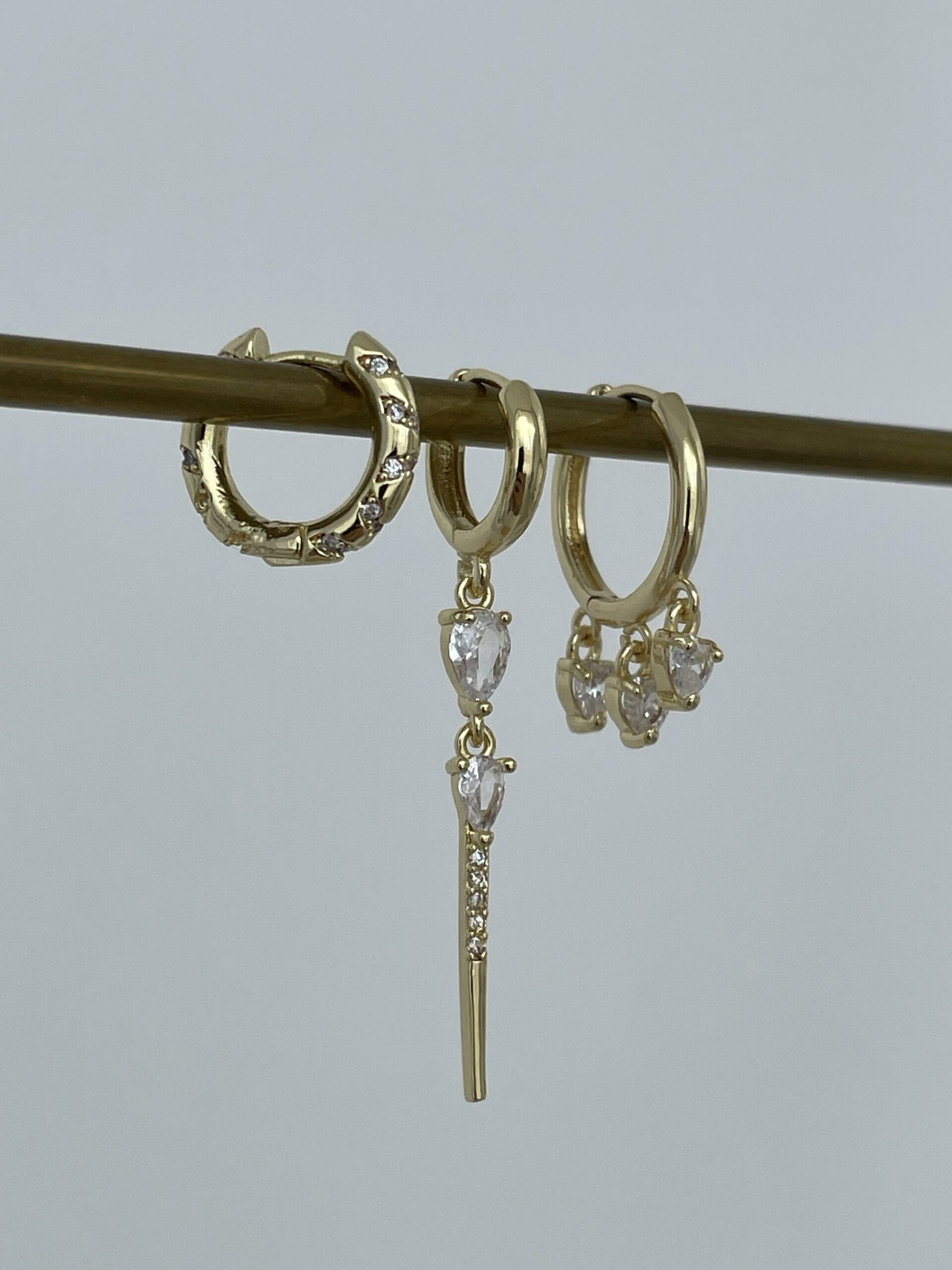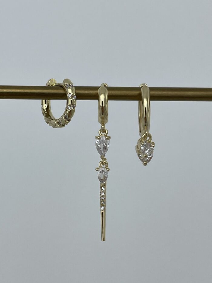 Özel Seri Damla & Kalp Taş Tasarım Gold Üçlü Küpe Set