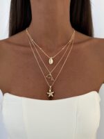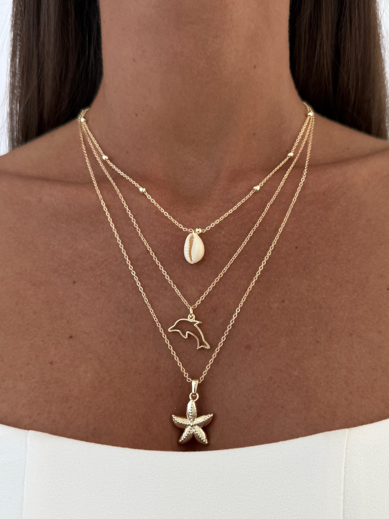 Özel Seri Deniz Yıldızı & Kabuğu Tasarım Gold Üçlü Kolye