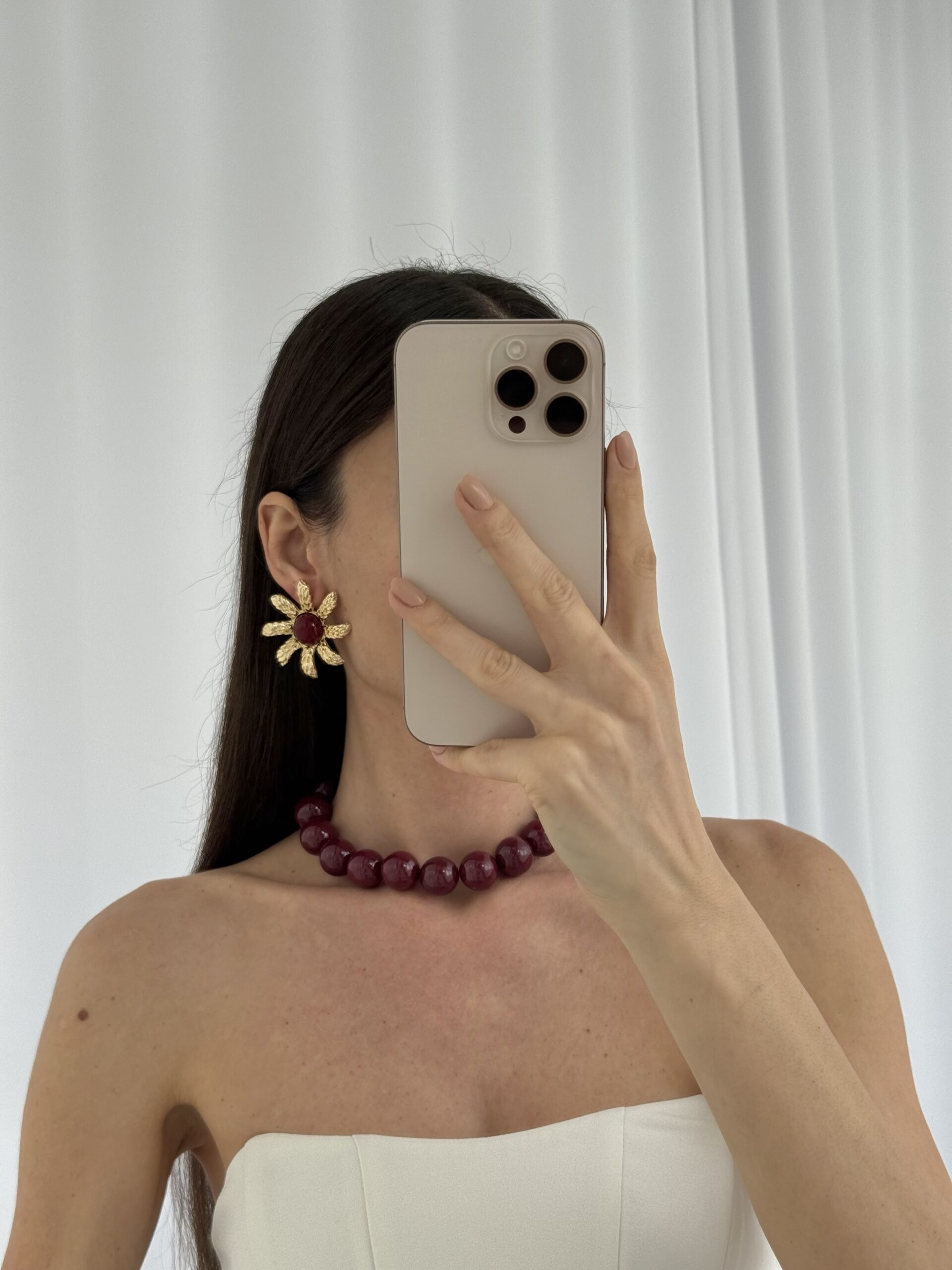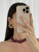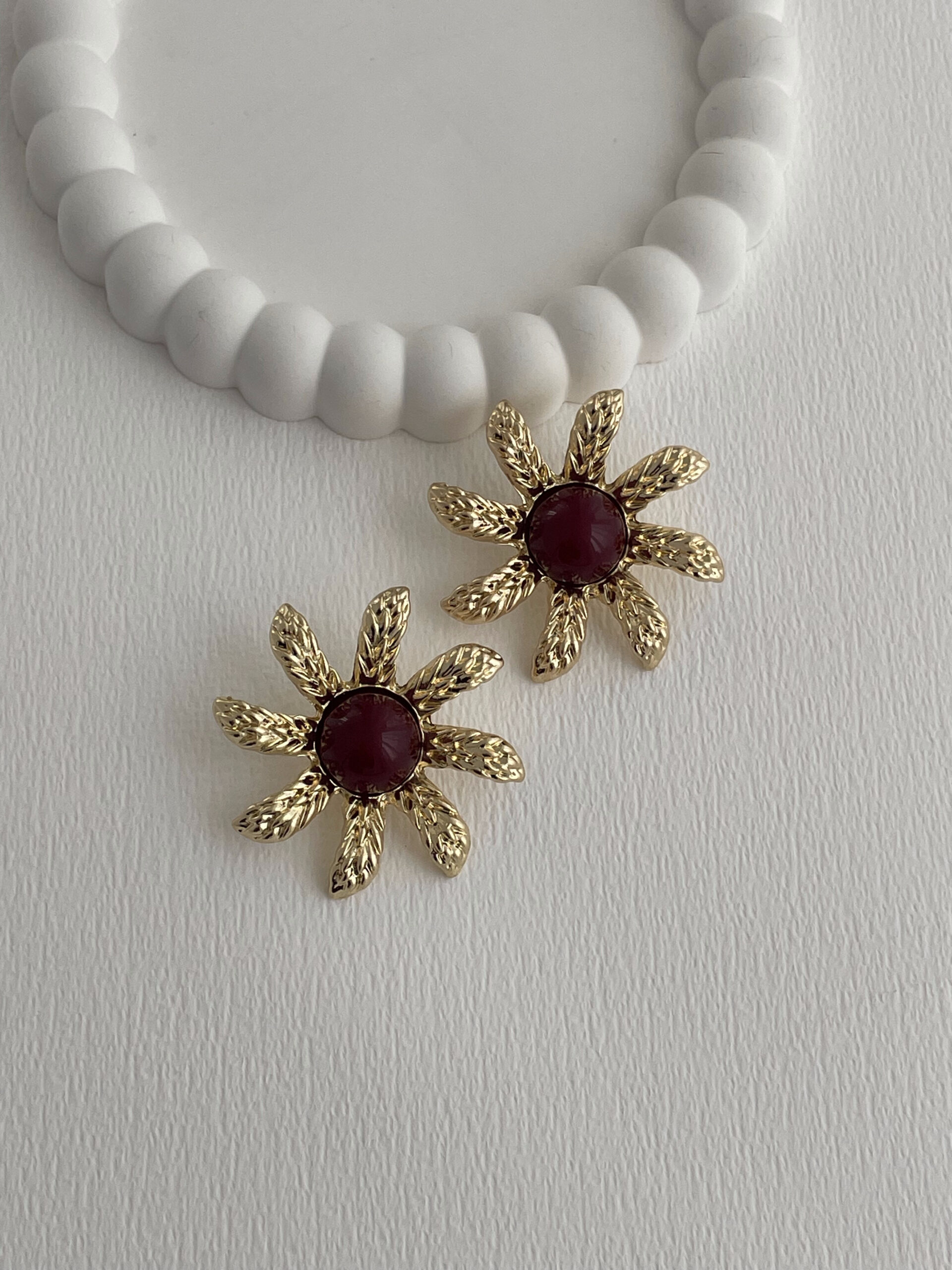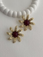 Özel Seri Desenli Çiçek Tasarım Bordo Mineli Gold Küpe