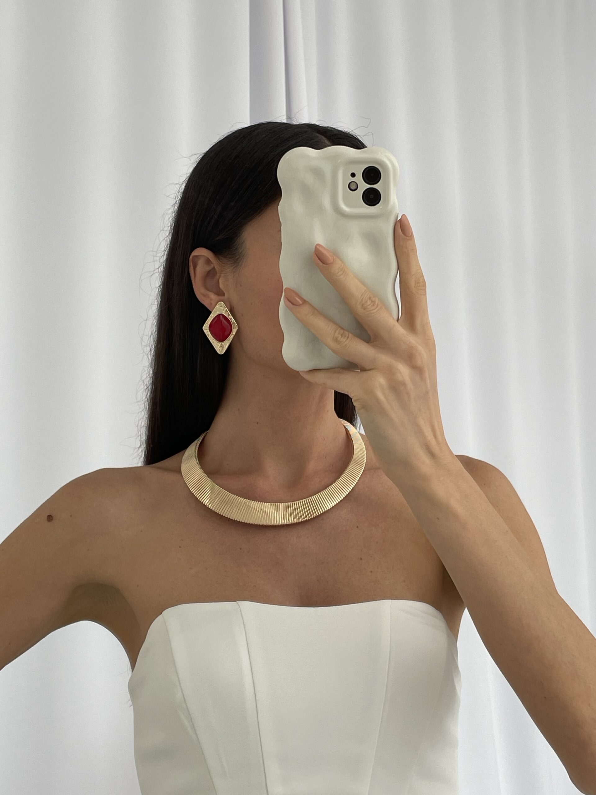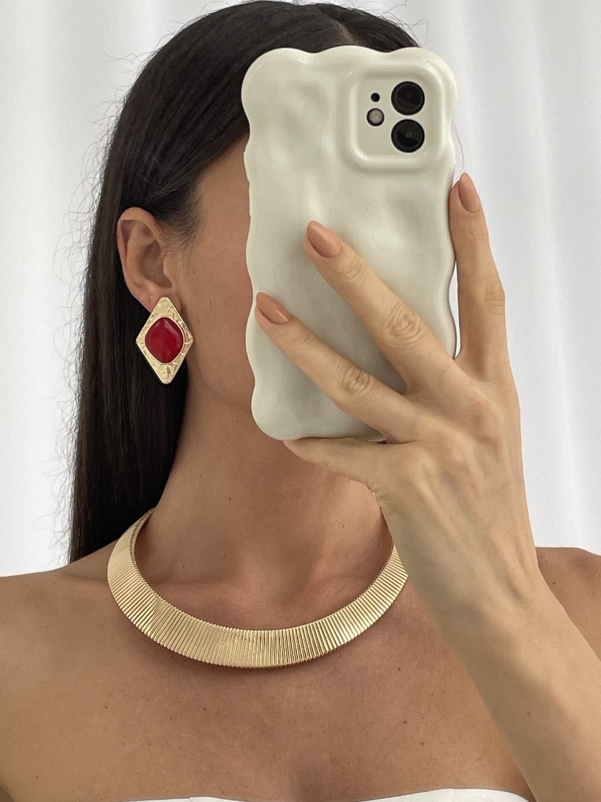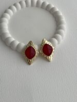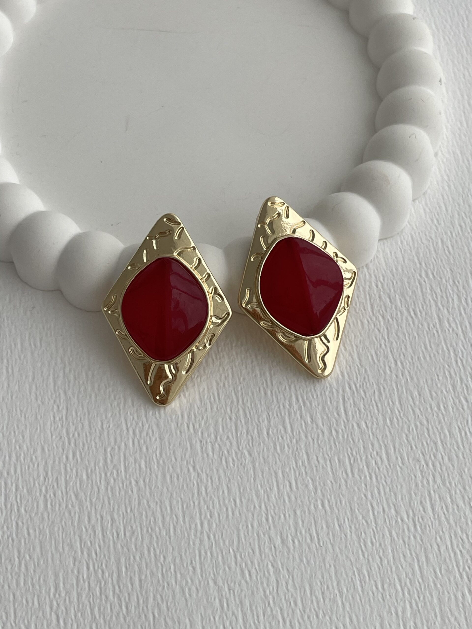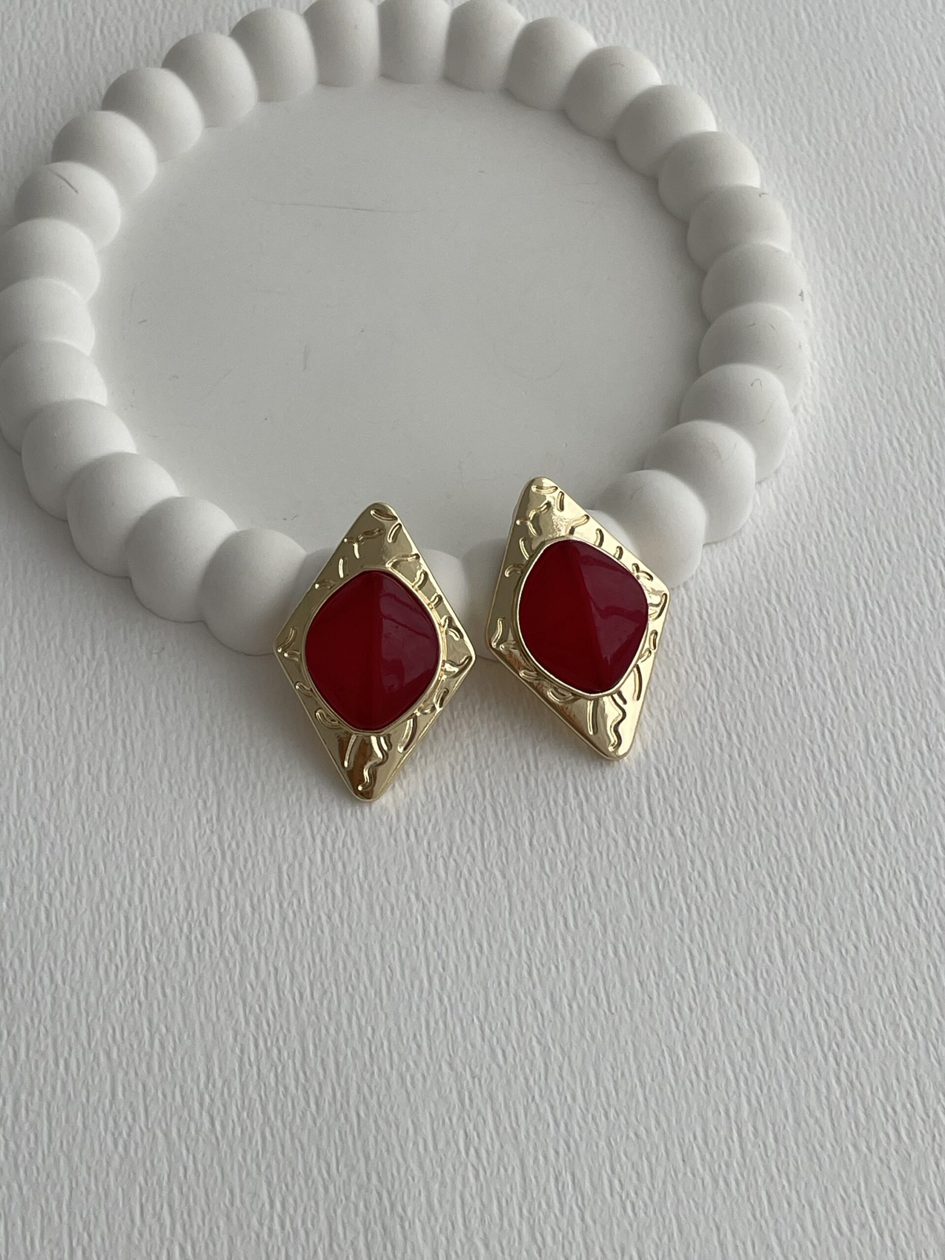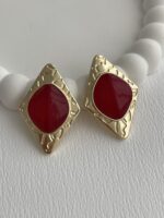 Özel Seri Desenli Geometrik Tasarım Bordo Mineli Gold Küpe