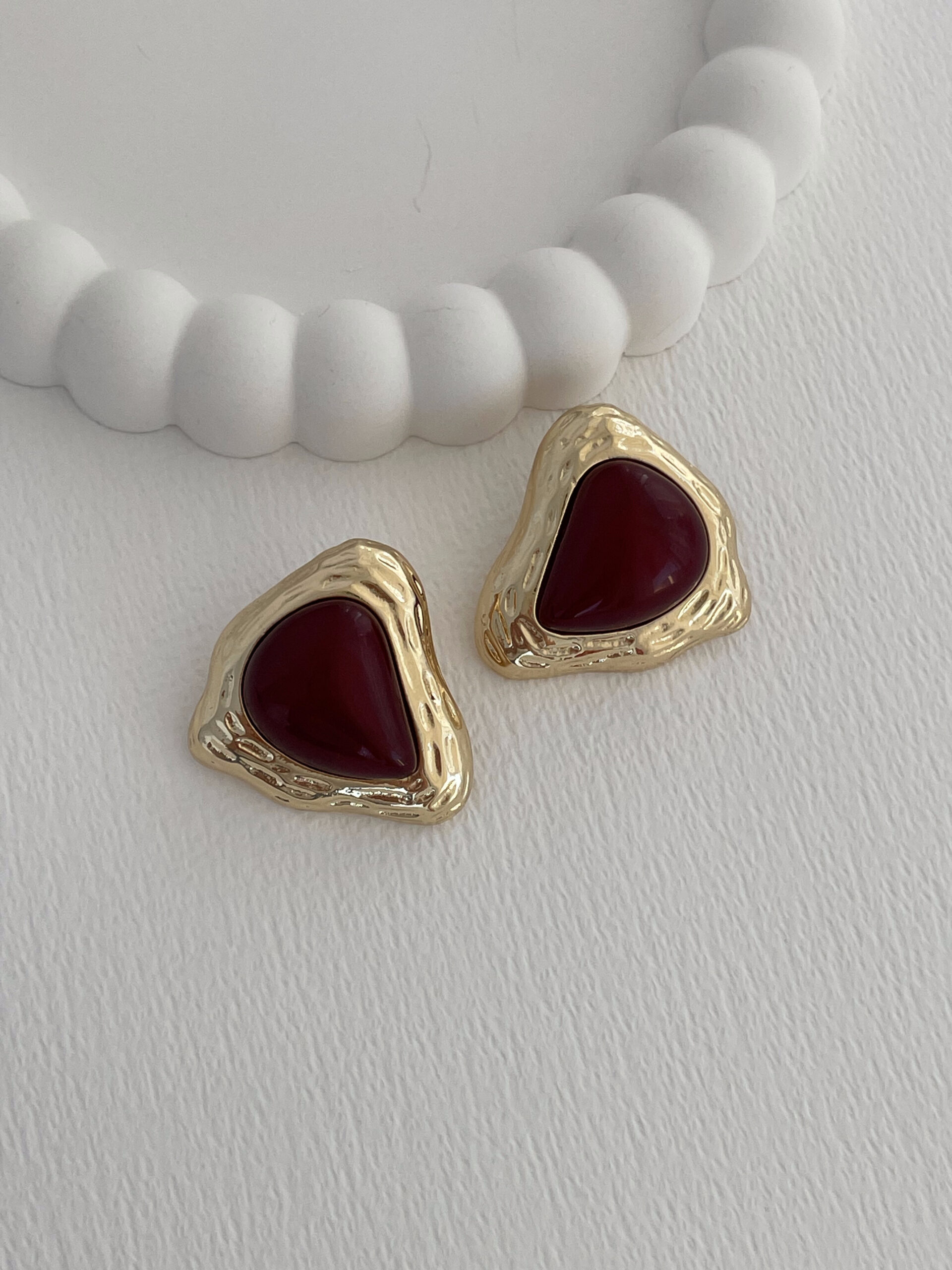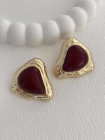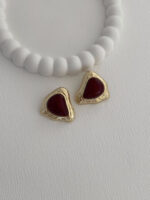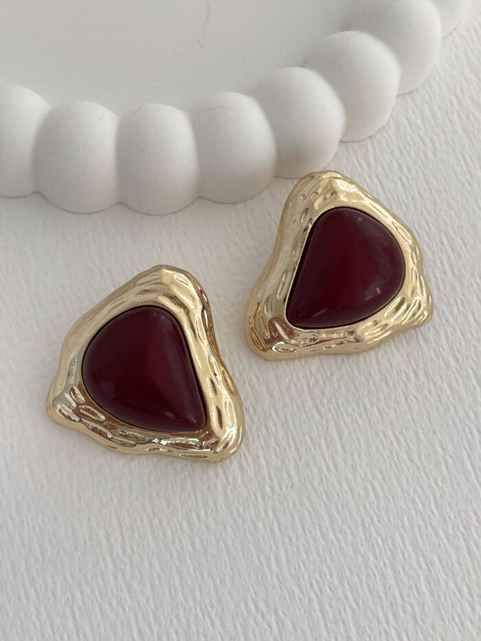 Özel Seri Desenli Üçgen Tasarım Bordo Mineli Gold Küpe