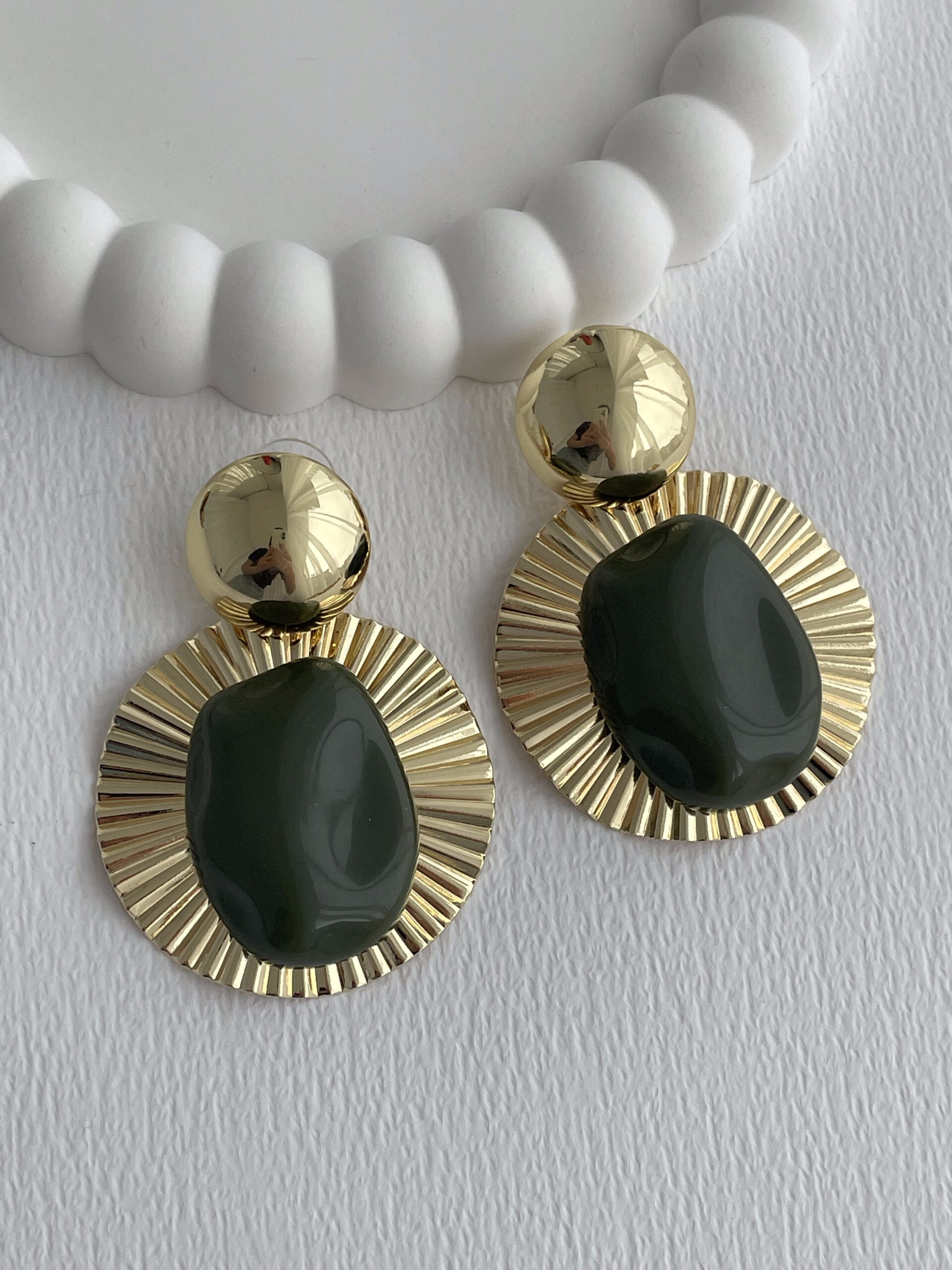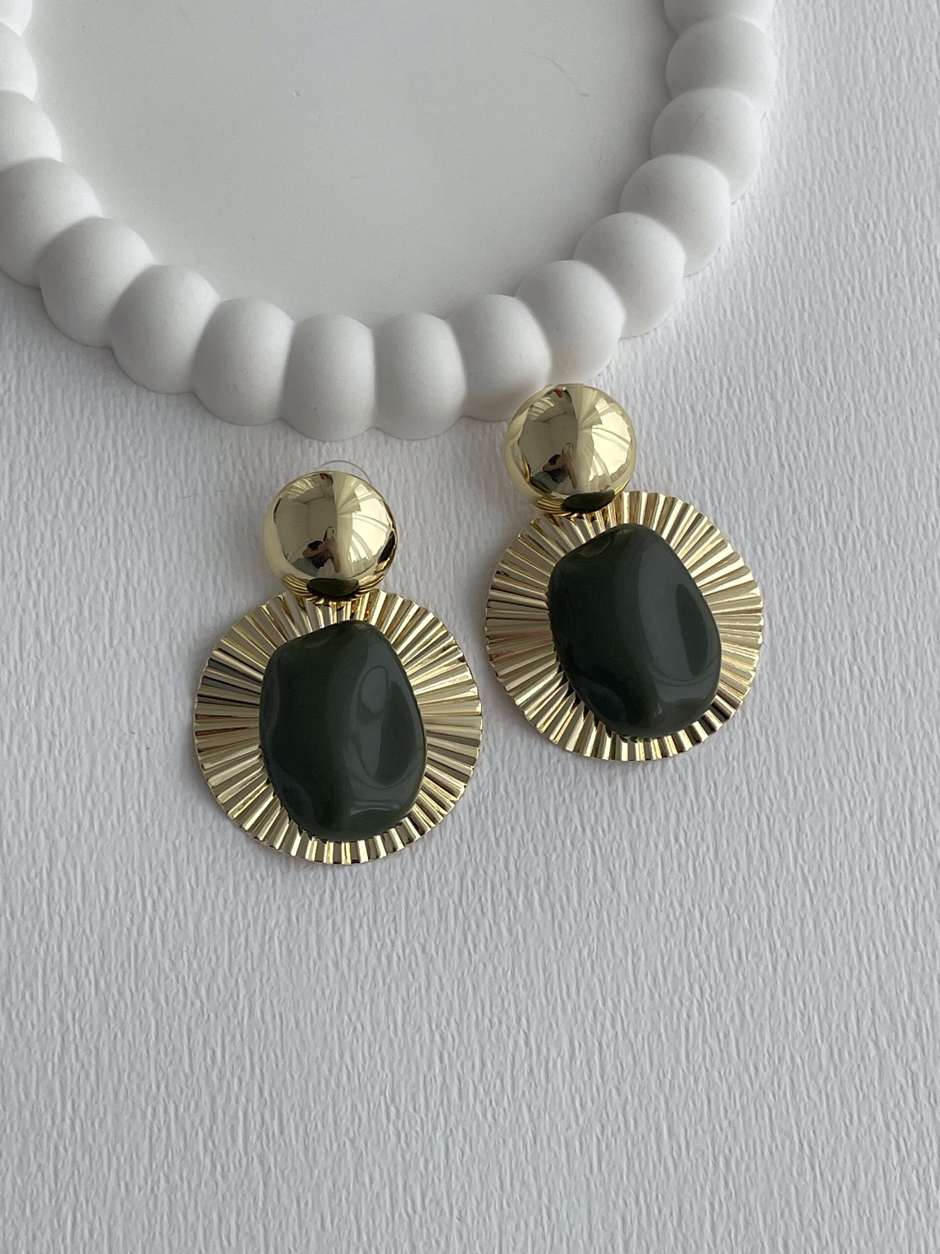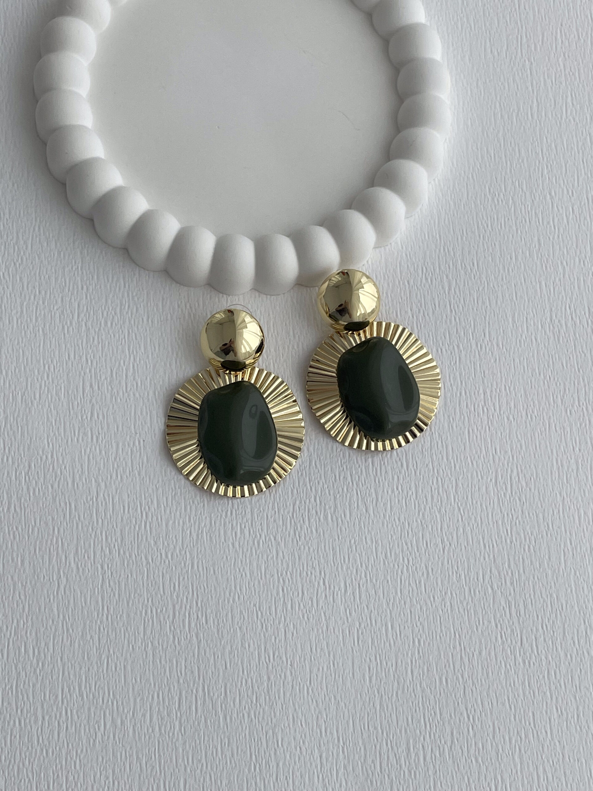 Özel Seri Haki Yeşil Mineli Tırtıklı Yuvarlak Gold Küpe
