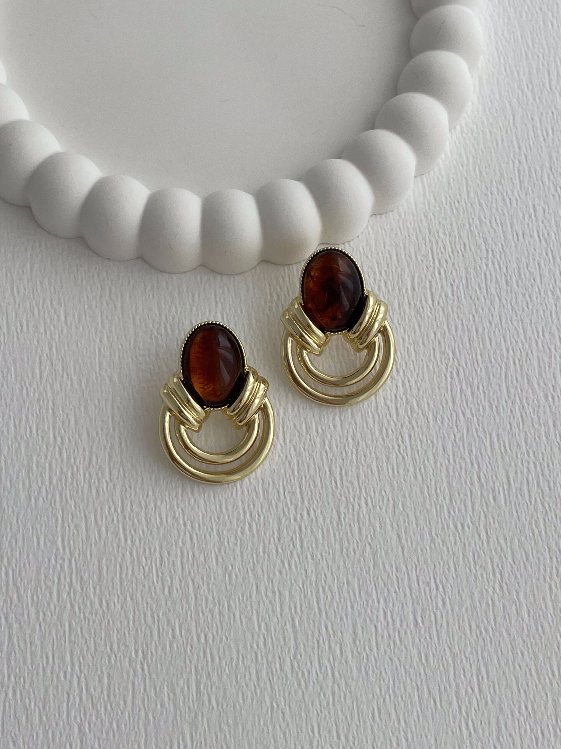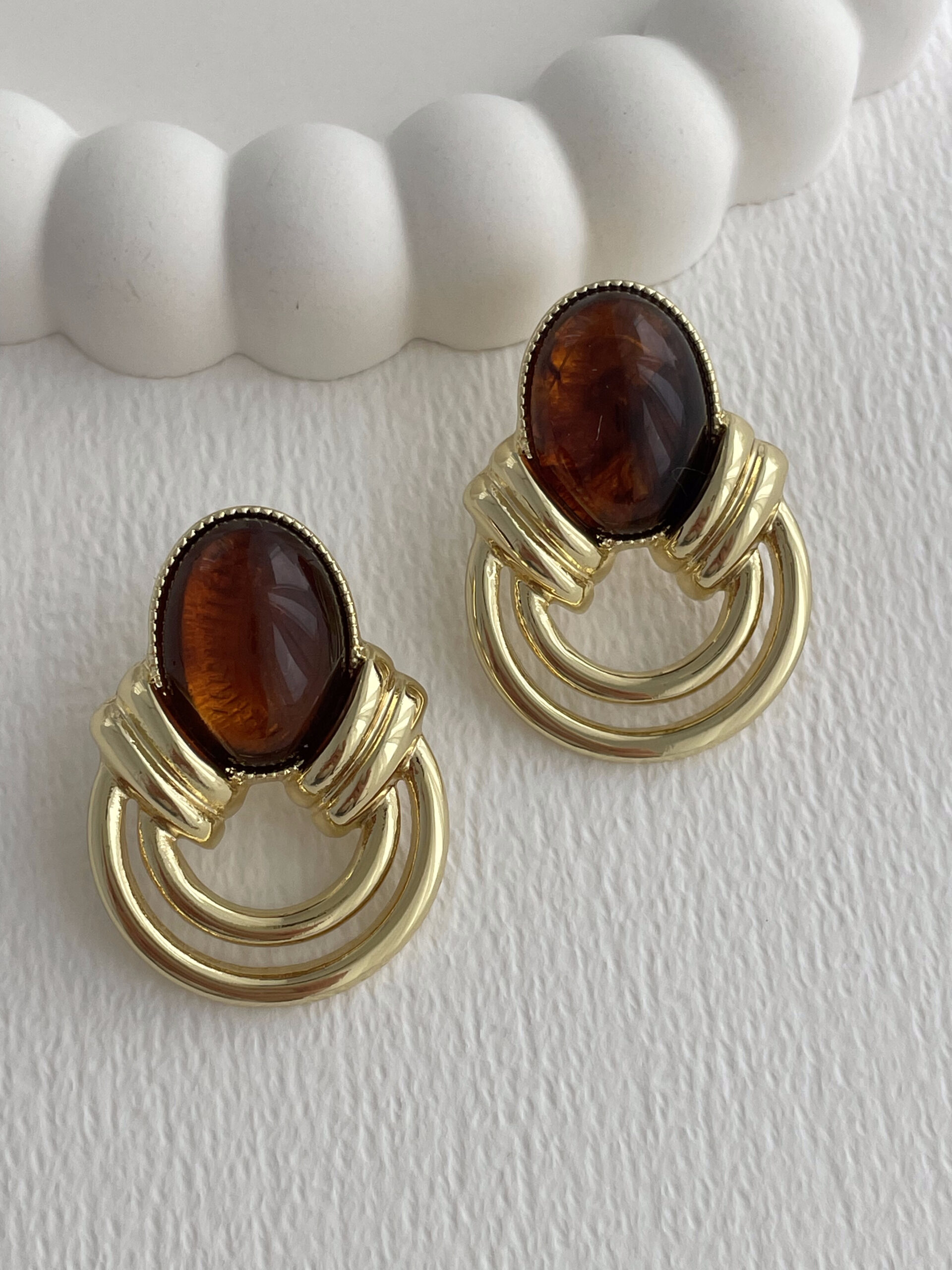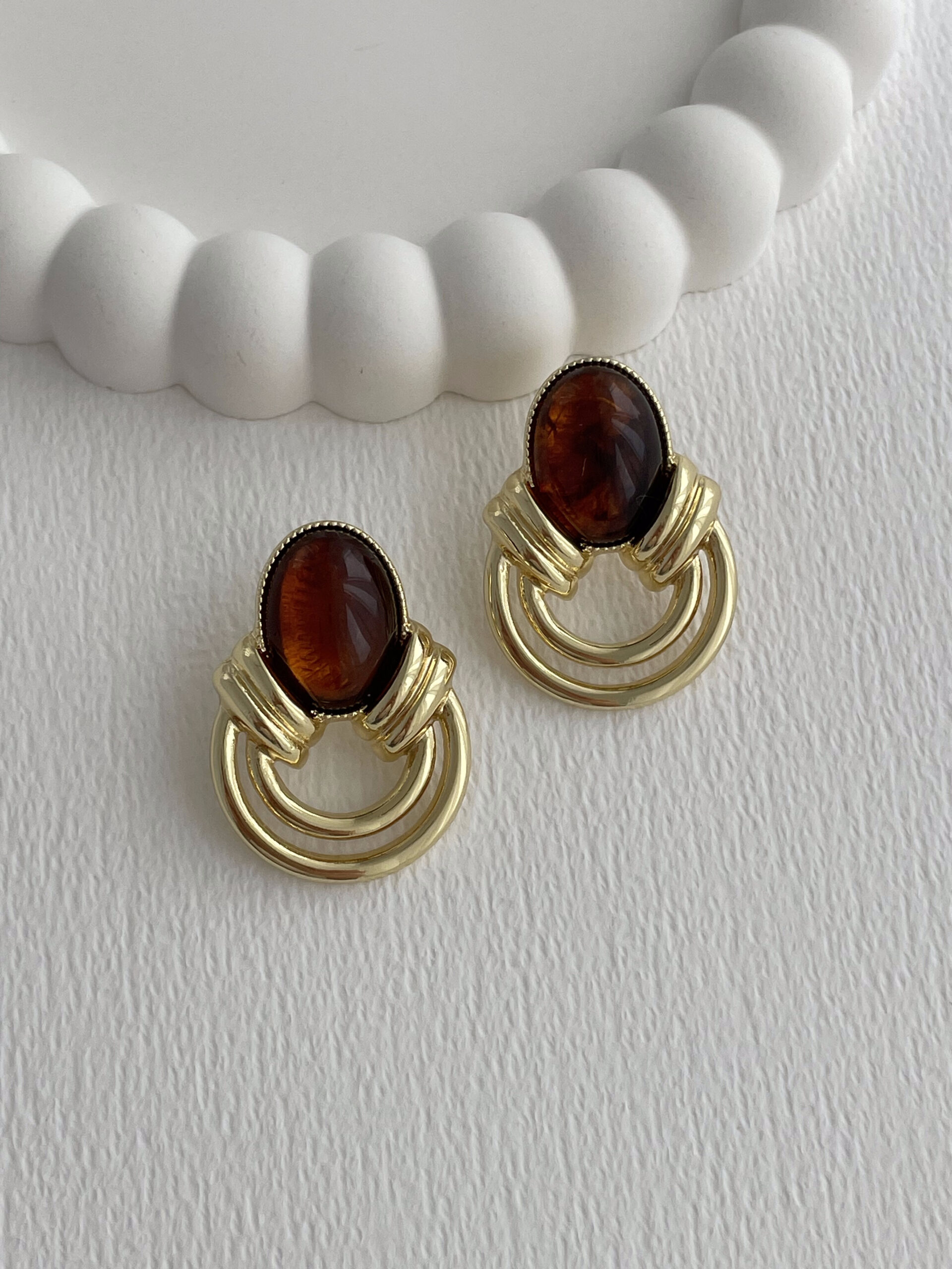 Özel Seri Halka Tasarım Kahverengi Mineli Oval Gold Küpe