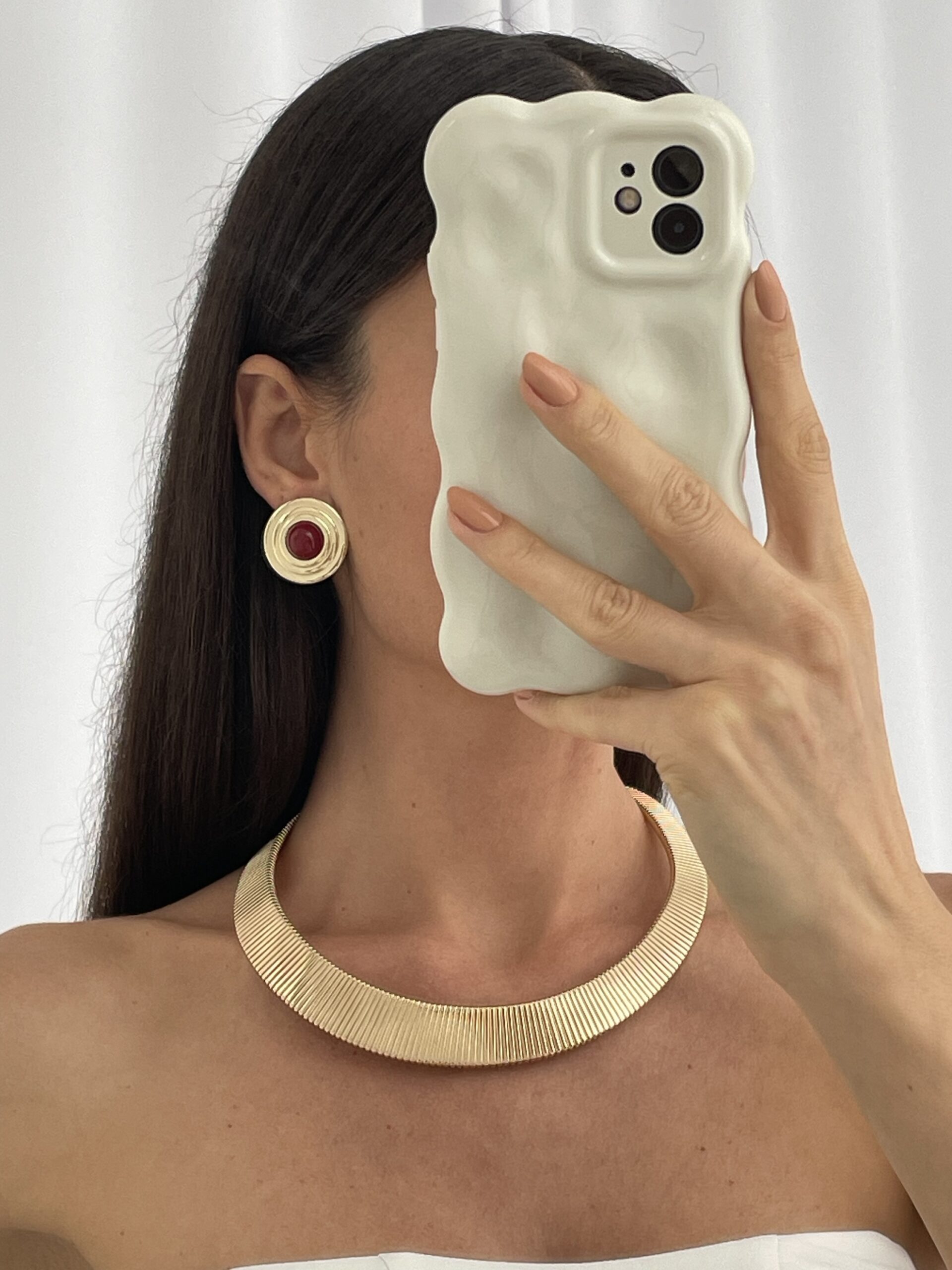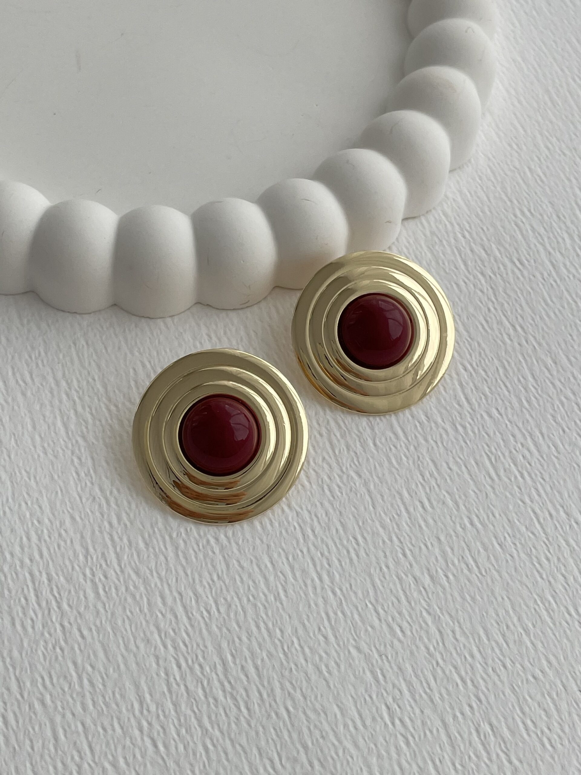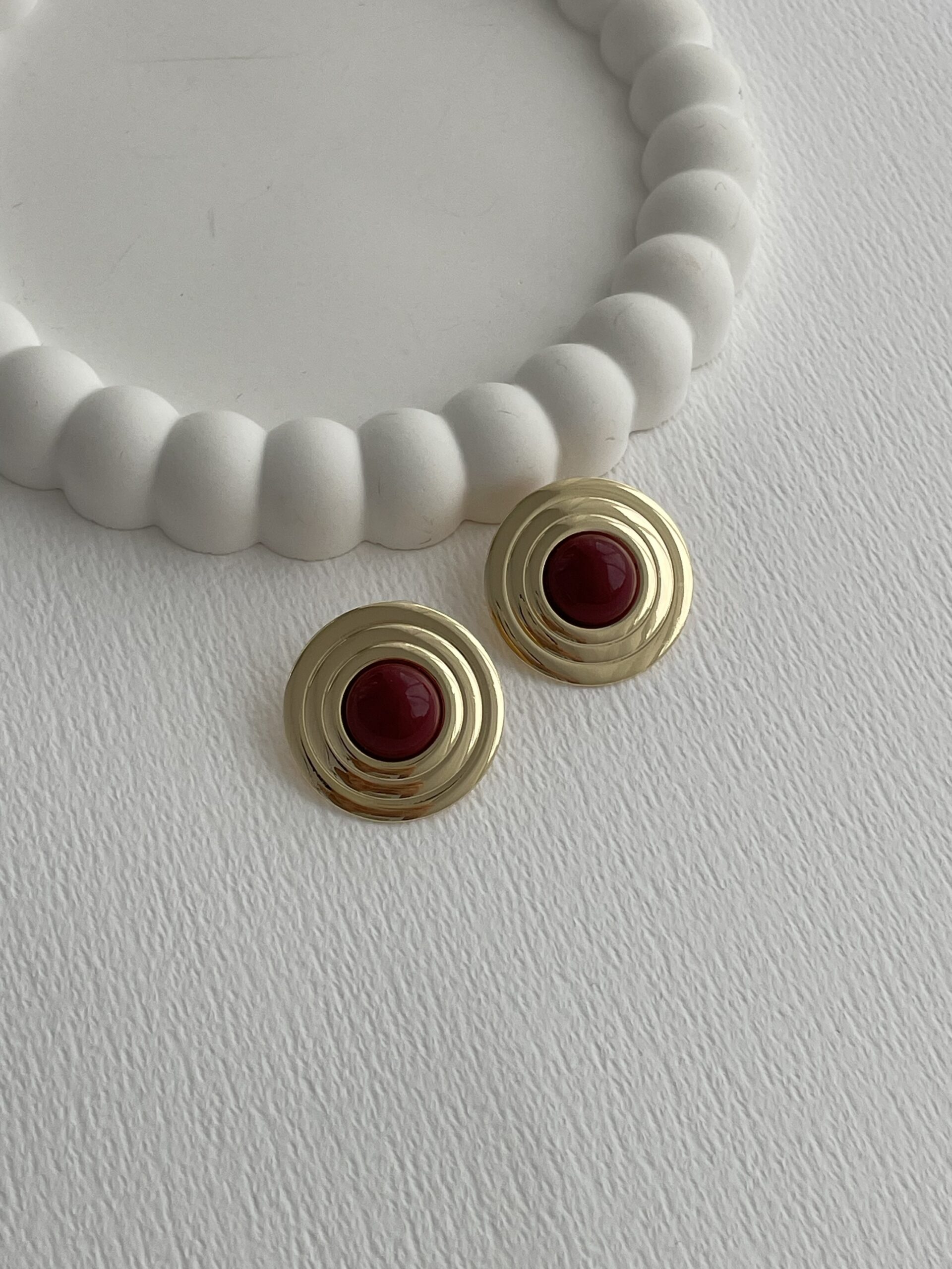 Özel Seri İçe İçe Halka Tasarım Bordo Mineli Gold Küpe