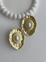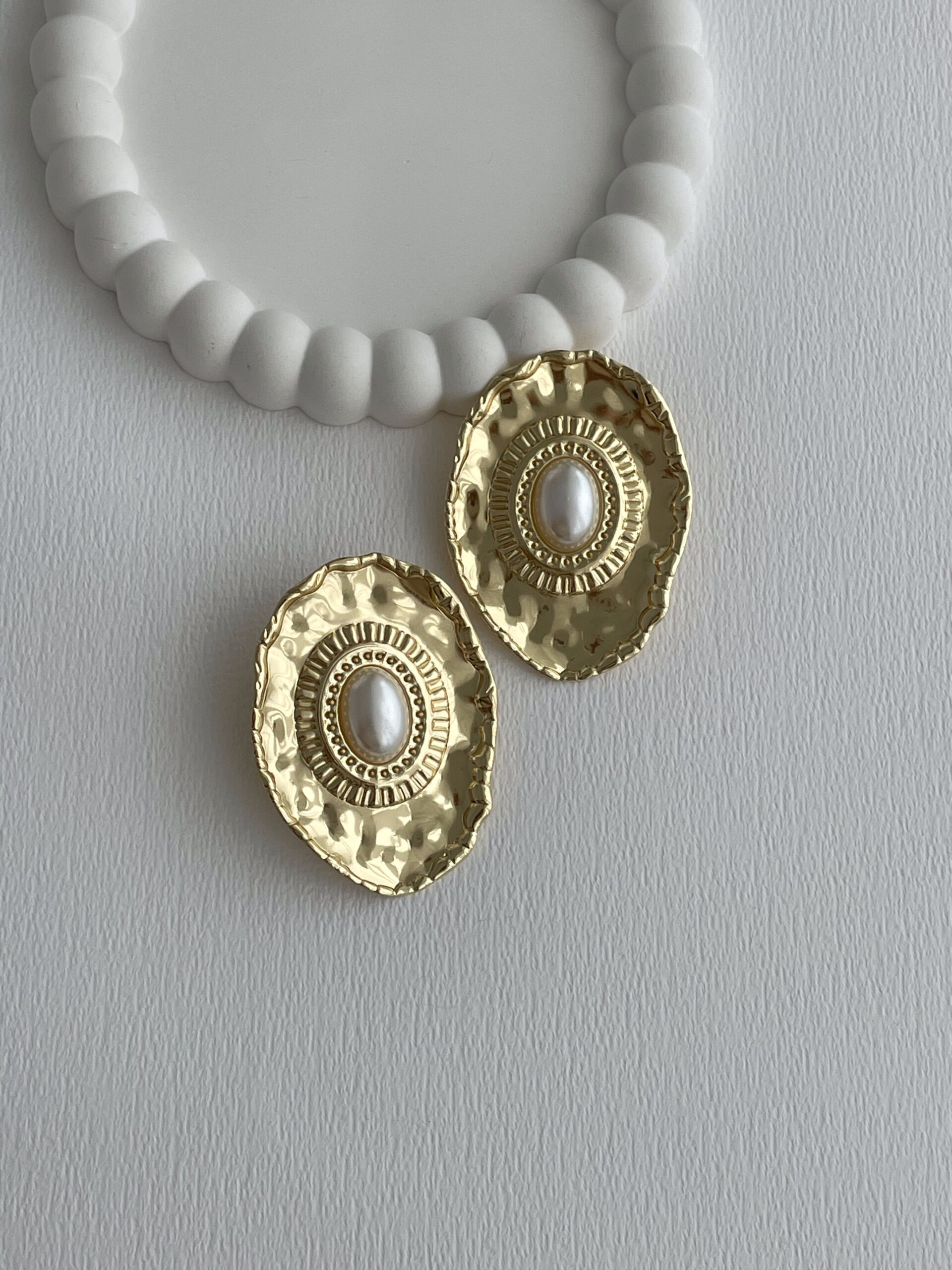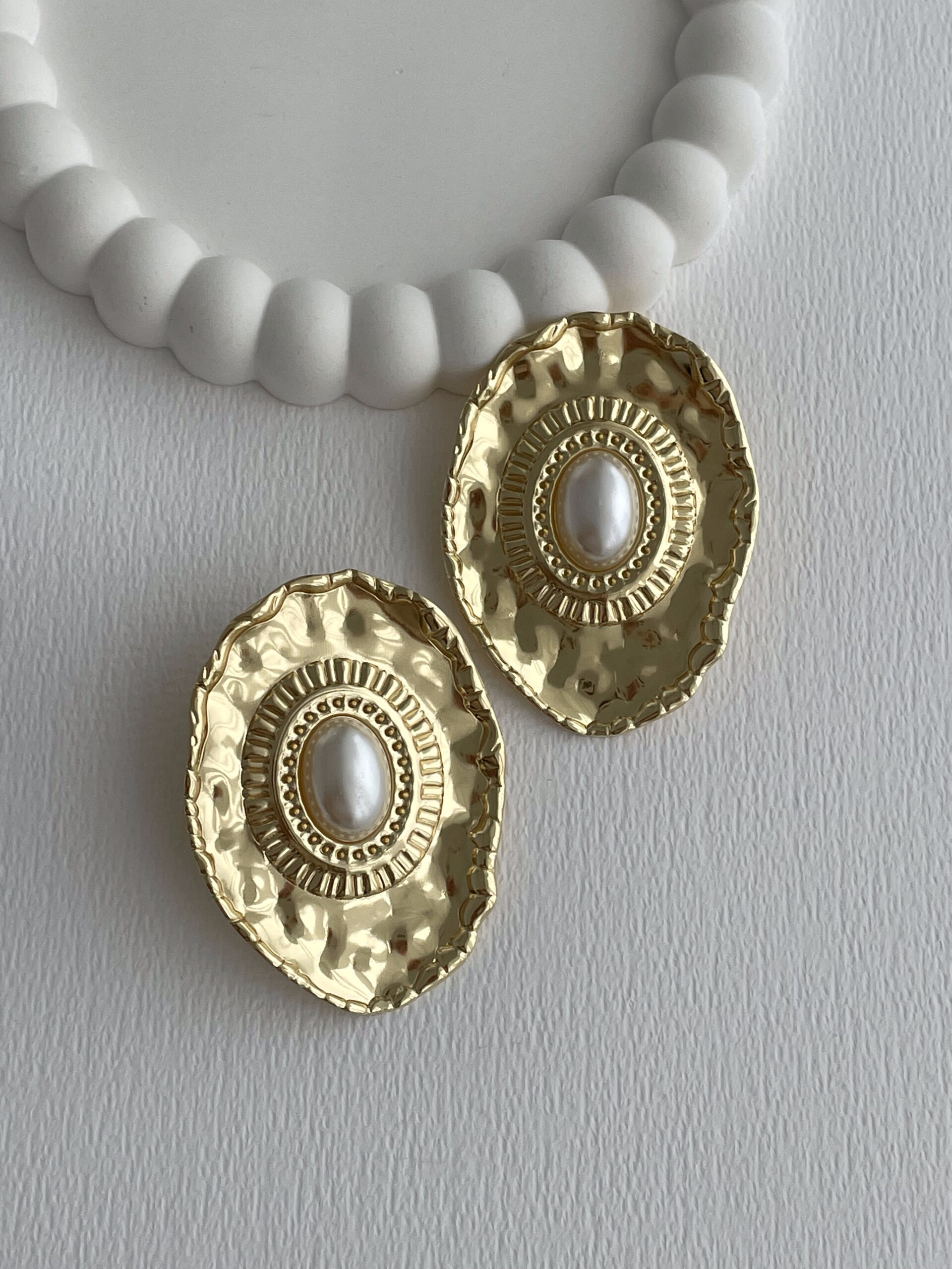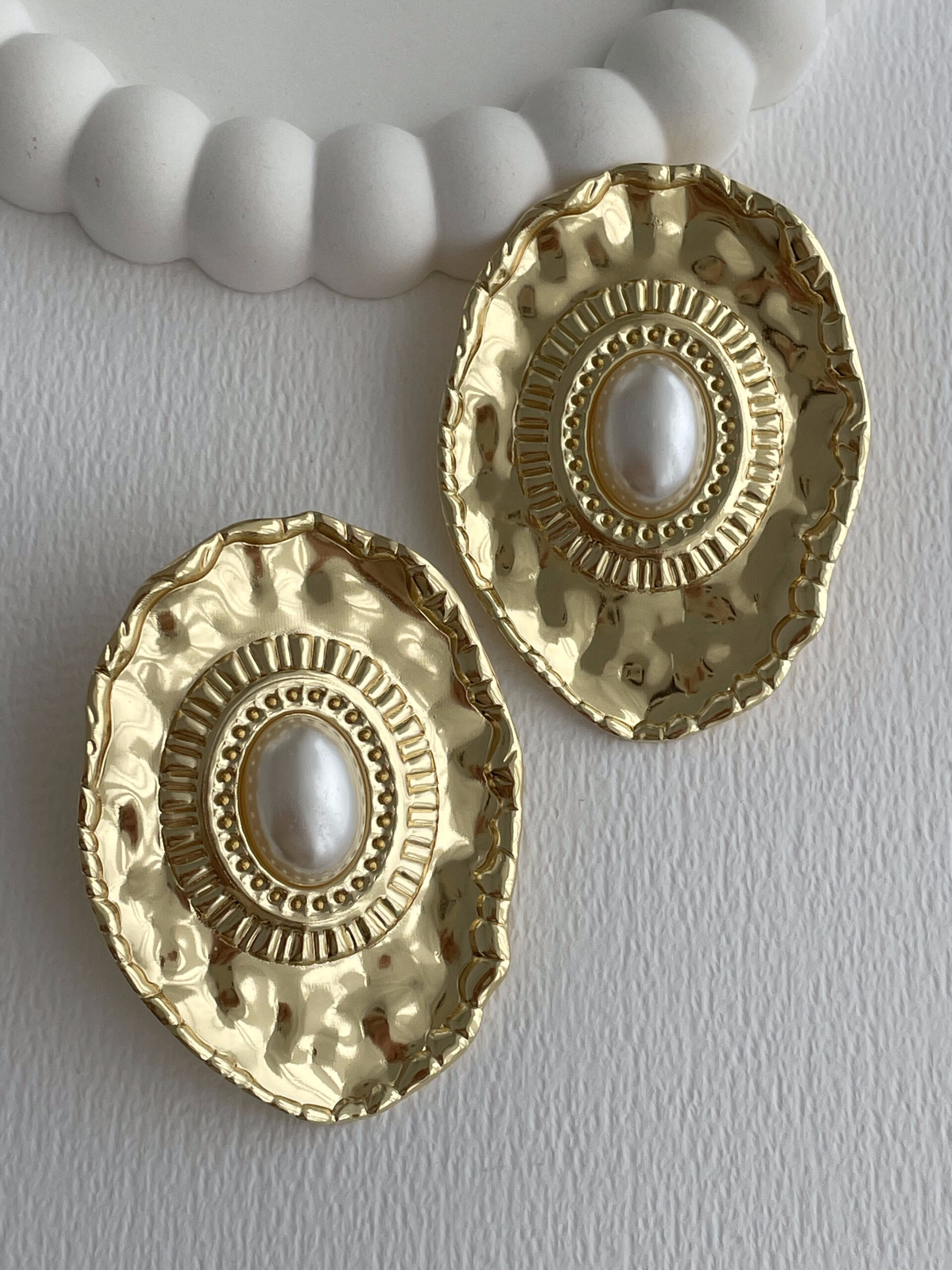 Özel Seri İnci Detay Desenli Oval Maksi Boy Gold Küpe
