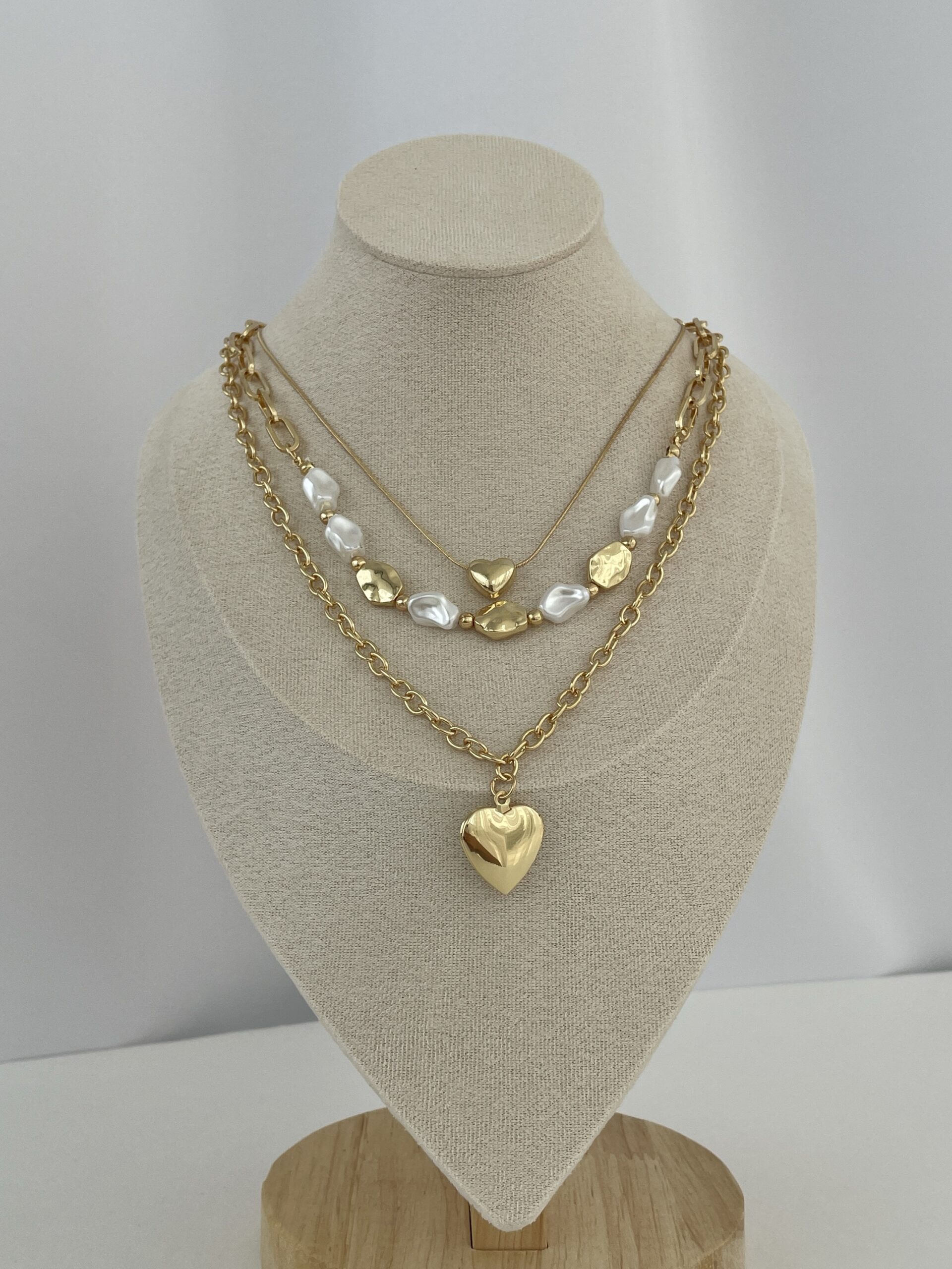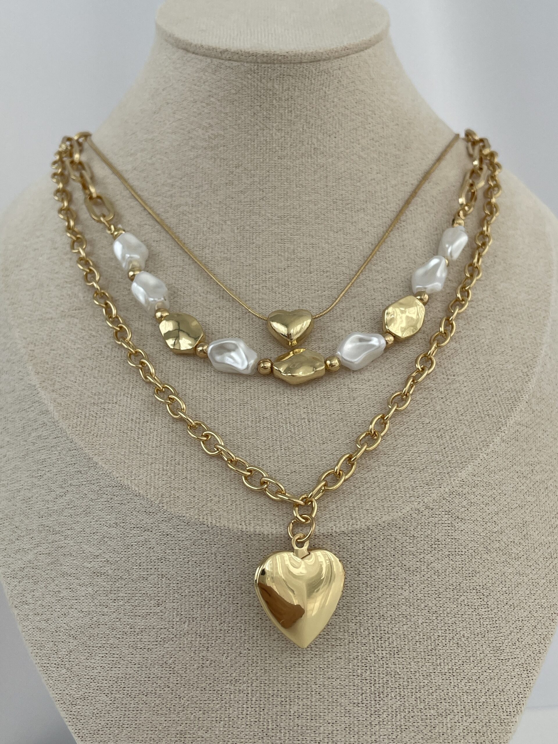 Özel Seri İnci Detay Kalp Tasarım Üçlü Zincir Gold Kolye