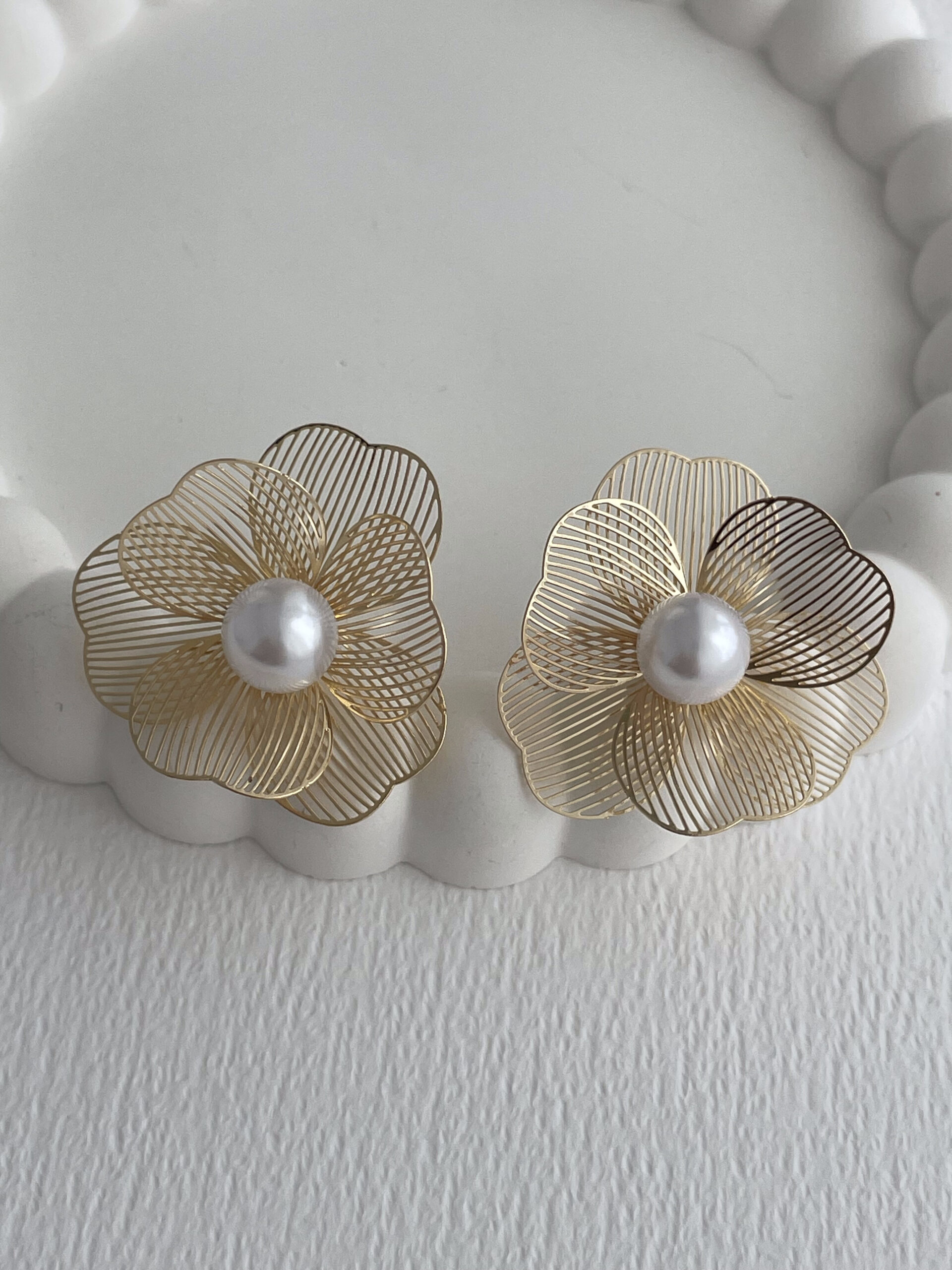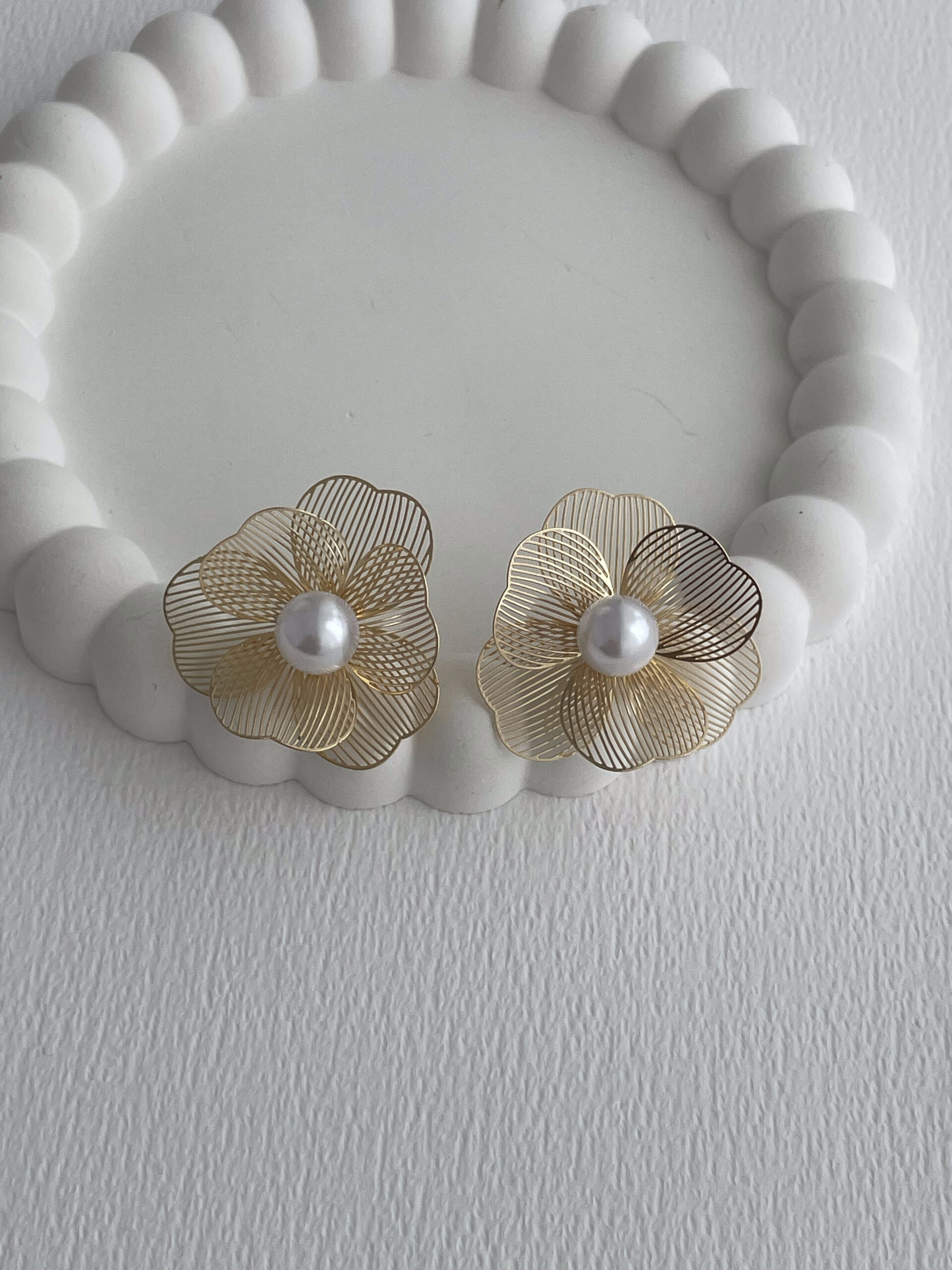 Özel Seri İnci Detay Tel Çiçek Tasarım Gold Küpe