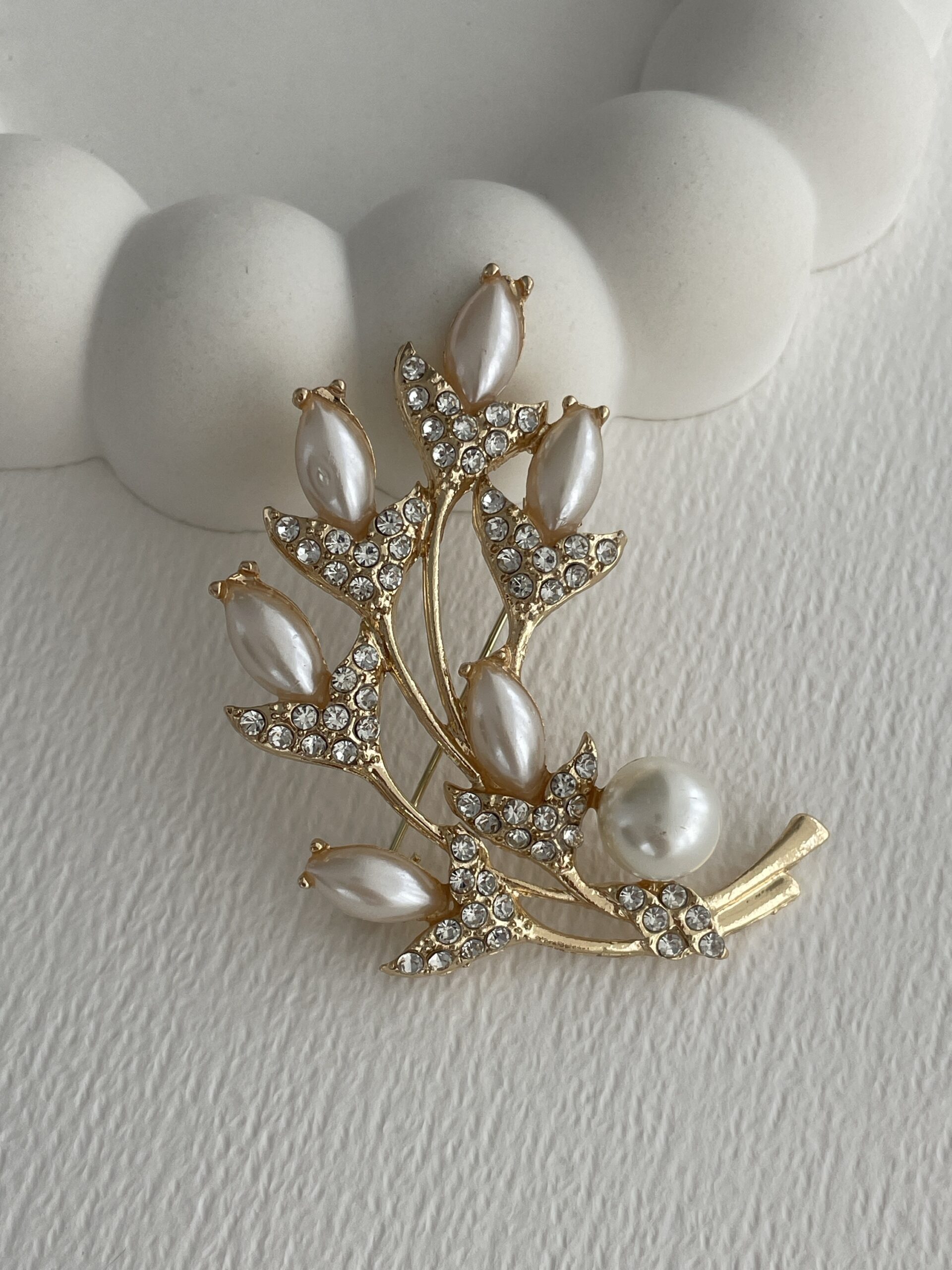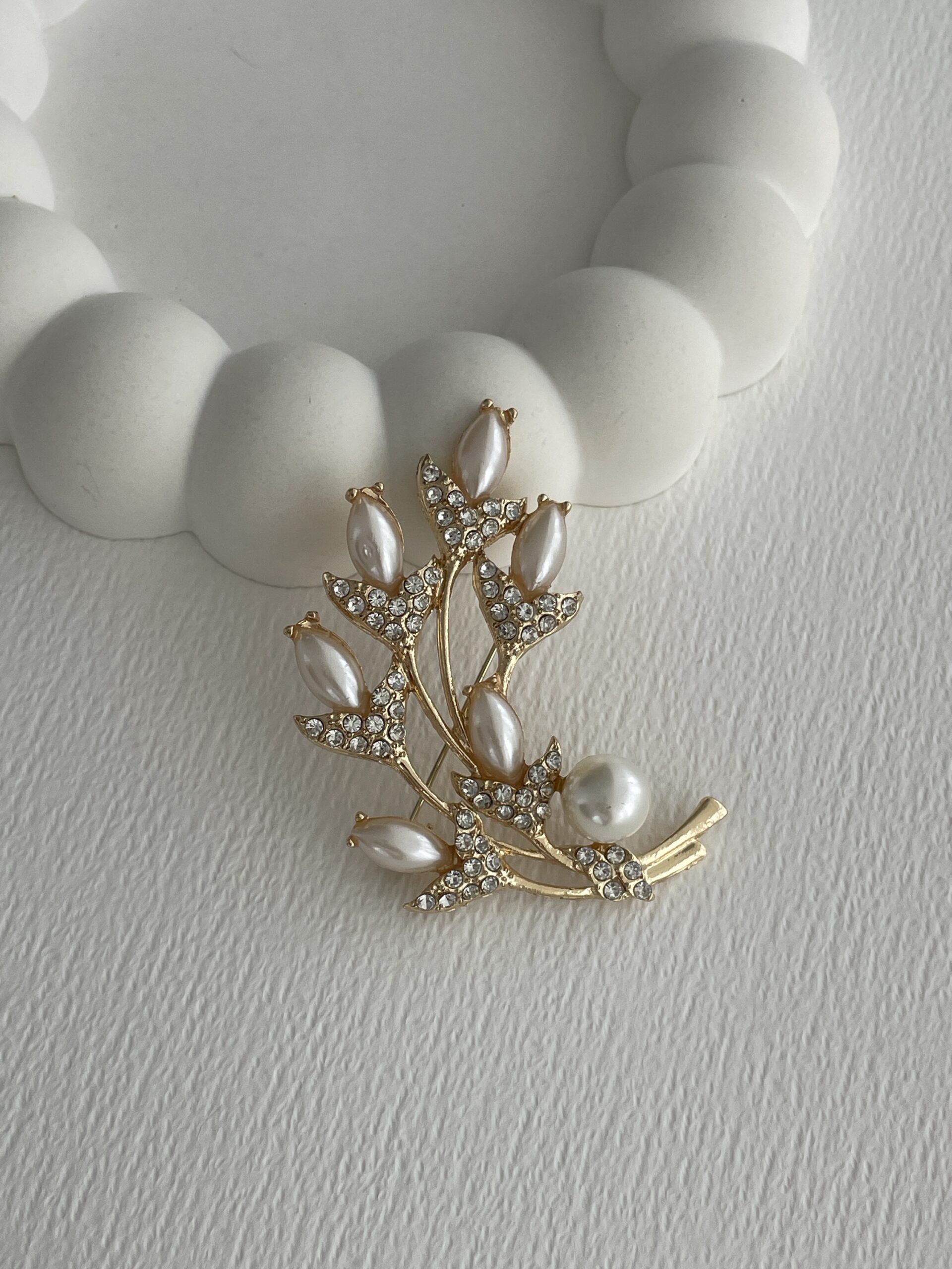 Özel Seri İnci & Zirkon Taşlı Yaprak Tasarım Gold Broş