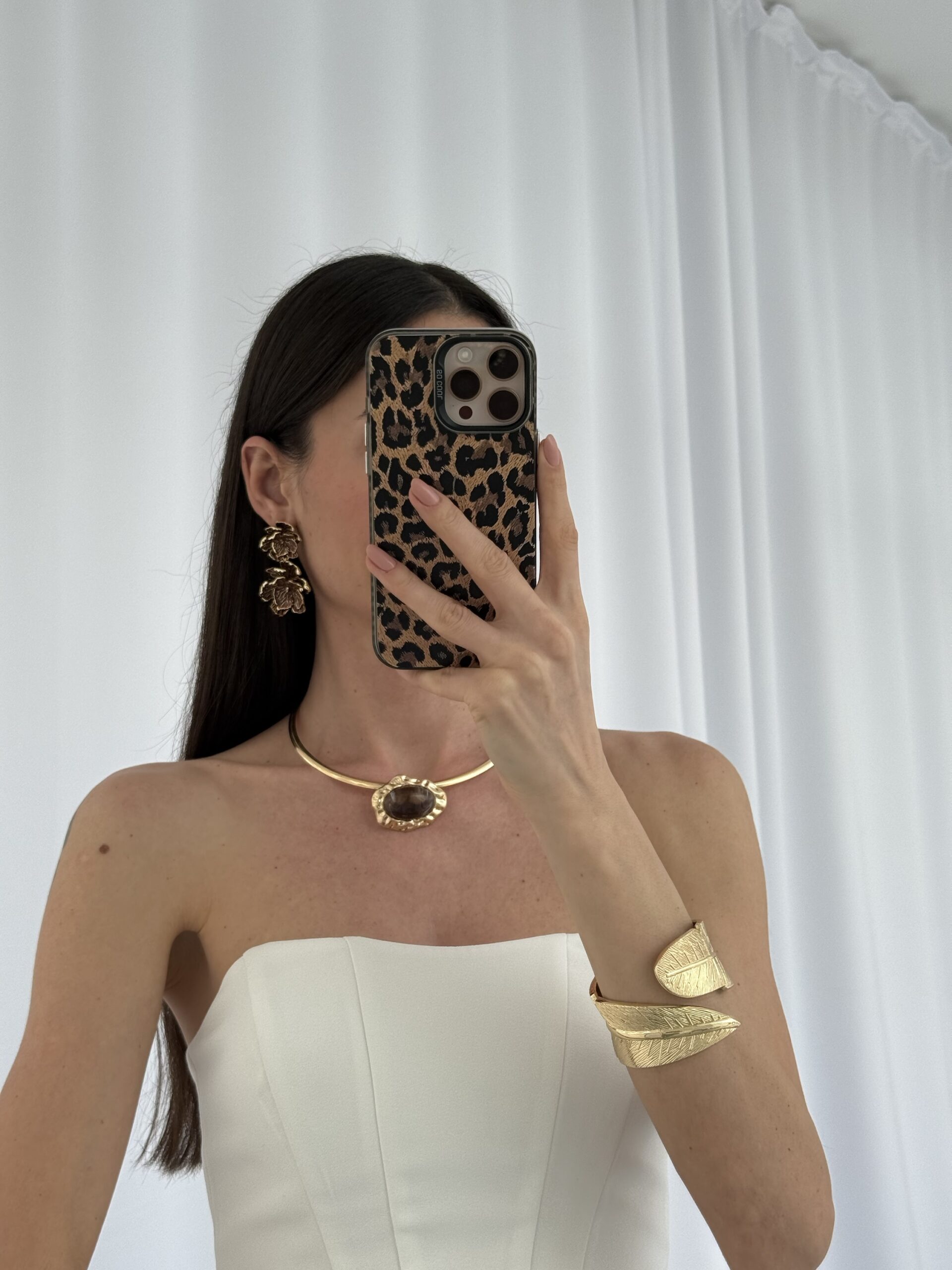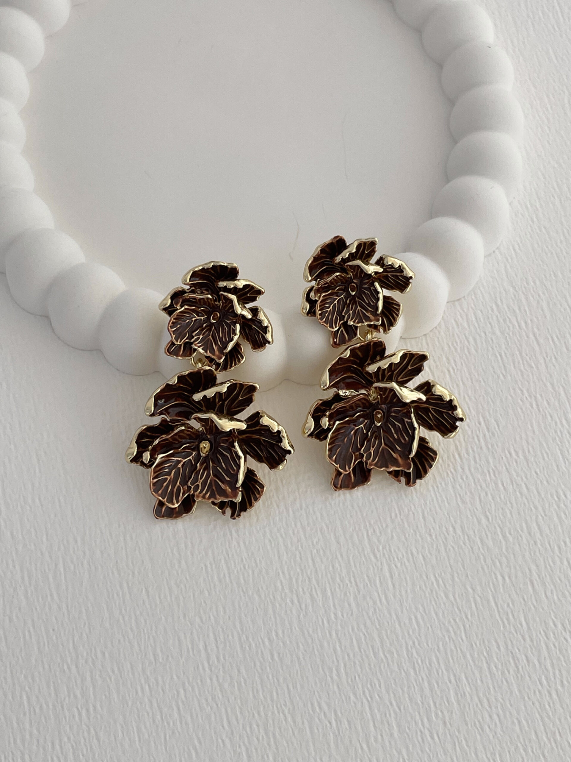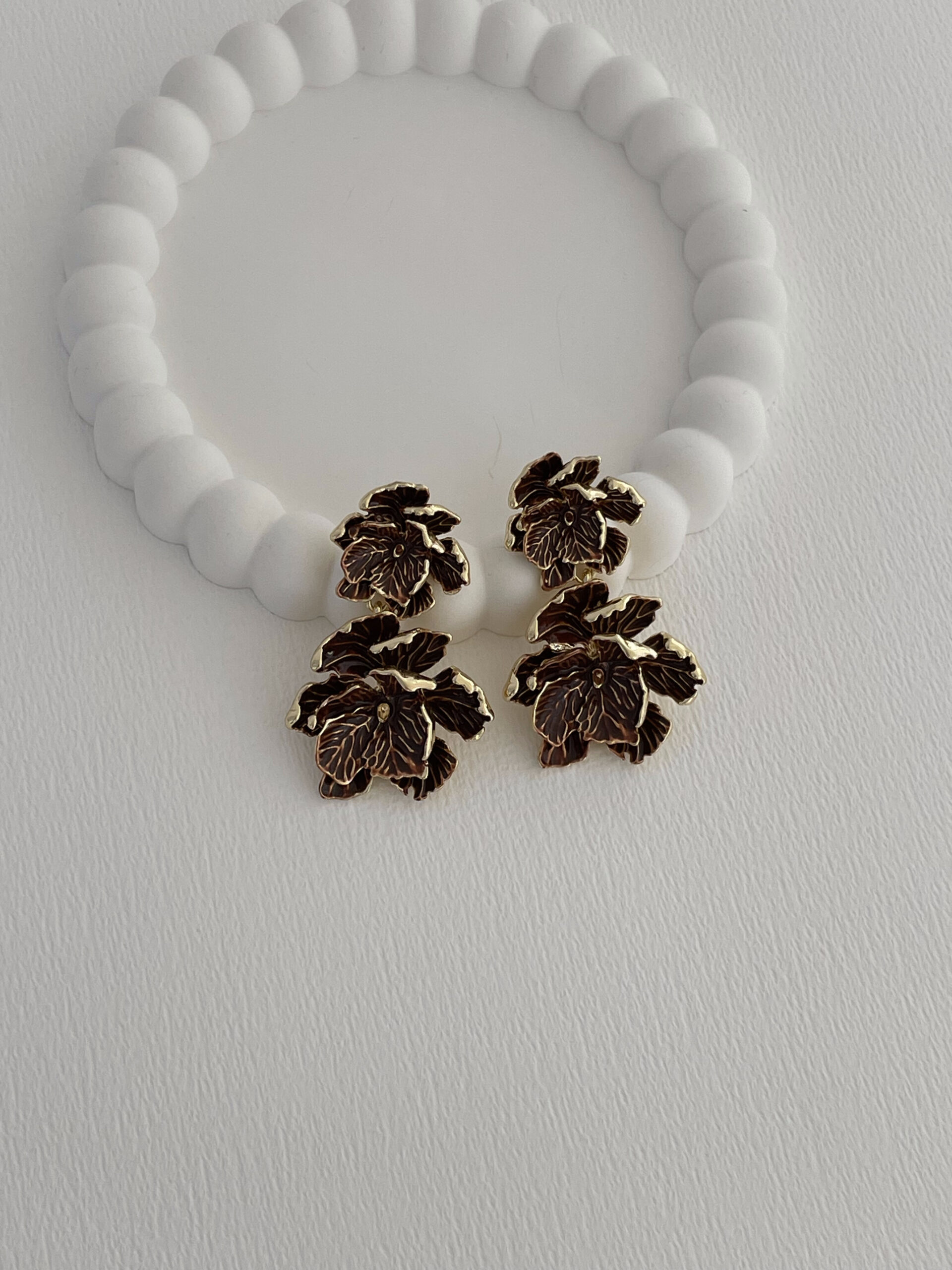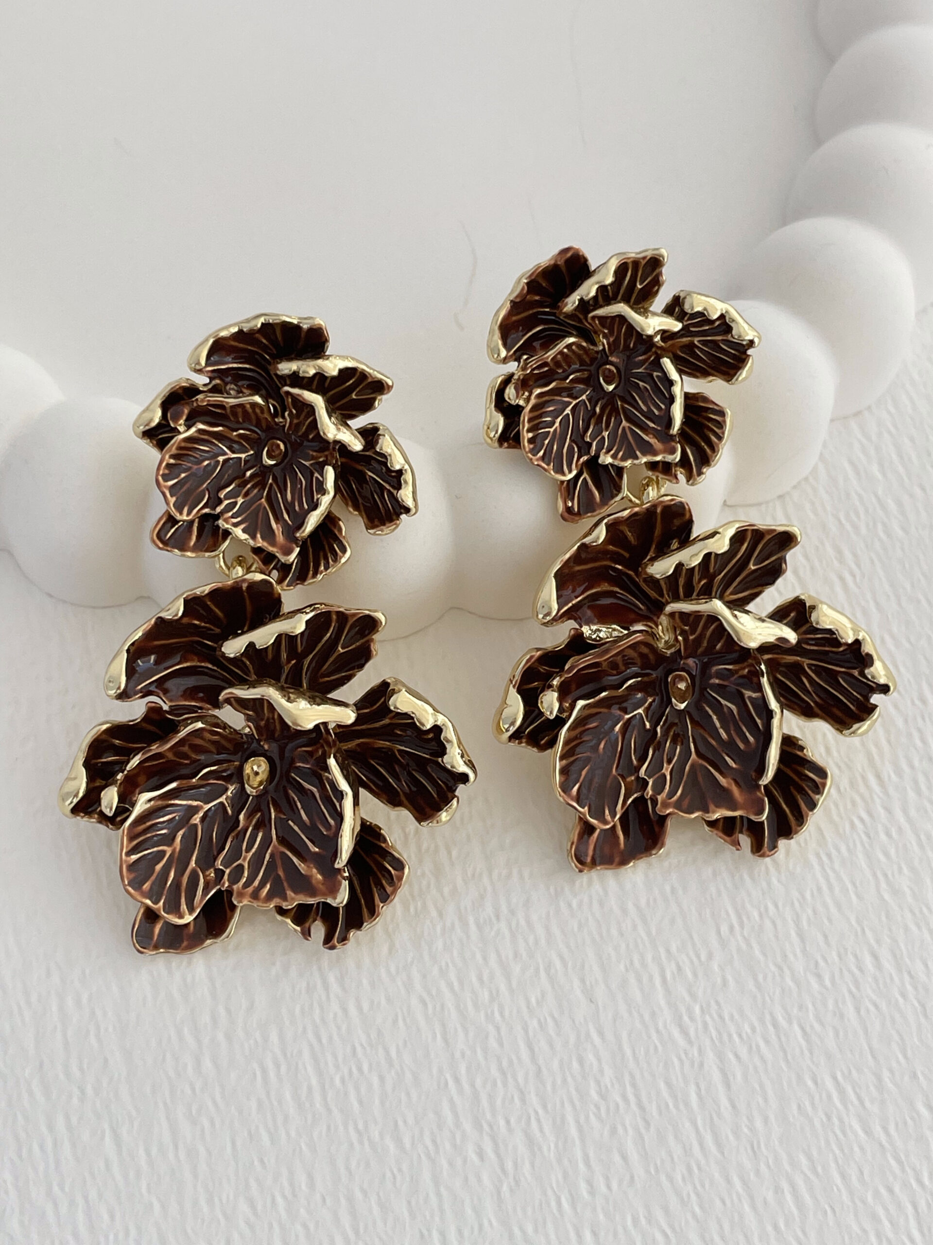 Özel Seri Kahverengi İkili Çiçek Tasarım Gold Küpe