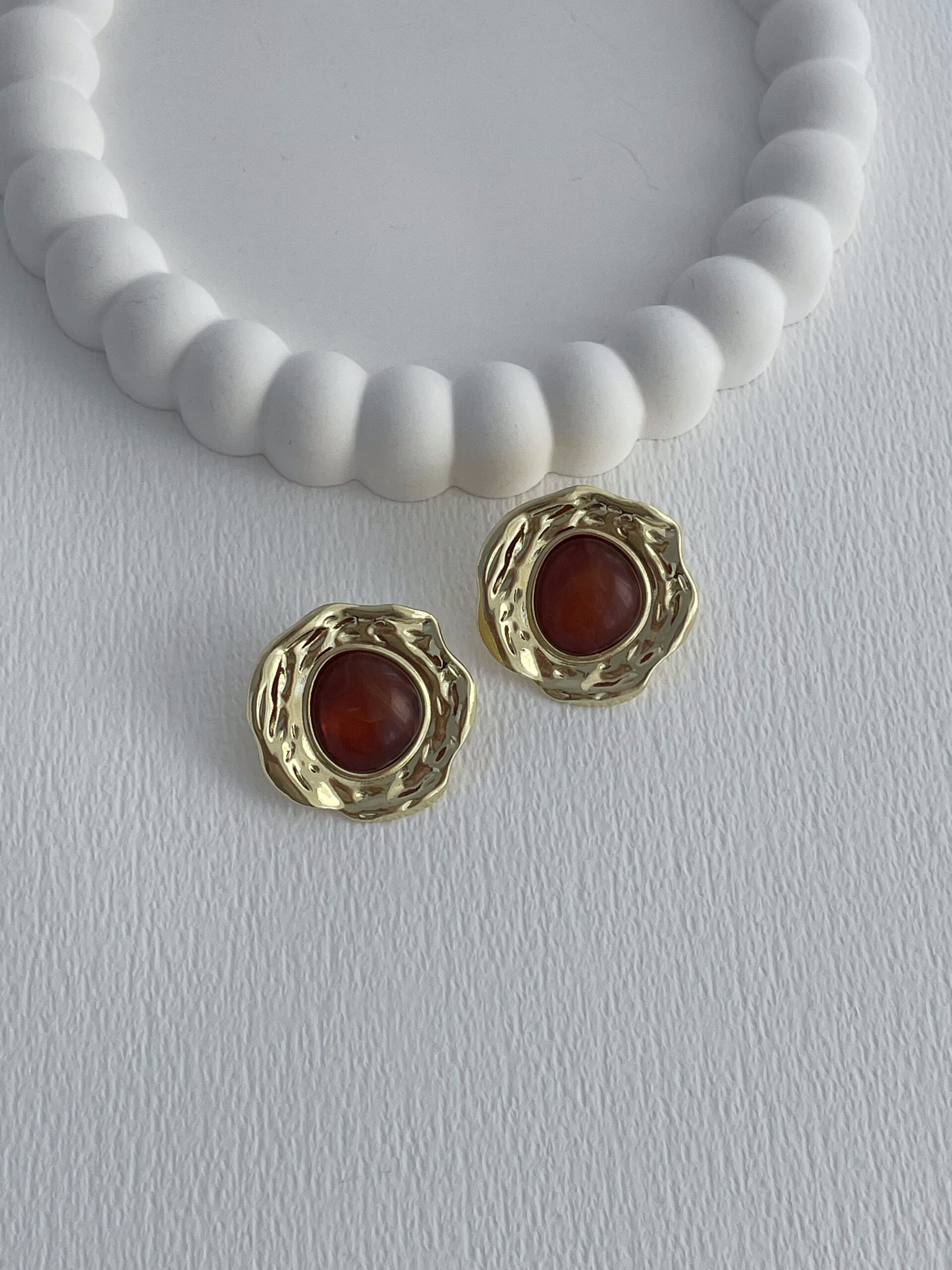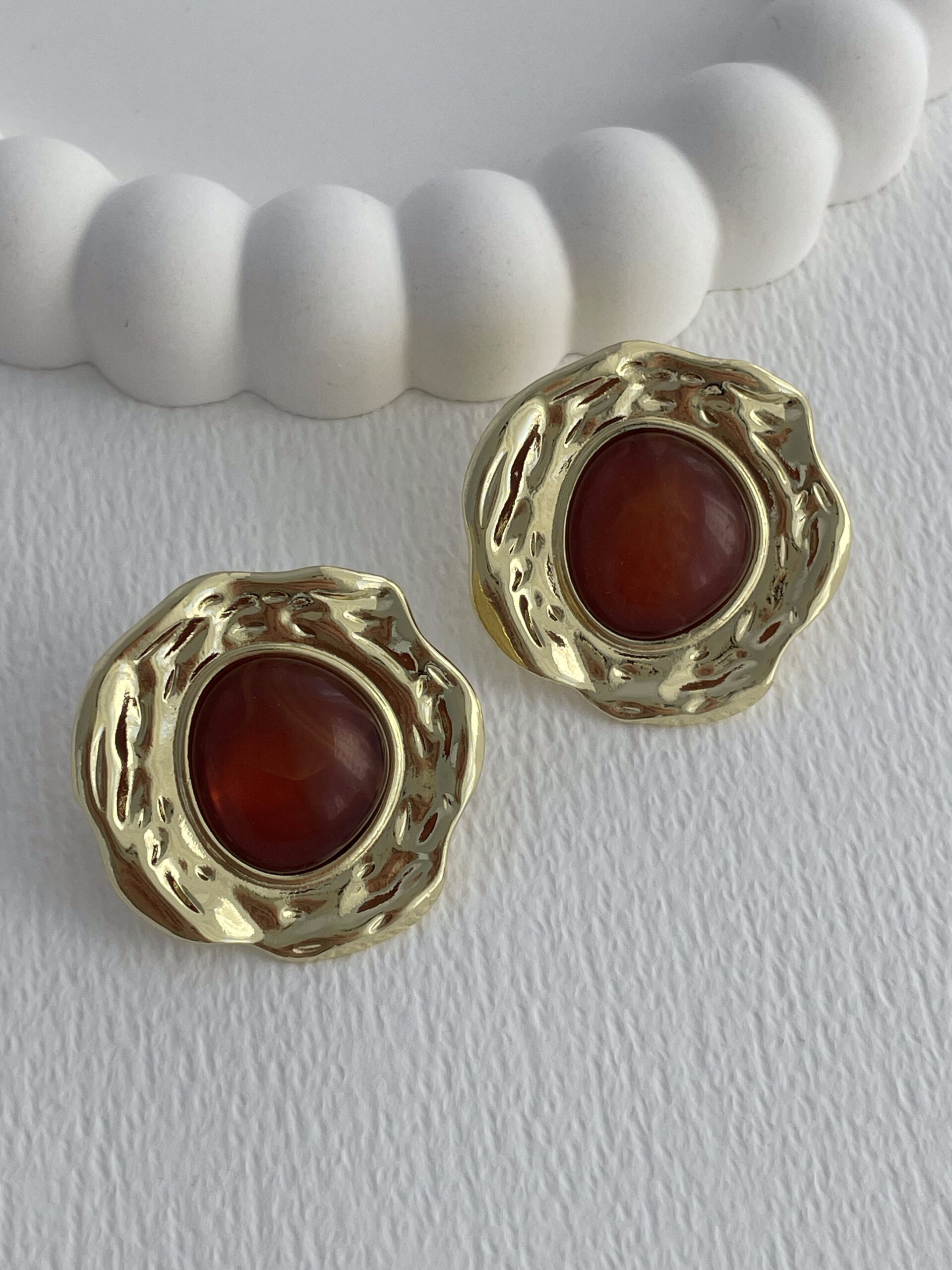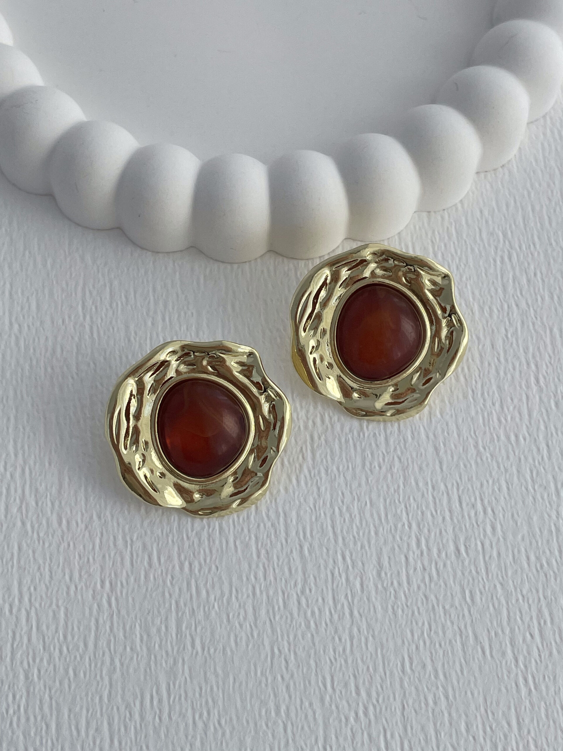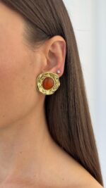 Özel Seri Kahverengi Taş Detay Yuvarlak Gold Küpe