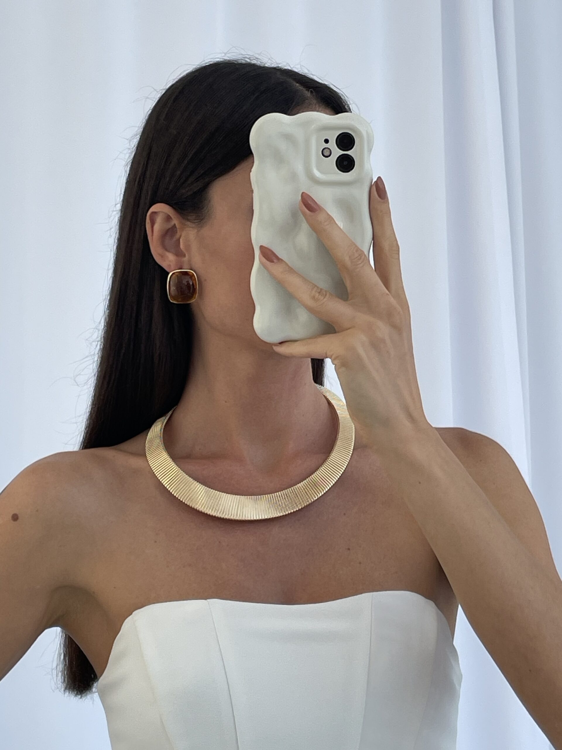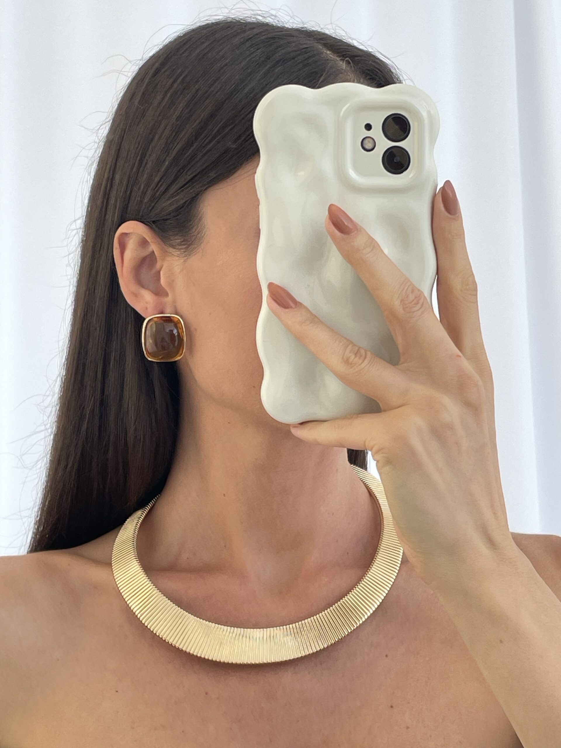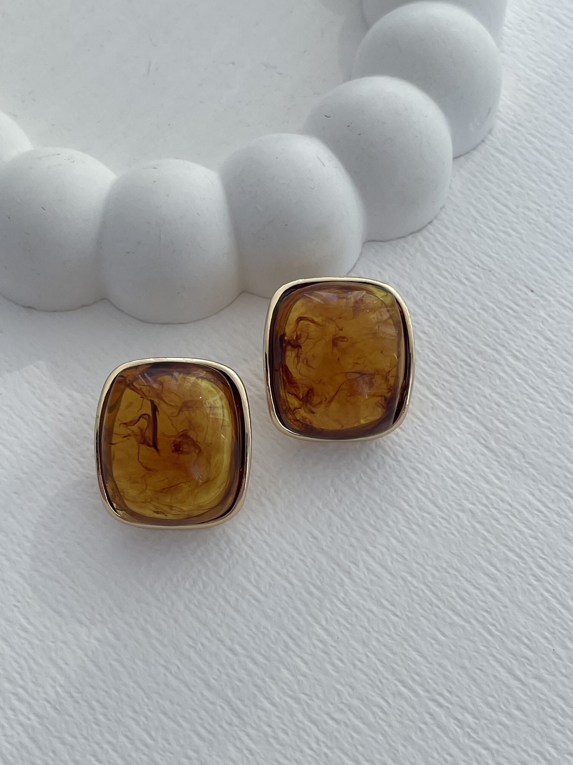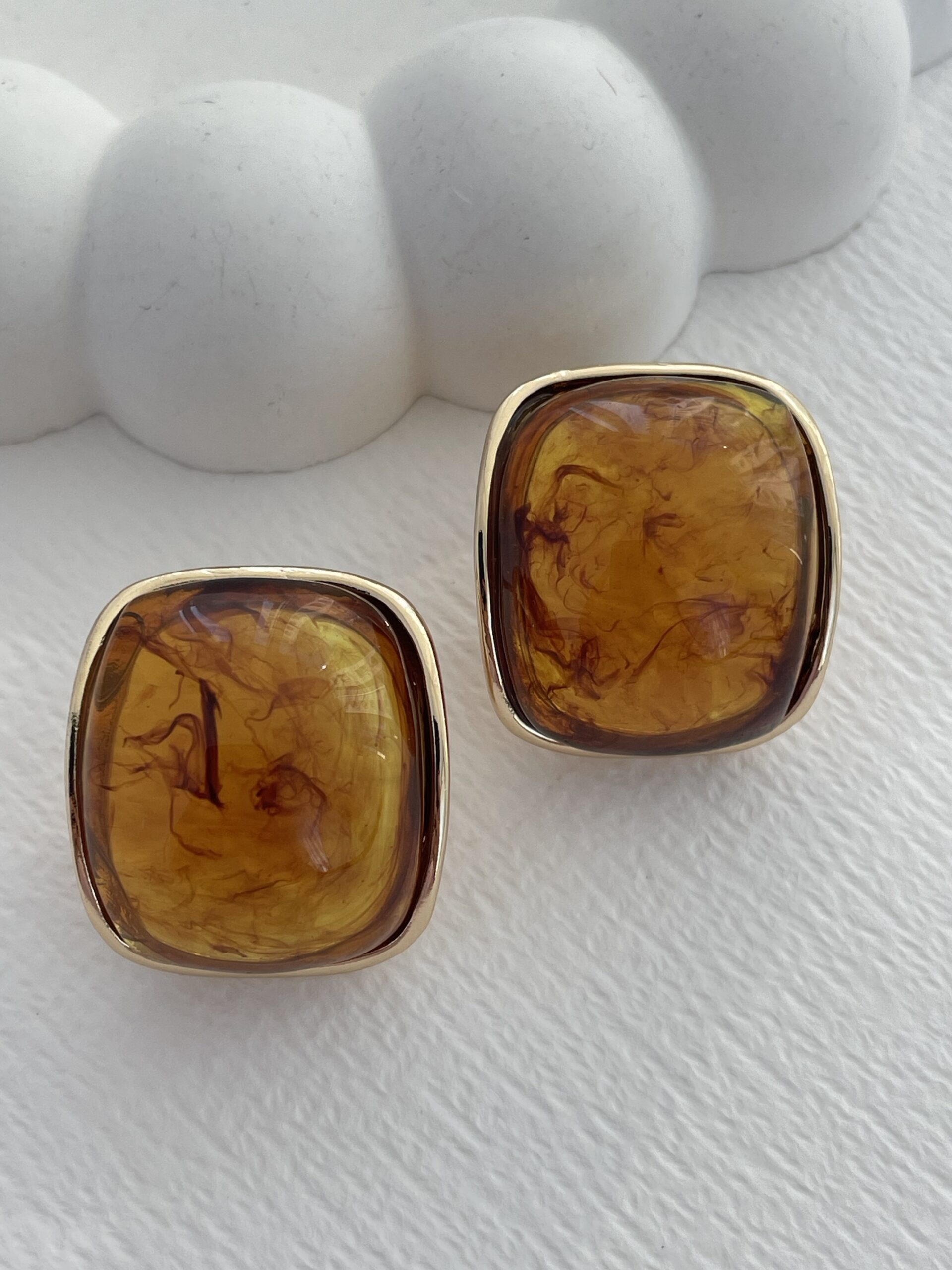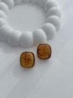 Özel Seri Kare Bombeli Kahverengi Mineli Gold Küpe