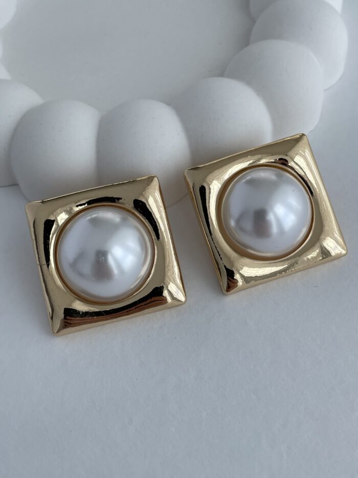 Özel Seri Kare Tasarım Gold İnci Küpe