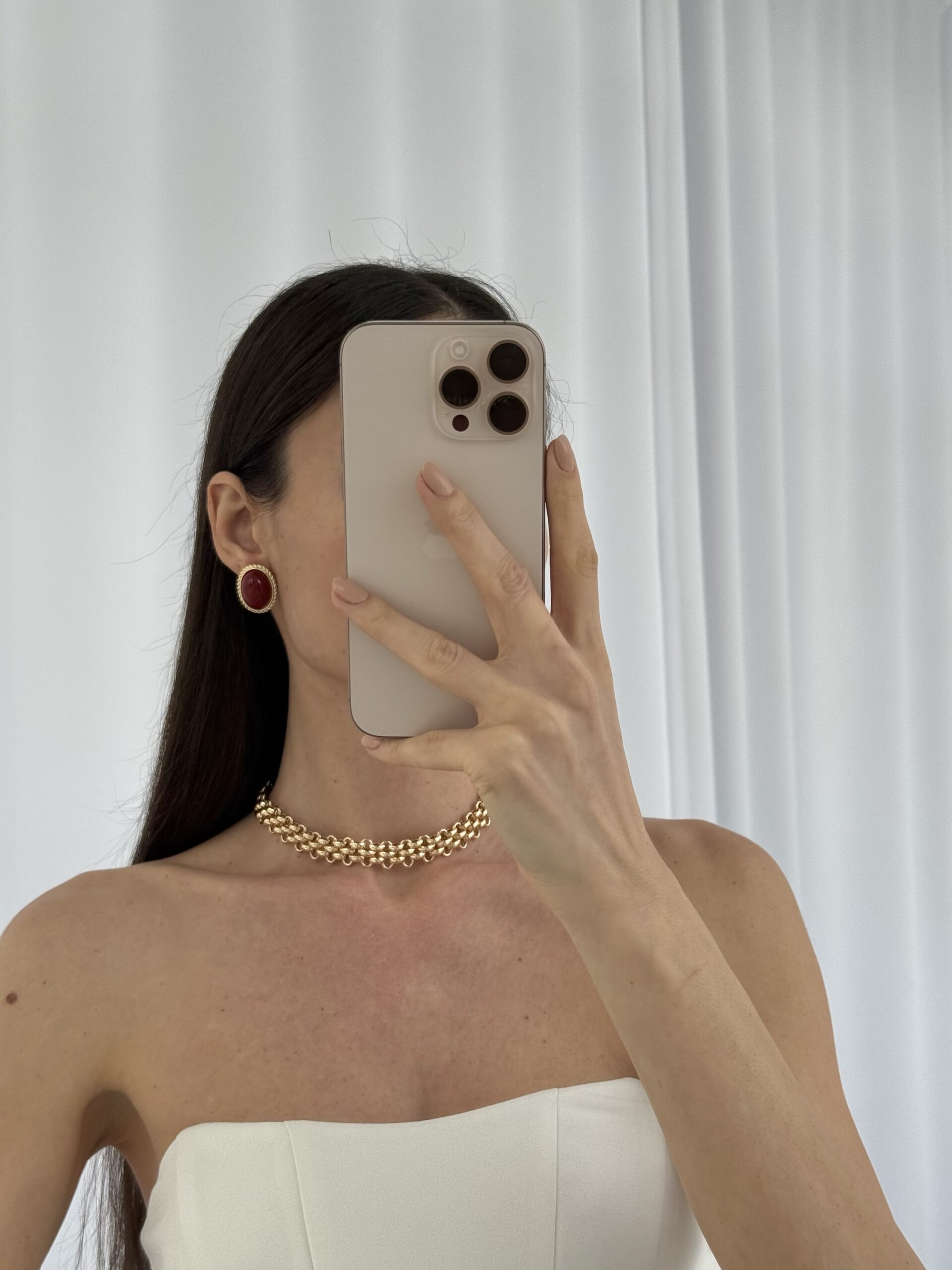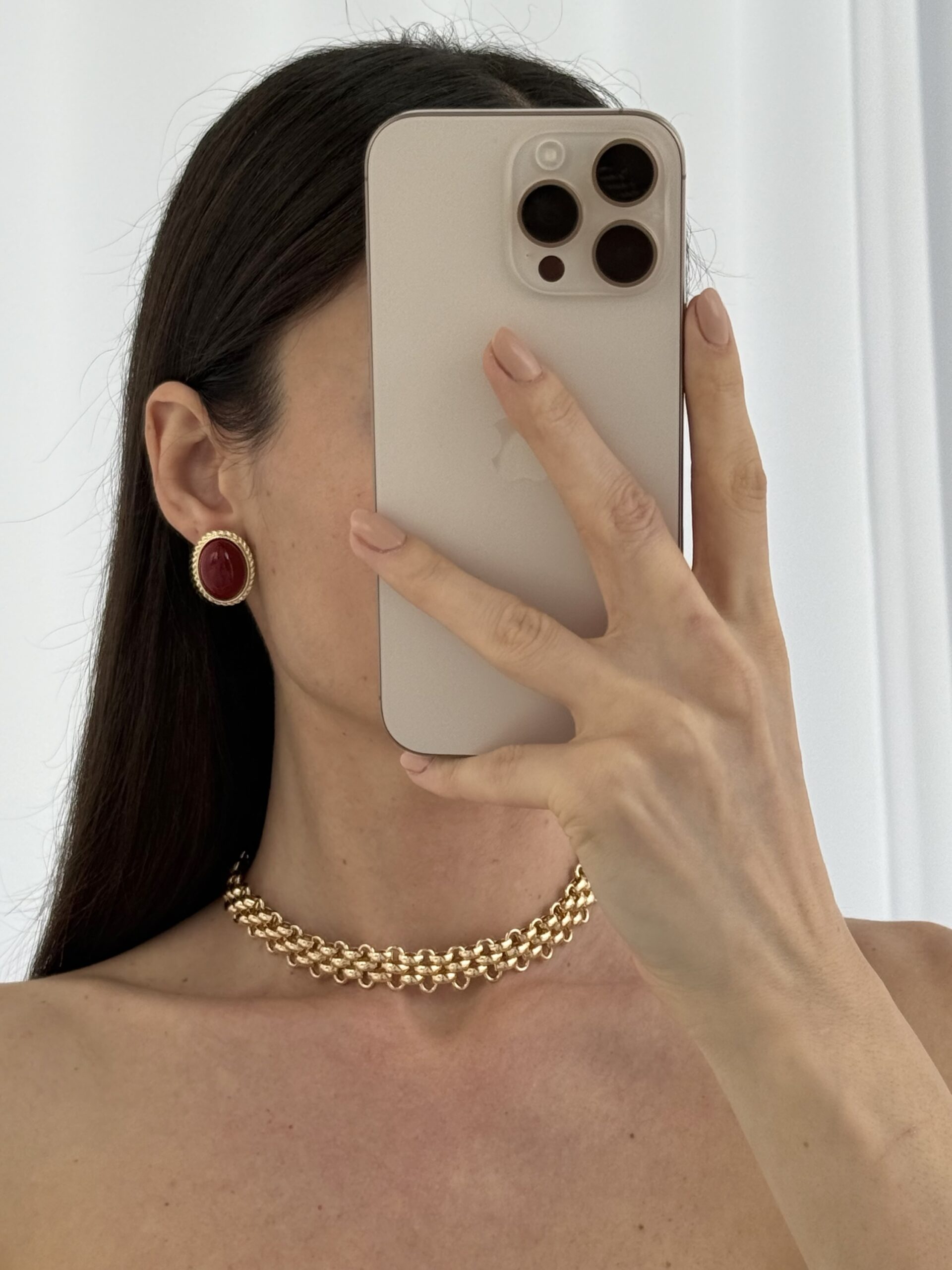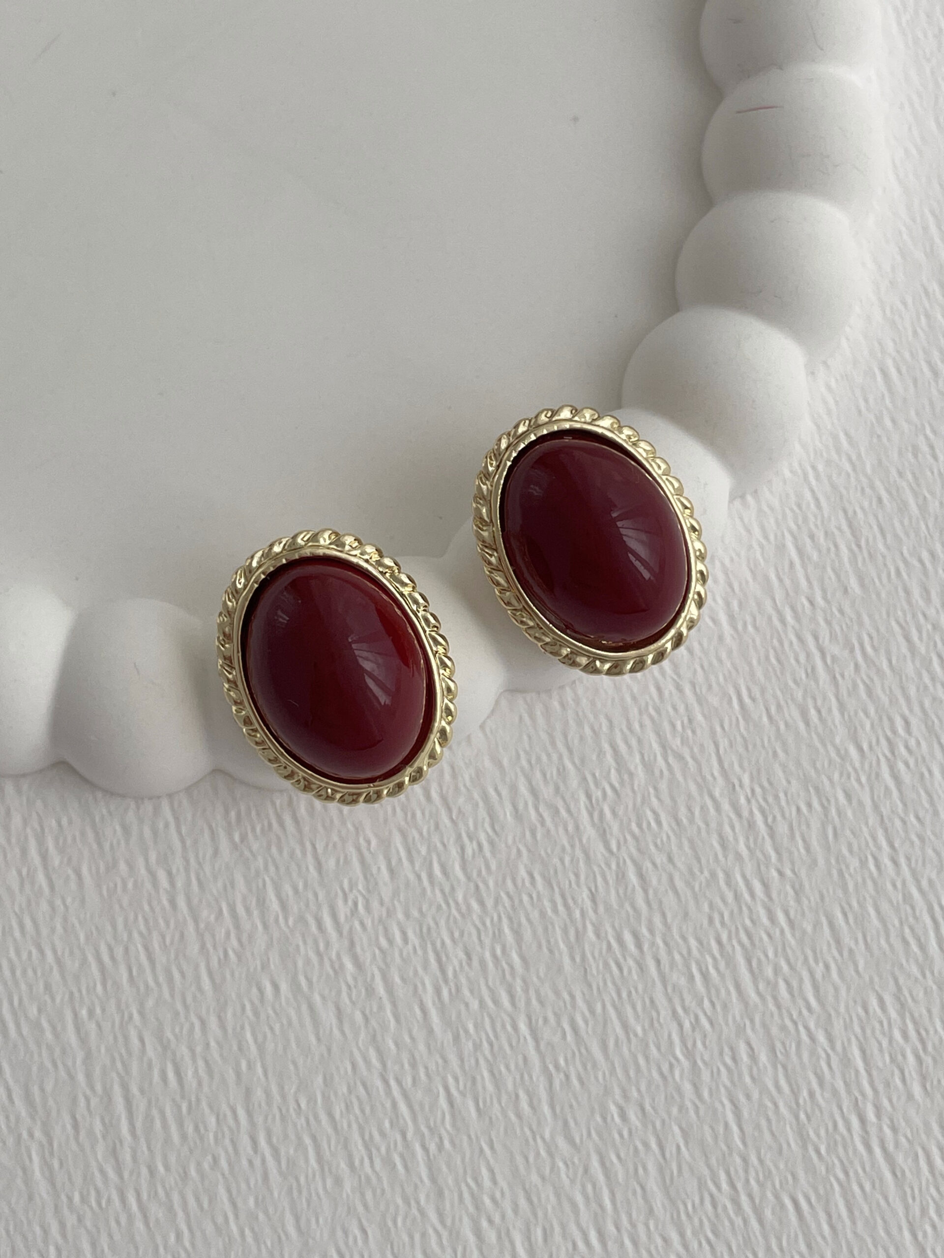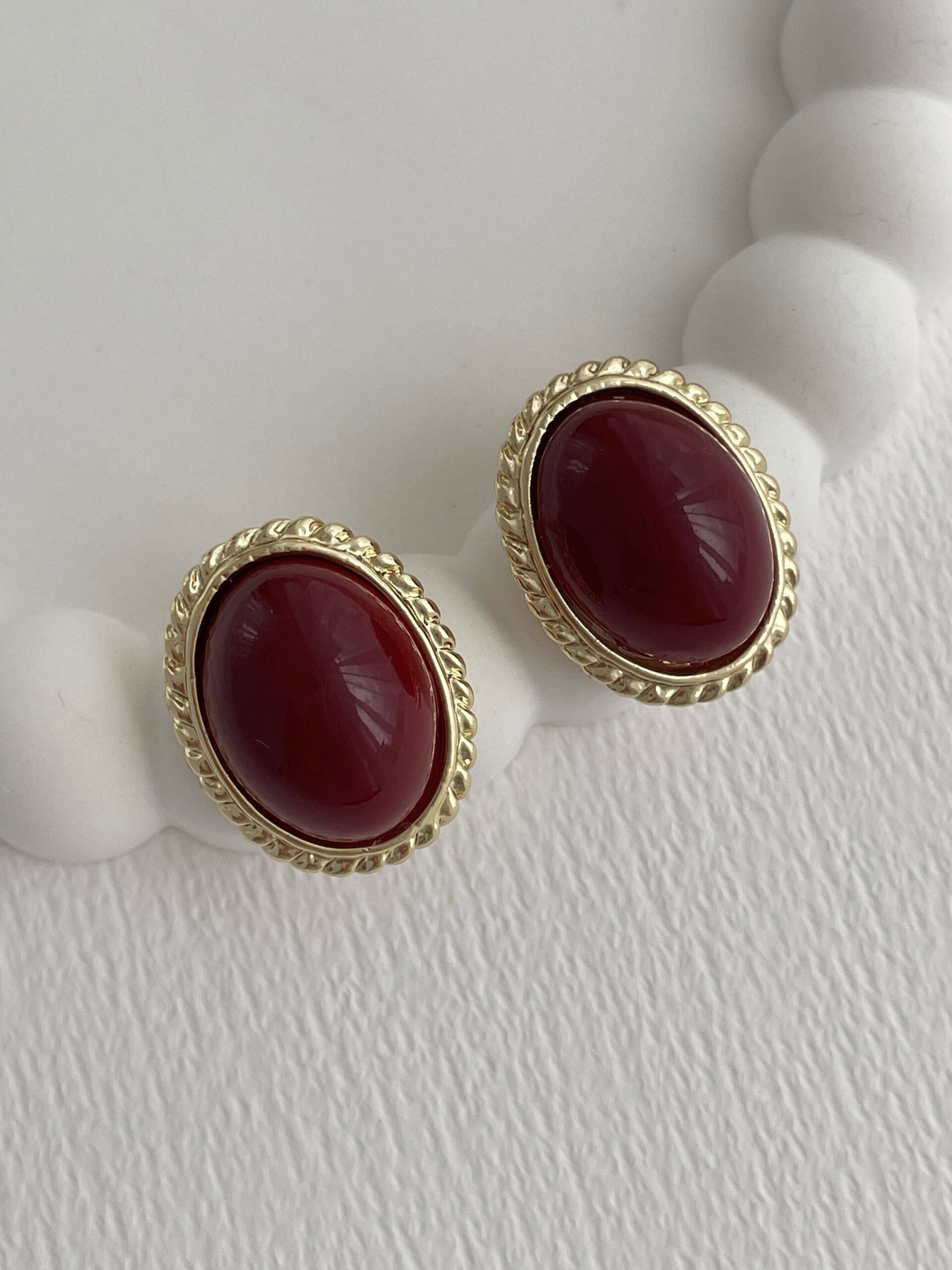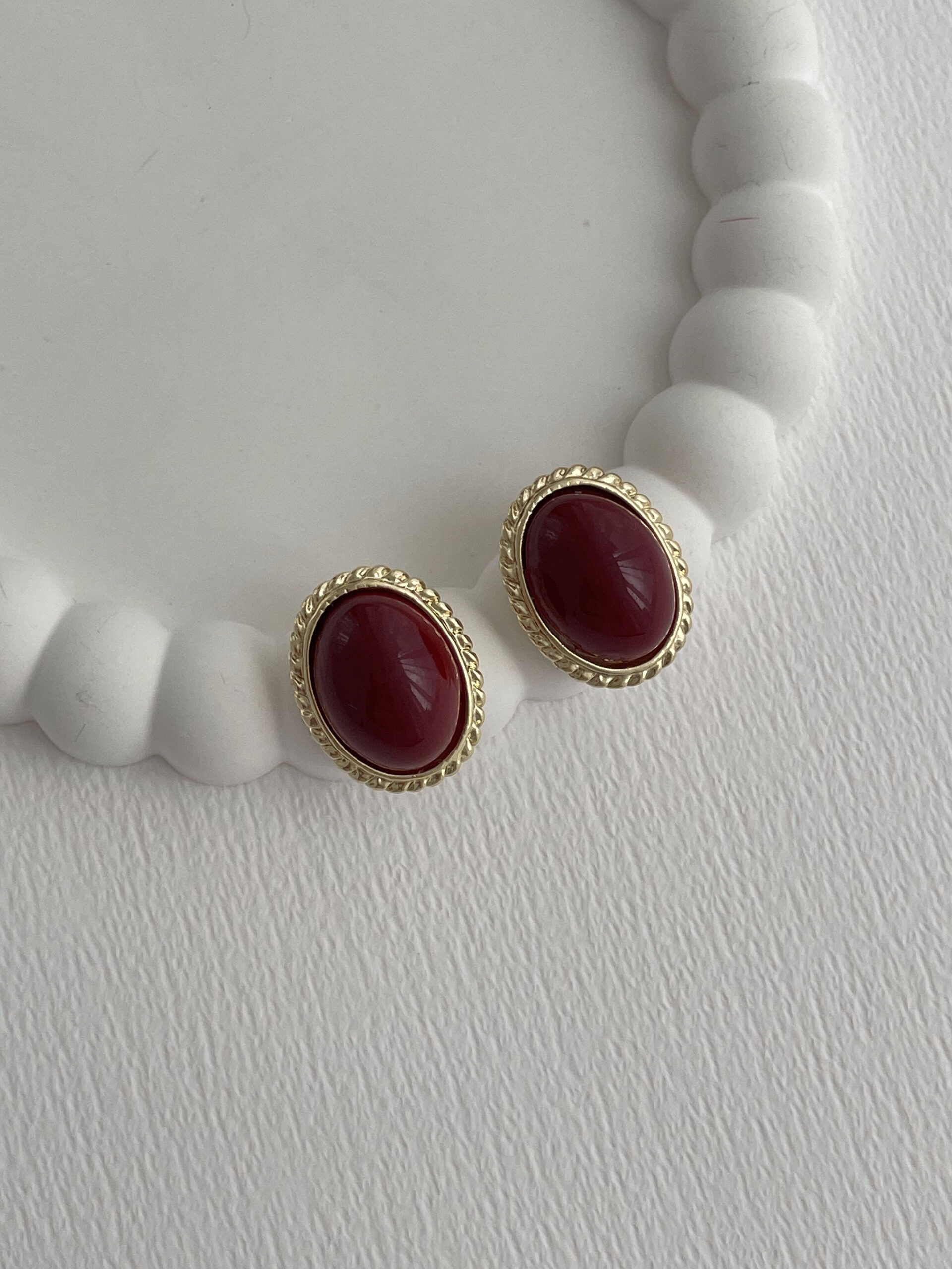 Özel Seri Kenarları Kıvrımlı Bordo Mineli Gold Top Küpe