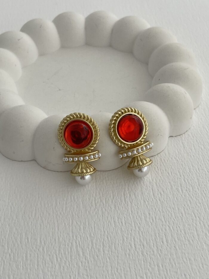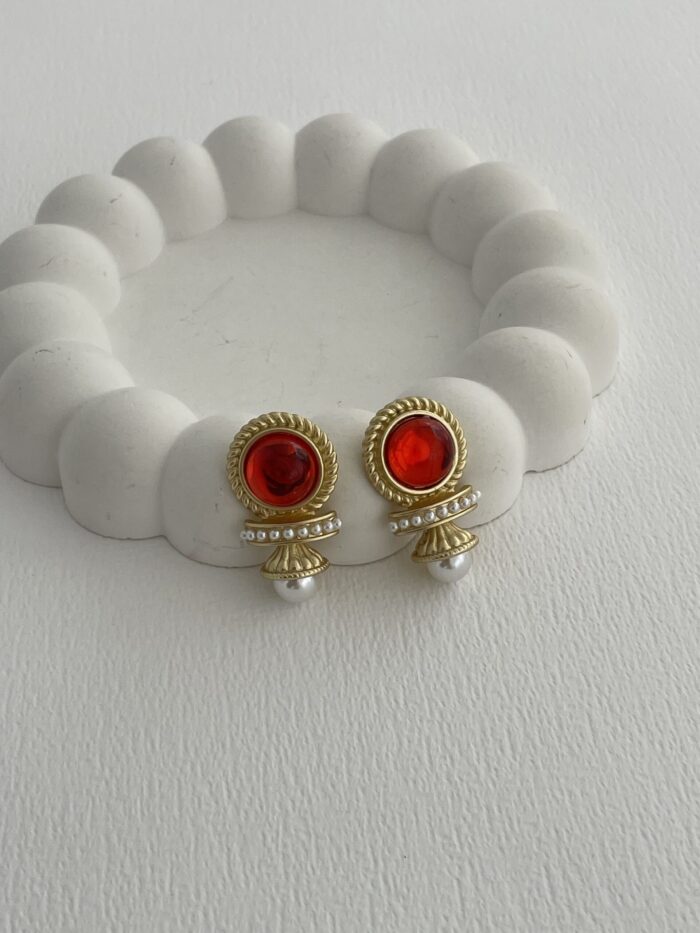 Özel Seri Kırmızı Opal Taş Gold Vintage İnci Küpe